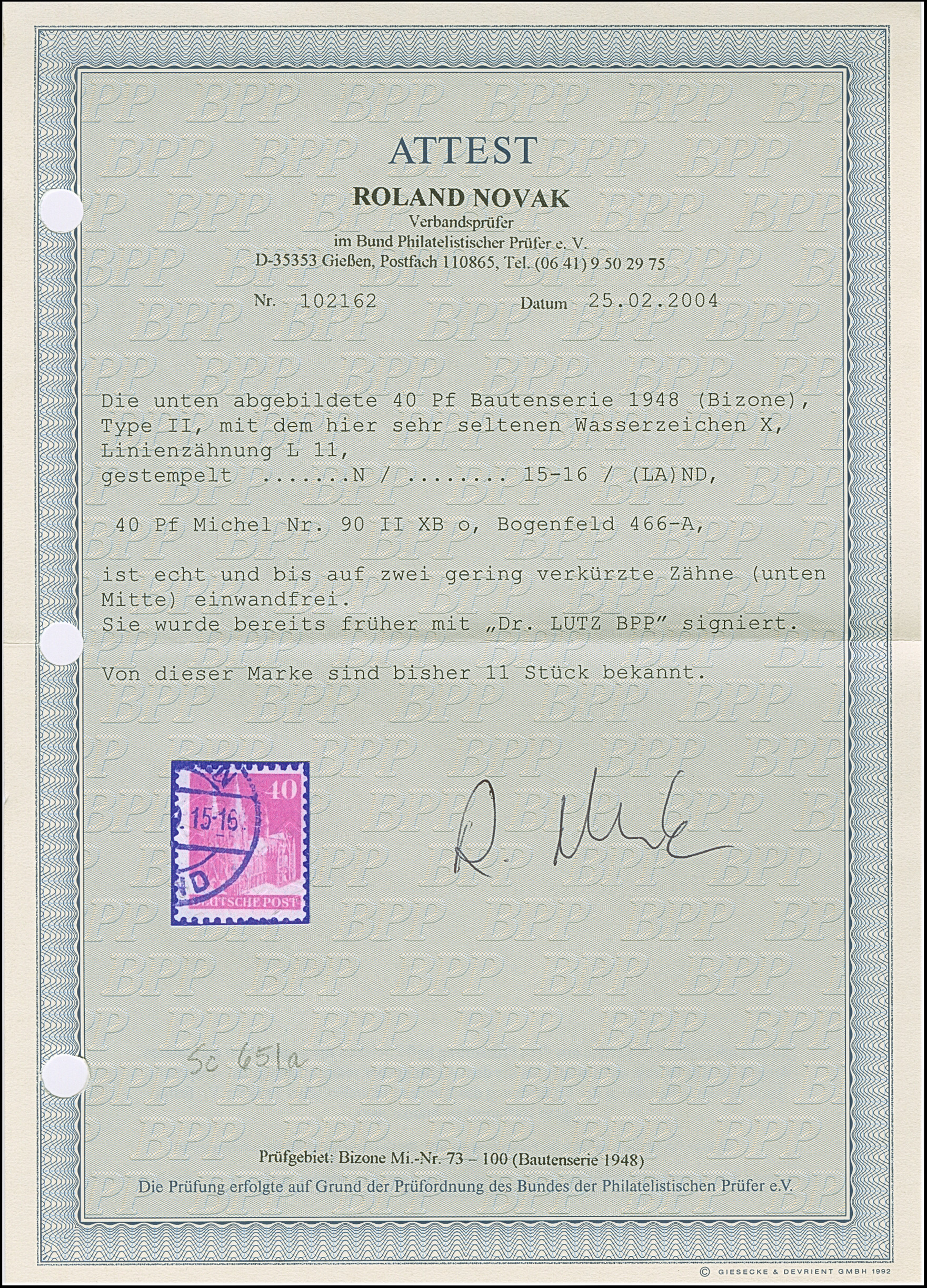 40 Pfg. rotviolett, Type II, gezähnt L 11 und mit Wasserzeichen 1X (Bogenfeld 466-A), sauber gestempelt mit gering verkürzten Zähnen, ansonsten in einwandfreier Erhaltung. Ein schönes Exemplar dieser seltenen Variante, signiert Dr. Lutz BPP und Fotoattest Novak BPP (2004)