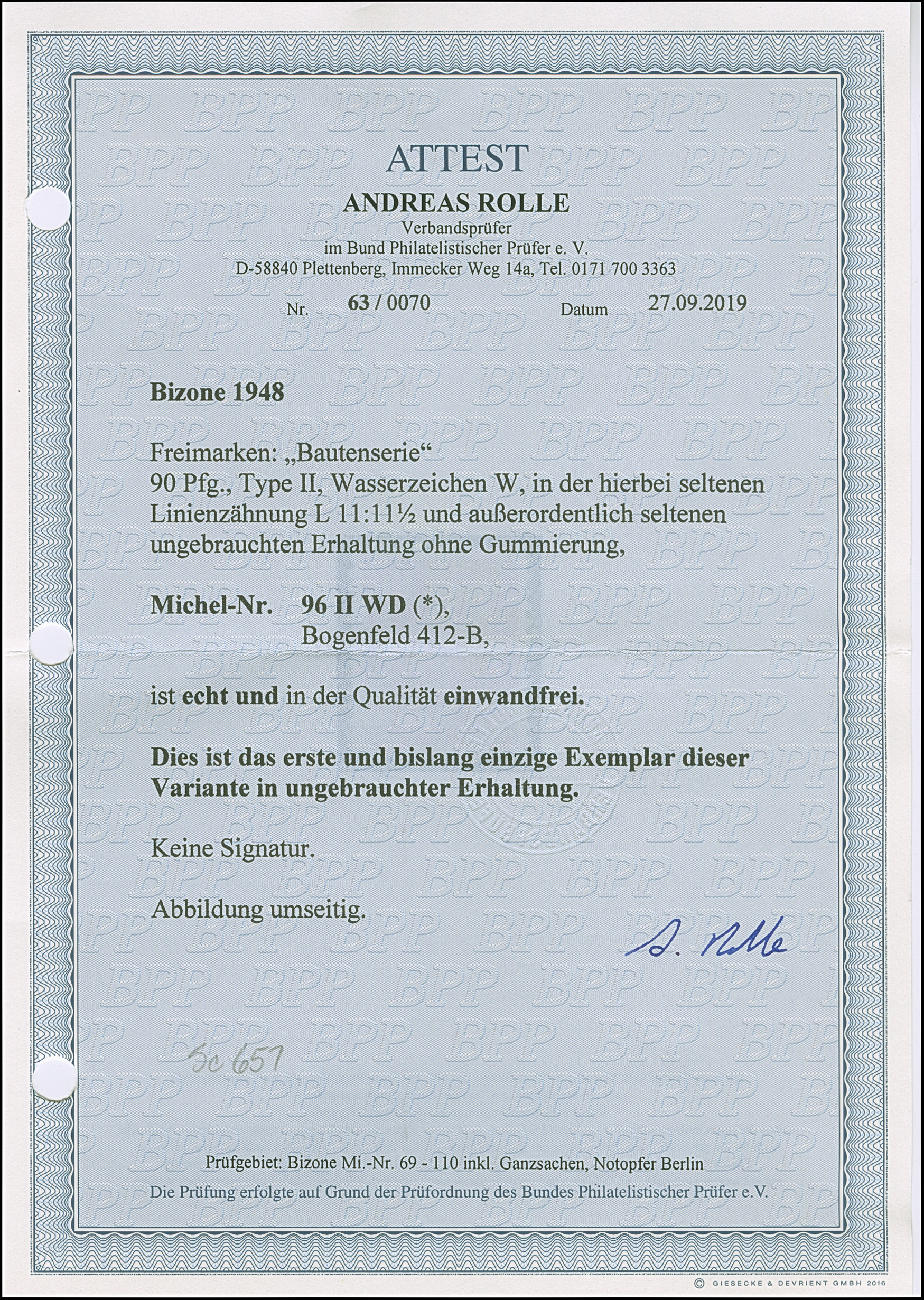 90 Pfg. lilapurpur, Type II, gezähnt L 11 : 11½ und mit Wasserzeichen 1W (Bogenfeld 412-B), ungebraucht ohne Gummierung und in tadelloser Erhaltung. Eine der ganz großen Bauten-Seltenheiten, bisher ist kein weiteres ungebrauchtes Exemplar dieser Marke bekannt, Fotoattest Rolle BPP (2019)