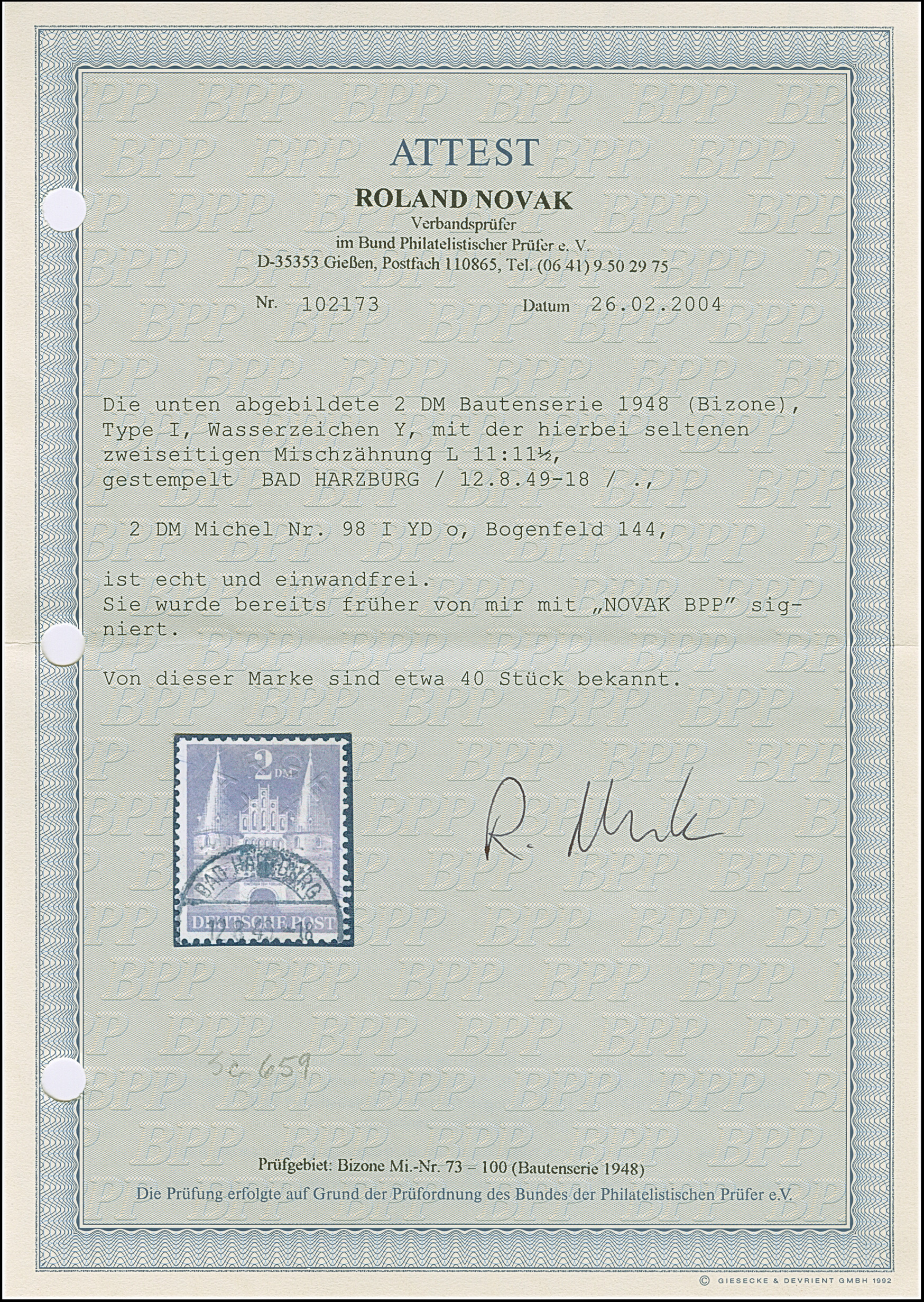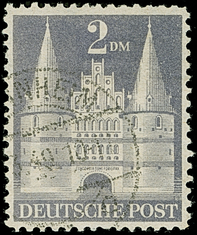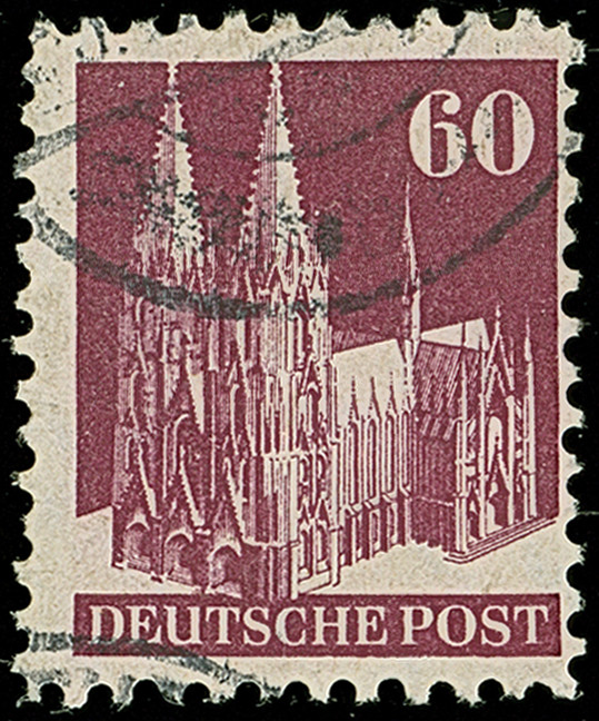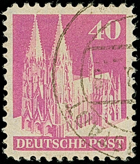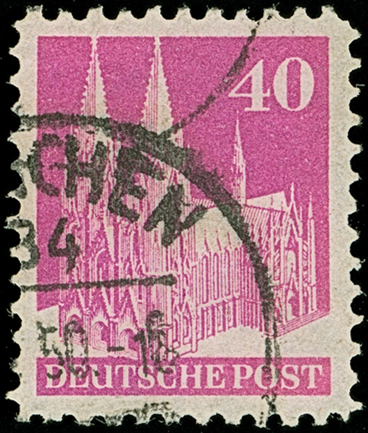 2 M. grauviolett, Type 1, gezähnt L 11 : 11 : 11 : 11½ und mit Wasserzeichen 1Y (Bogenfeld 410), sauber gestempelt mit drei verkürzten Zähnen oben rechts, ansonsten in guter Erhaltung. Ein optisch sehr ansprechendes Exemplar dieser Bauten-Seltenheit, bisher sind nur sieben Marken bekannt, signiert Arge Bauten und Salomon sowie Fotoattest Rolle BPP (2019)