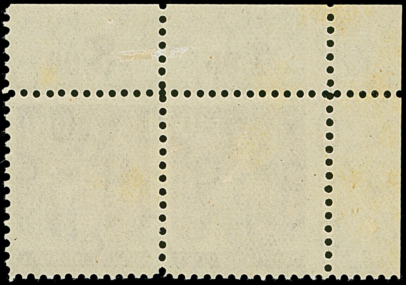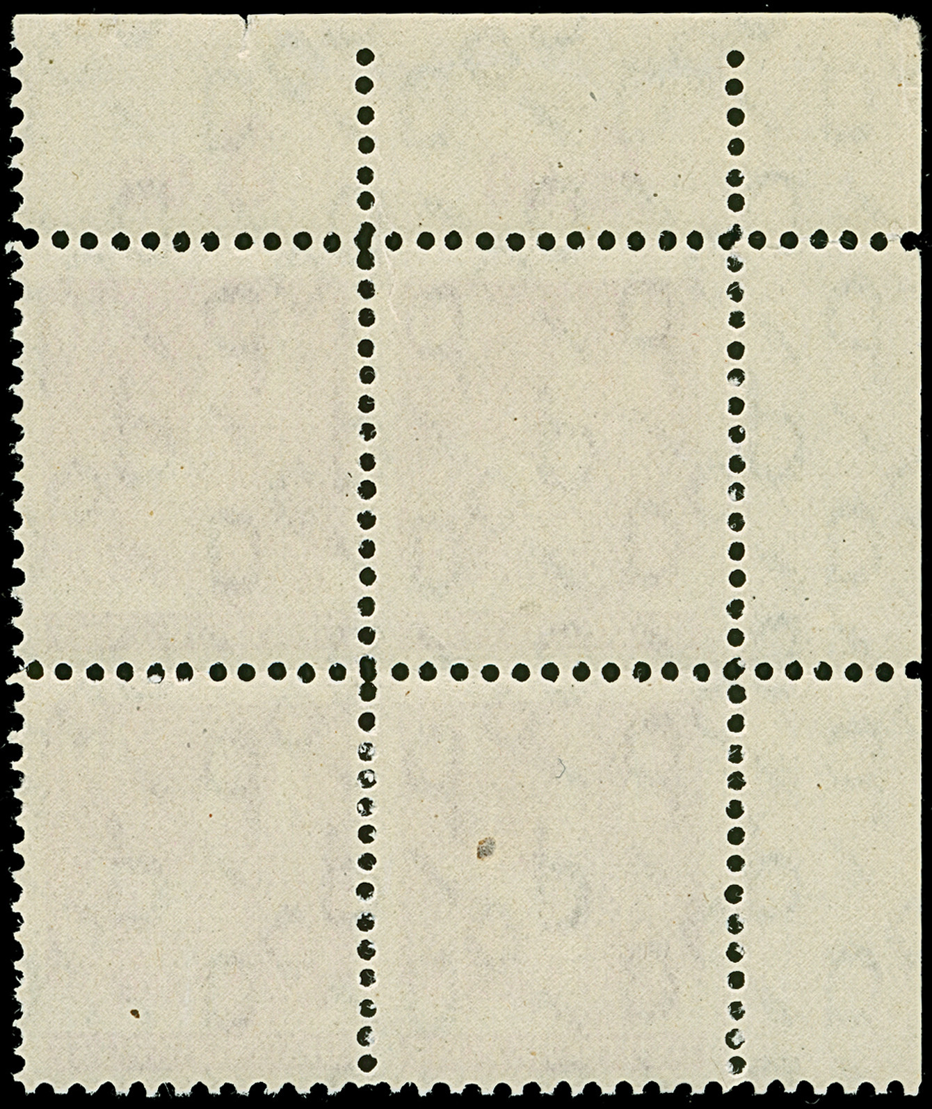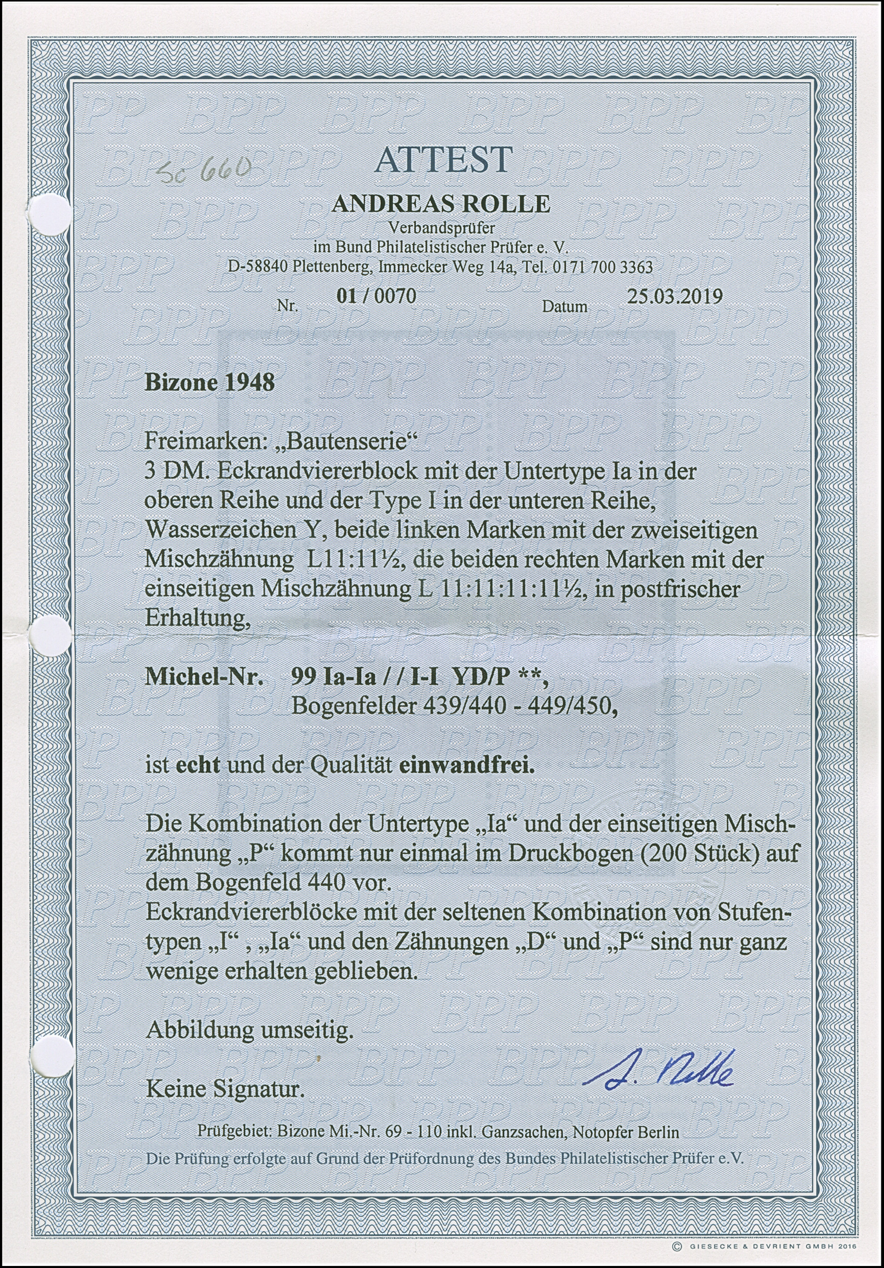 3 M. dunkelrotlila, zweimal Type I (unten) und zweimal Type Ia (oben) und mit Wasserzeichen 1Y im Viererblock aus der rechten oberen Bogenecke (Bogenfelder 439-40 und 449-50. Die beiden linken Marken sind gezähnt L 11 : 11½ und die beiden rechten Marken sind gezähnt L 11 : 11 : 11 : 11½. Die postfrische Einheit ist in einwandfreier Erhaltung und in dieser Kombination selten, unsigniert mit Fotoattest Rolle BPP)