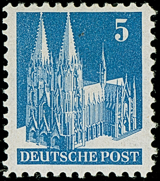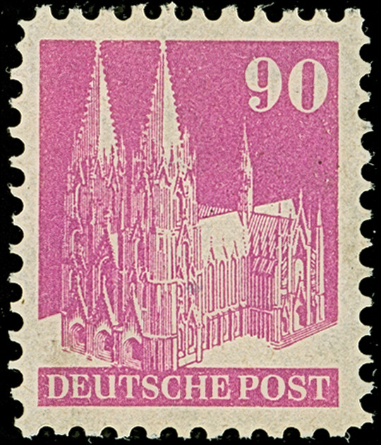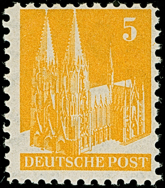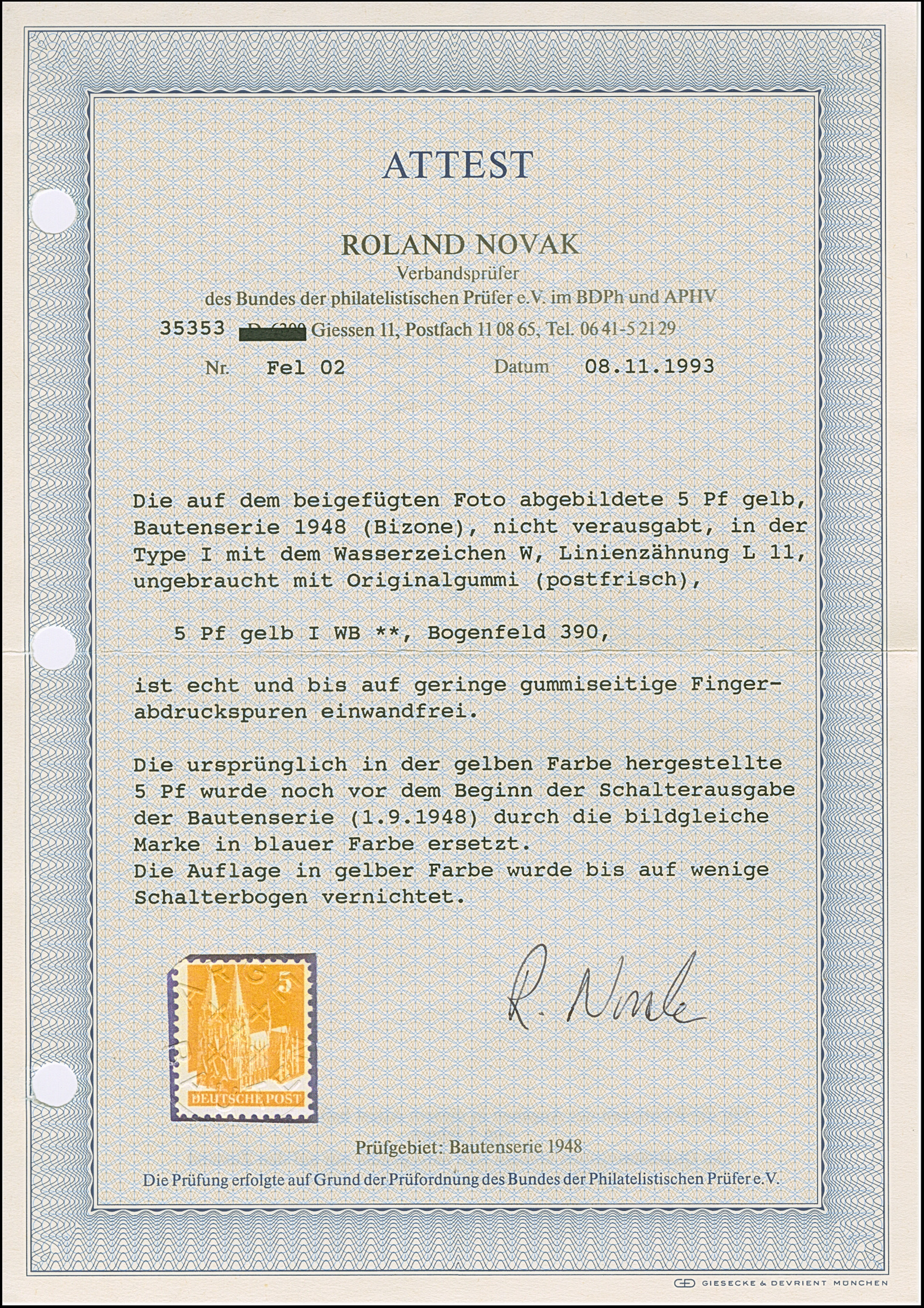 Nicht ausgegeben: 1948, Bauten 5 Pfg. gelb, Type I, gezähnt L 11 und mit Wasserzeichen 1W (Bogenfeld 390). Die postfrische Marke mit leichten Fingerspuren ist in einwandfreier Erhaltung. Ein schönes Exemplar dieser großen Bauten-Seltenheit, bisher sind nur ganz wenige Exemplare bekannt, unsigniert mit Fotoattest Novak BPP (1993)