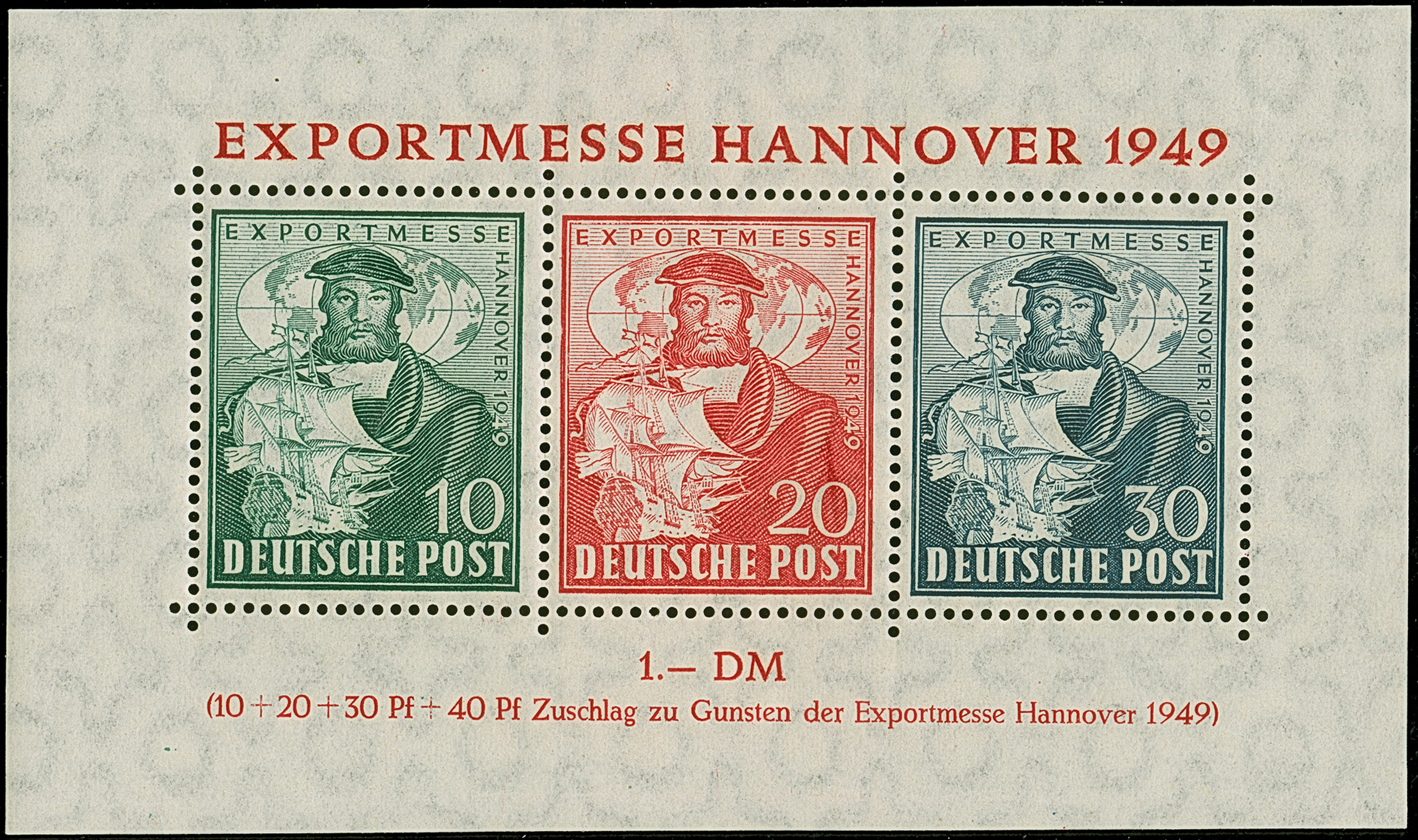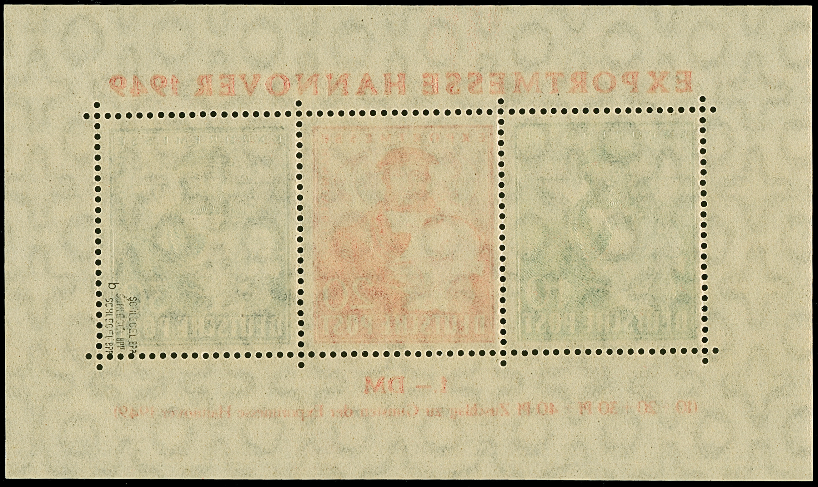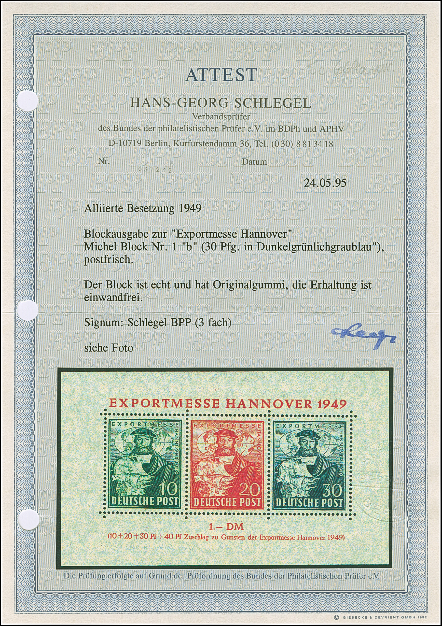 1949, Exportmesse Hannover-Block mit 30 Pfg. dunkelgrünlichgraublau, postfrisch und in einwandfreier Erhaltung, dreifach signiert Schlegel BPP mit Fotoattest (1995)