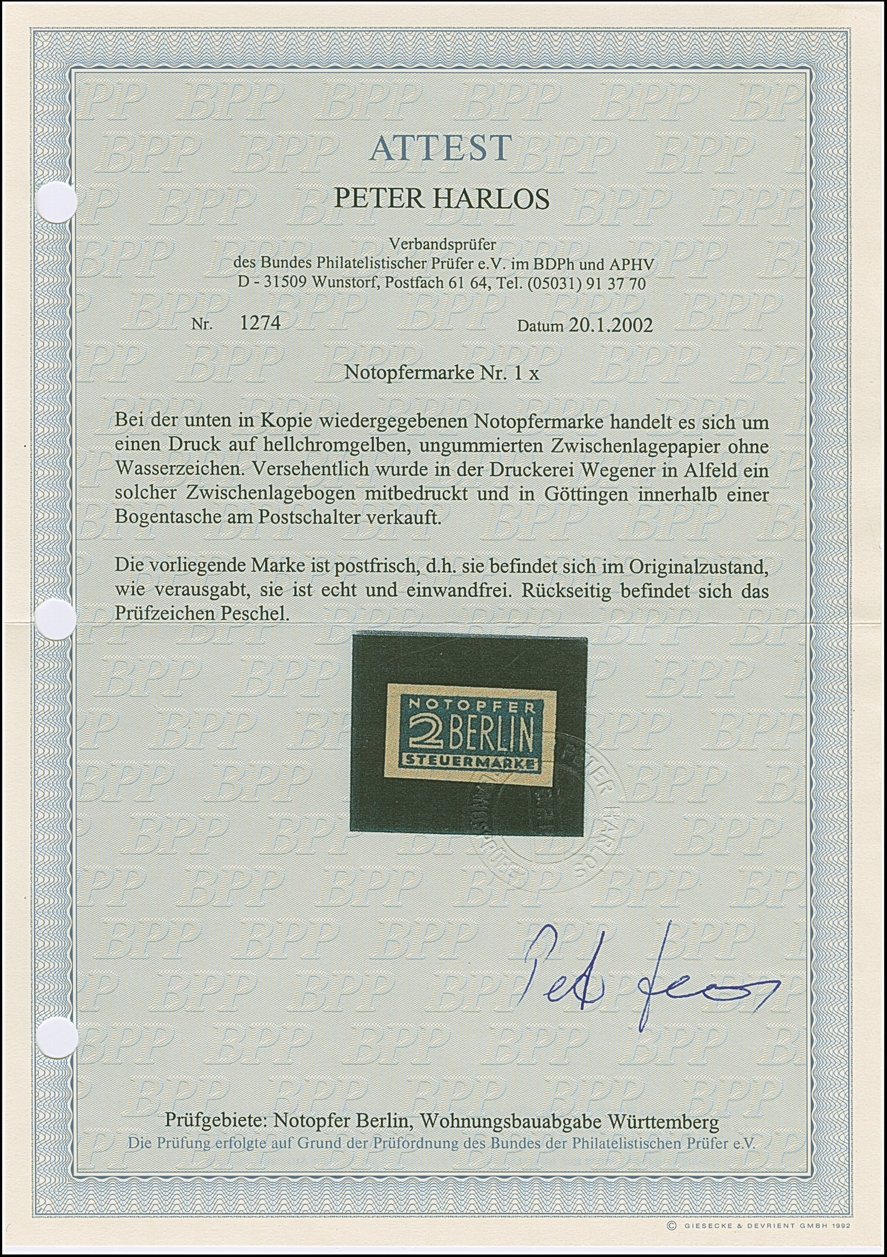 1948, Notopfermarke 2 Pfg. geschnitten auf hellchromgelbem Zwischenlagepapier ohne Wasserzeichen und ohne Gummierung. Die Marke ist in tadelloser Erhaltung, signiert Peschl und Fotoattest Harlos BPP (2002)
