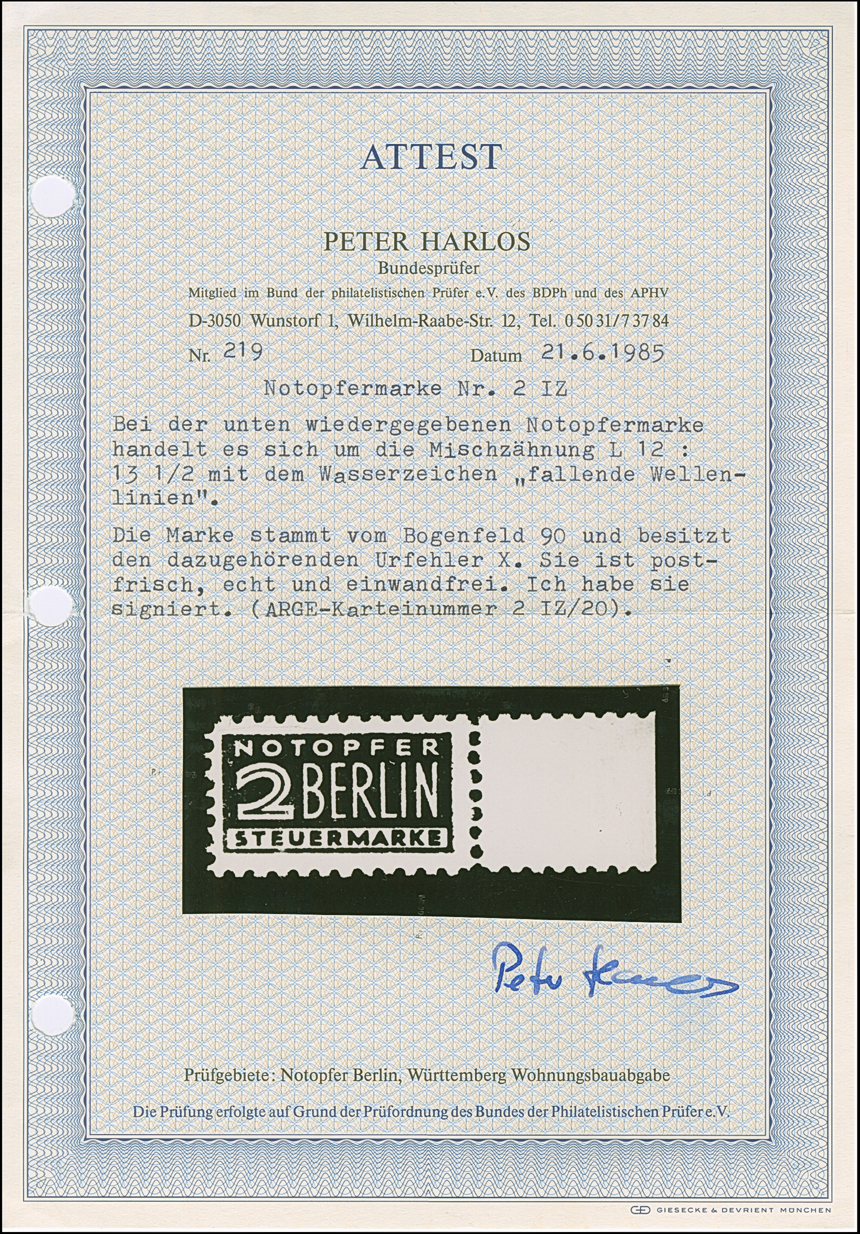 Notopfer 2 Pfg. gezähnt L 11¾ : 13½ und mit Wasserzeichen 3X mit Plattenfehler “X” (Feld 90), Randstück, postfrisch und in einwandfreier Erhaltung, signiert P. Harlos BPP mit Fotoattest (1985)