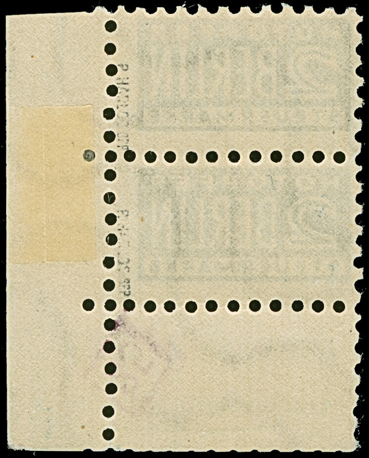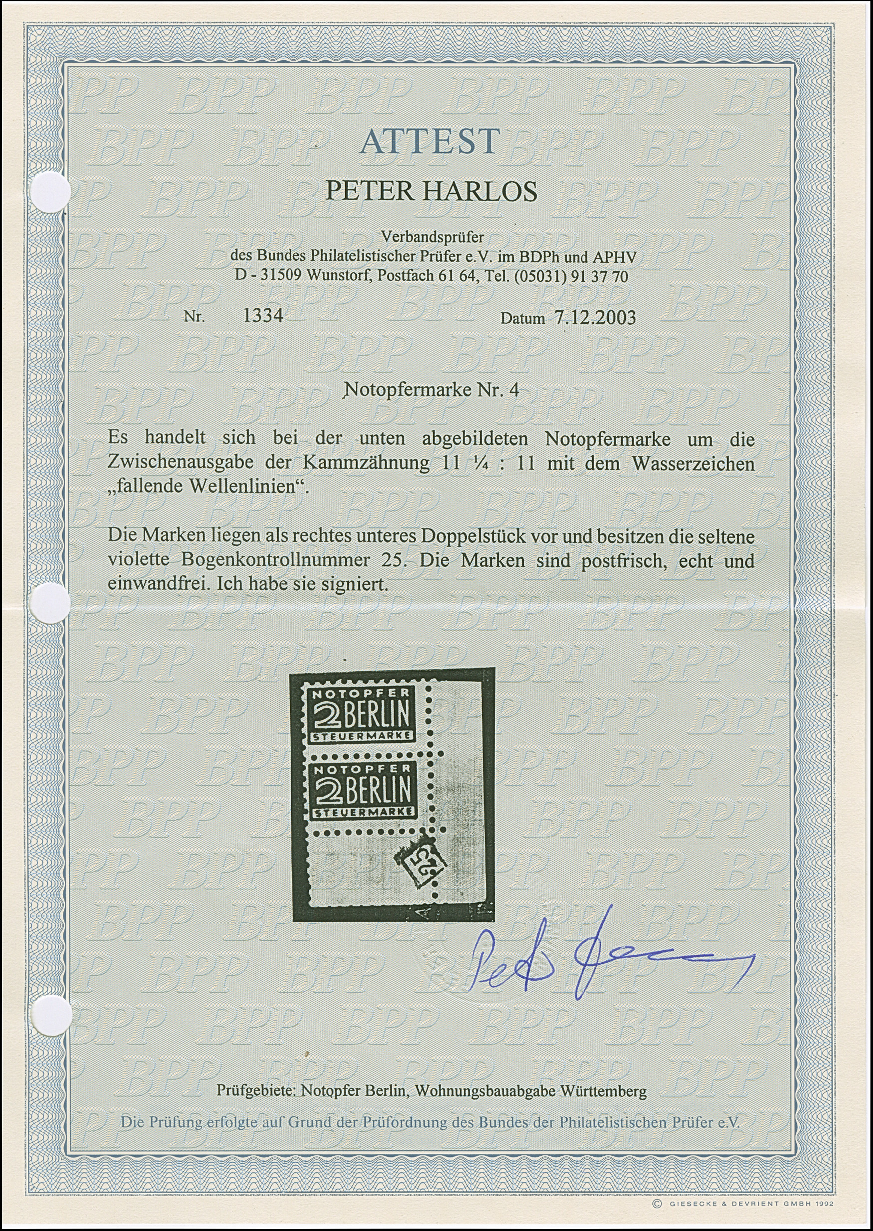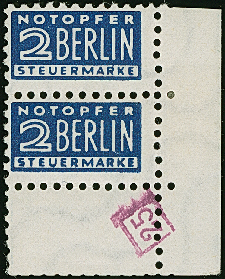 1950, Notopfer 2 Pfg. dunkelblau, gezähnt K 11¼ : 11 und mit Wasserzeichen 3X im senkrechten Paar und Leerfeld aus der rechten unteren Bogenecke mit violetter Bogenkontrollnummer “25”, postfrisch, in einwandfreier Erhaltung, Fotoattest P. Harlos BPP (2003)