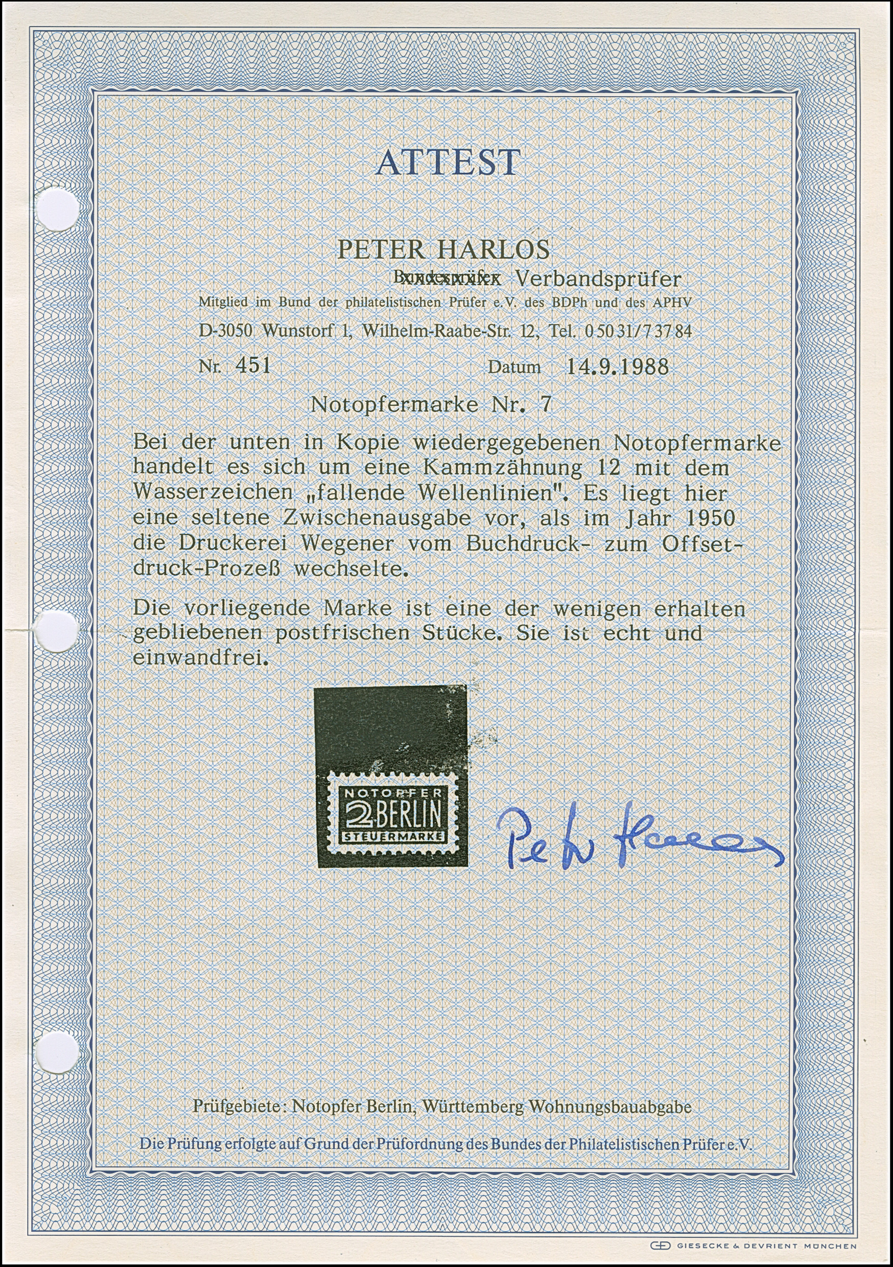 1950, Notopfer 2 Pfg. blau, gezähnt K 12 und mit Wasserzeichen 3X, postfrisch und in tadelloser Erhaltung. Ein sehr schönes Exemplar dieser seltenen Marke, unsigniert mit Fotoattest P. Harlos BPP (1988)