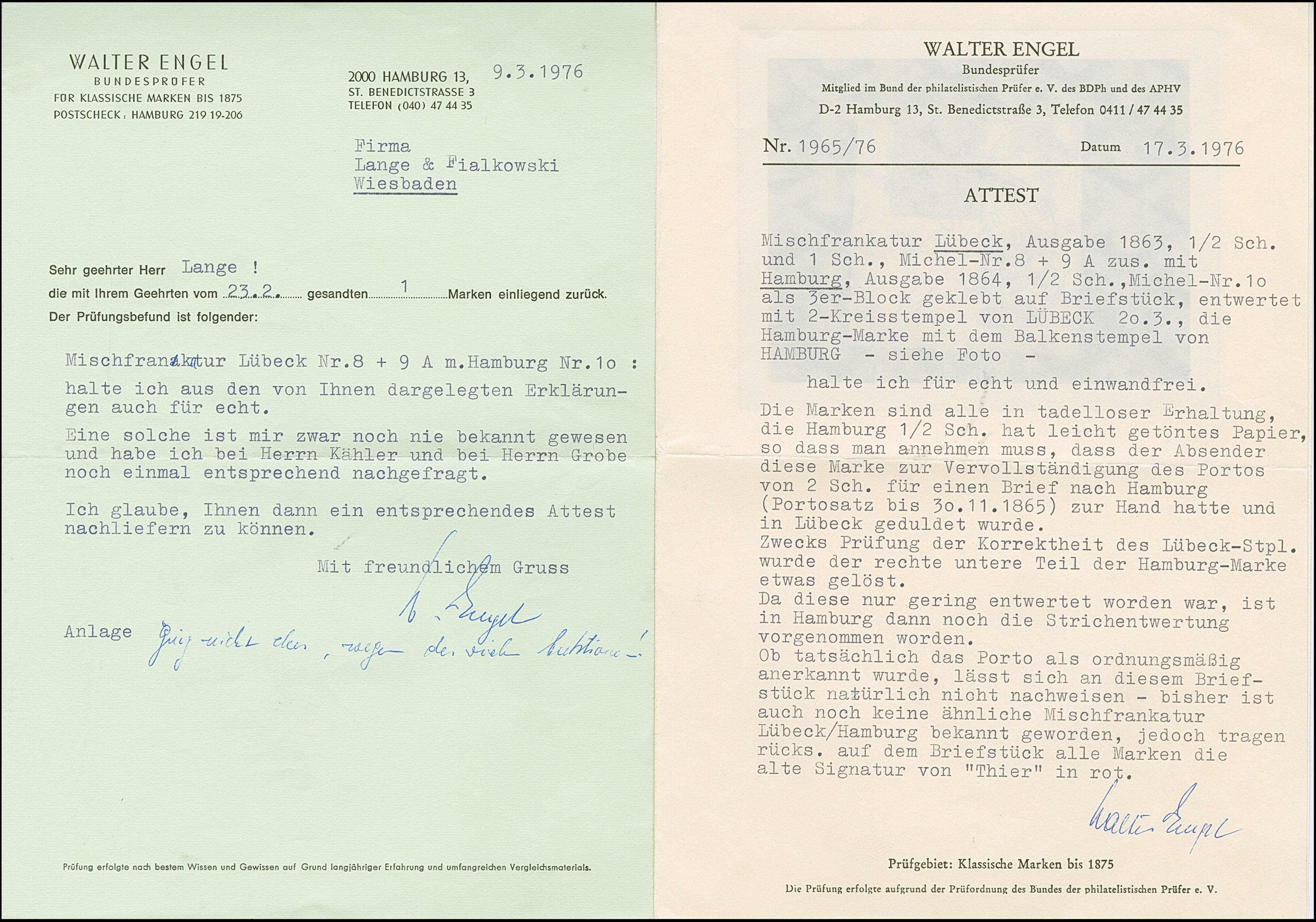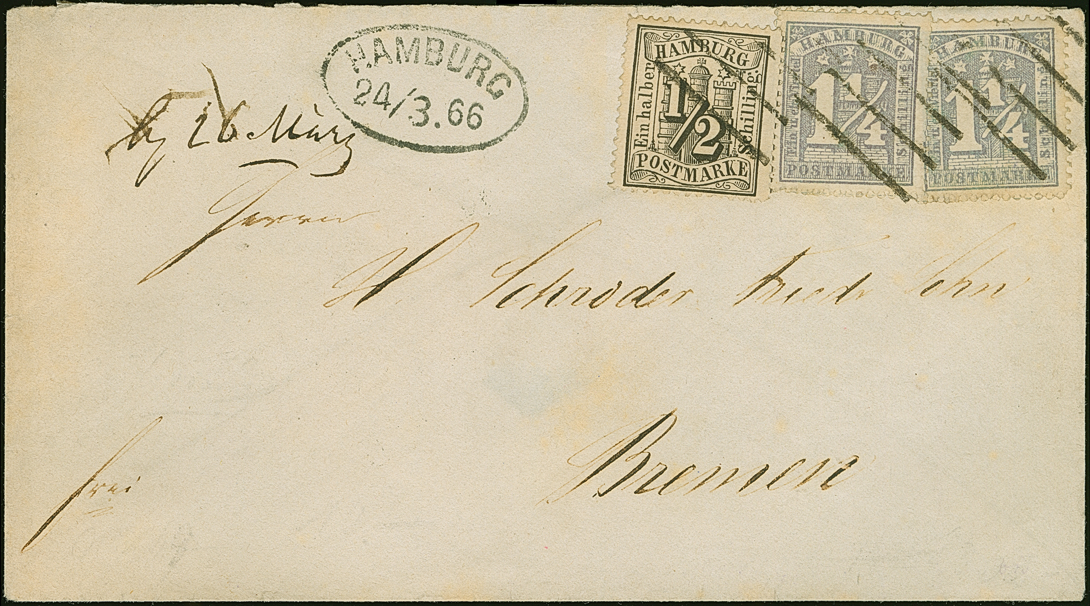 1¼ Sch. graupurpur, zwei Einzelwerte zusammen mit 1⁄2 Sch. schwarz (winziger Randspalt), mit sauber aufgesetzten Strichstempeln und sauber nebengesetztem Ovalstempel “HAMBURG 24/3.66” als portogerechte 3 Schilling-Frankatur auf Briefkuvert nach Bremen. Sehr schöne Erhaltung. Eine der großen Frankatur-Seltenheiten Hamburgs. PROFI hat nur noch zwei weitere Farbfrankaturen mit dieser Marke registriert; in dieser Kombination Unikat.