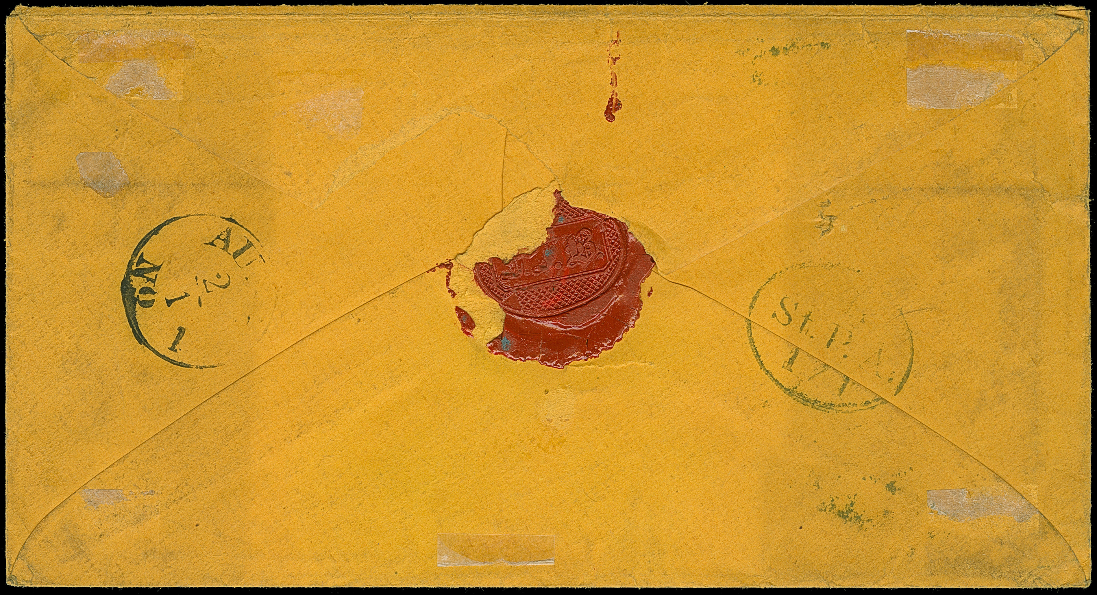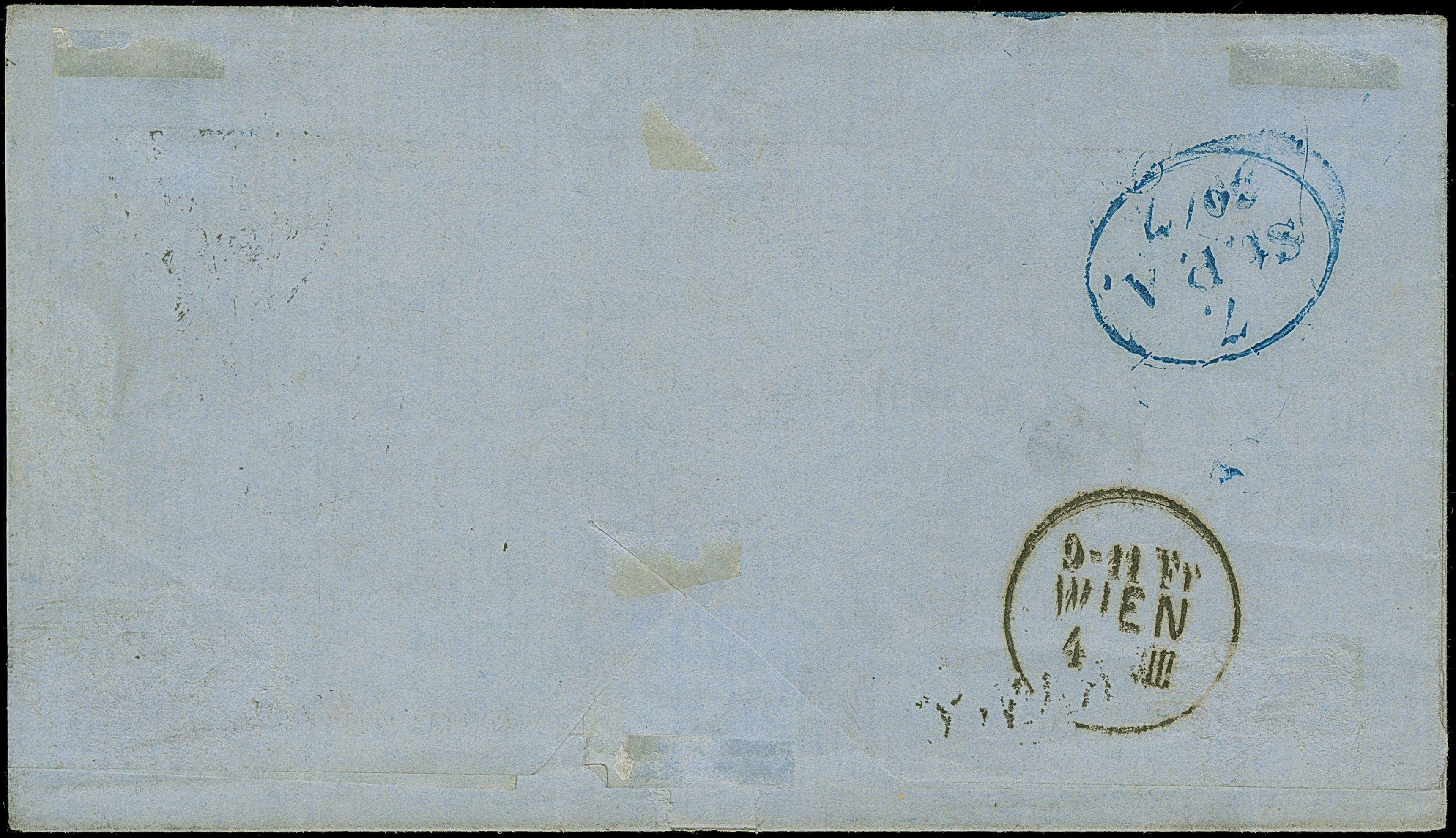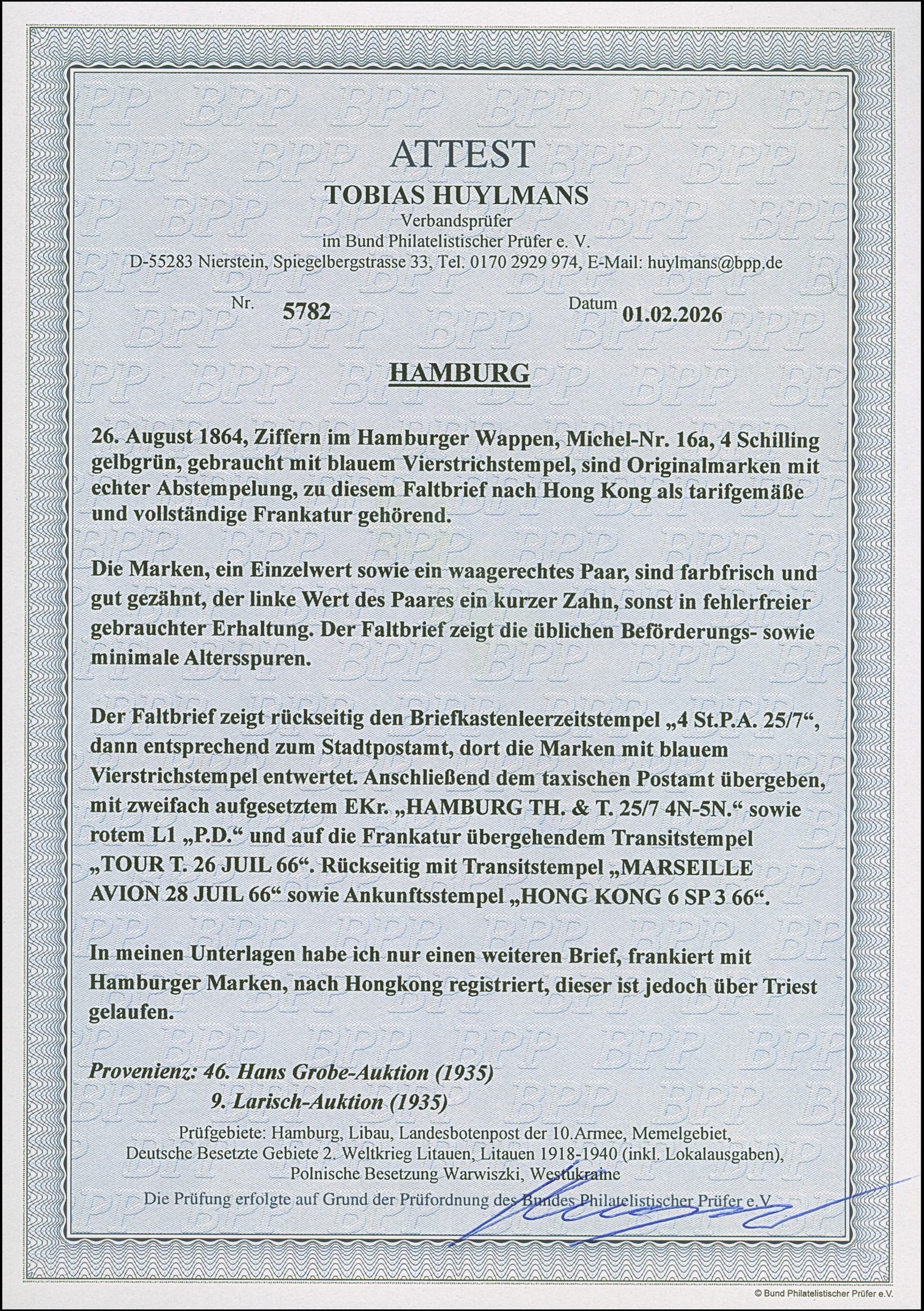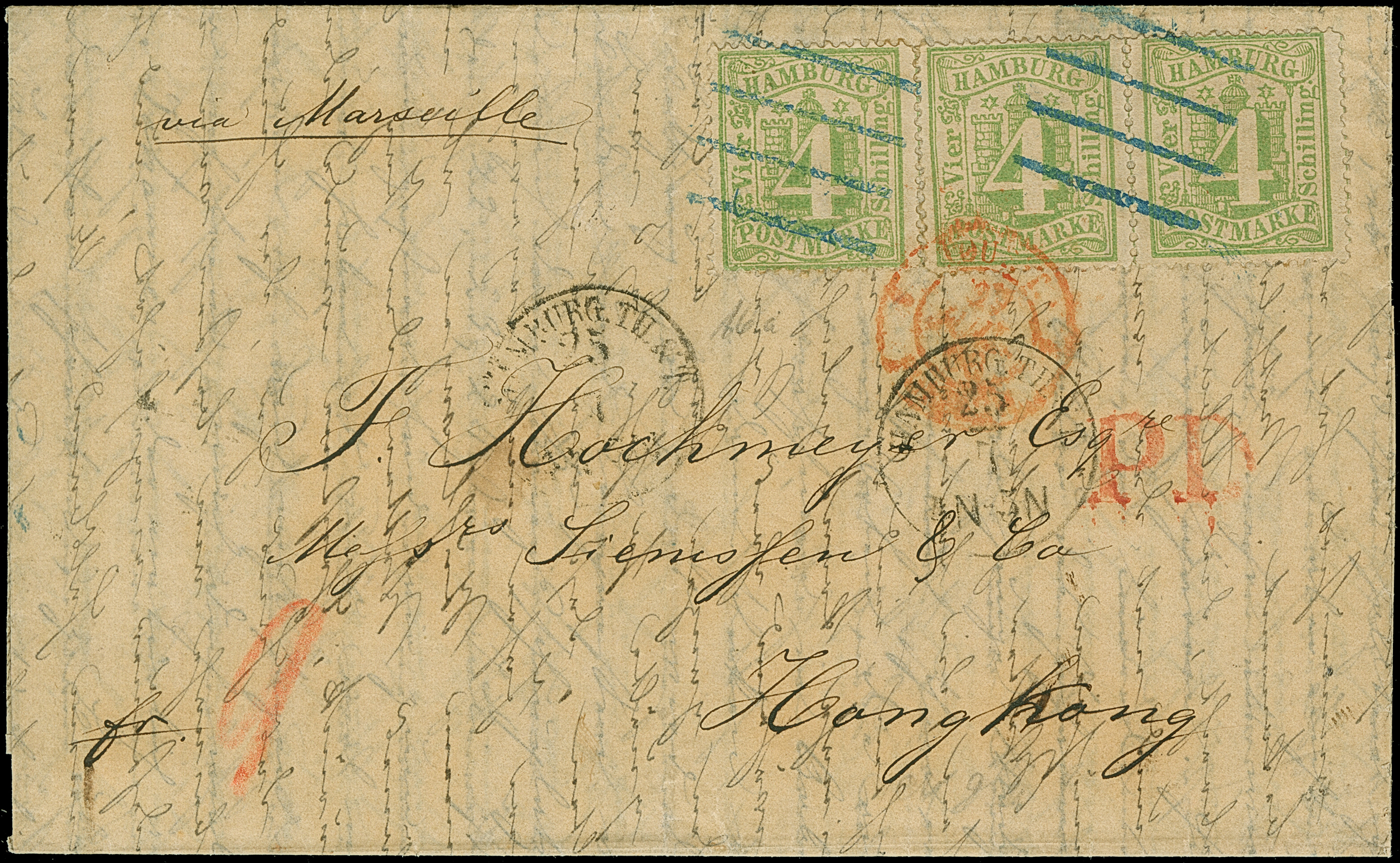 4 Sch. gelbgrün, ein Einzelwert sowie ein waagerechtes Paar, als Streifen geklebt, farbfrisch und gut gezähnt, mit sauber aufgesetztem blauem Strichstempel und nebengesetztem EKr. "HAMBURG TH.&T. 25/7" (1866) auf komplettem Faltbrief über Frankreich nach Hongkong, mit Ankunftsstempel vom 3. September. Der linke Wert des Paares einen unbedeutend verkürzten Zahn, sehr schöne und frische Erhaltung. Einer der seltensten Auslandsbriefe Hamburgs; ProFi hat nur einen weiteren Brief mit Hamburg-Frankatur nach Hongkong (jedoch über Triest gelaufen) registriert. Fotoattest Huylmans BPP (2026)