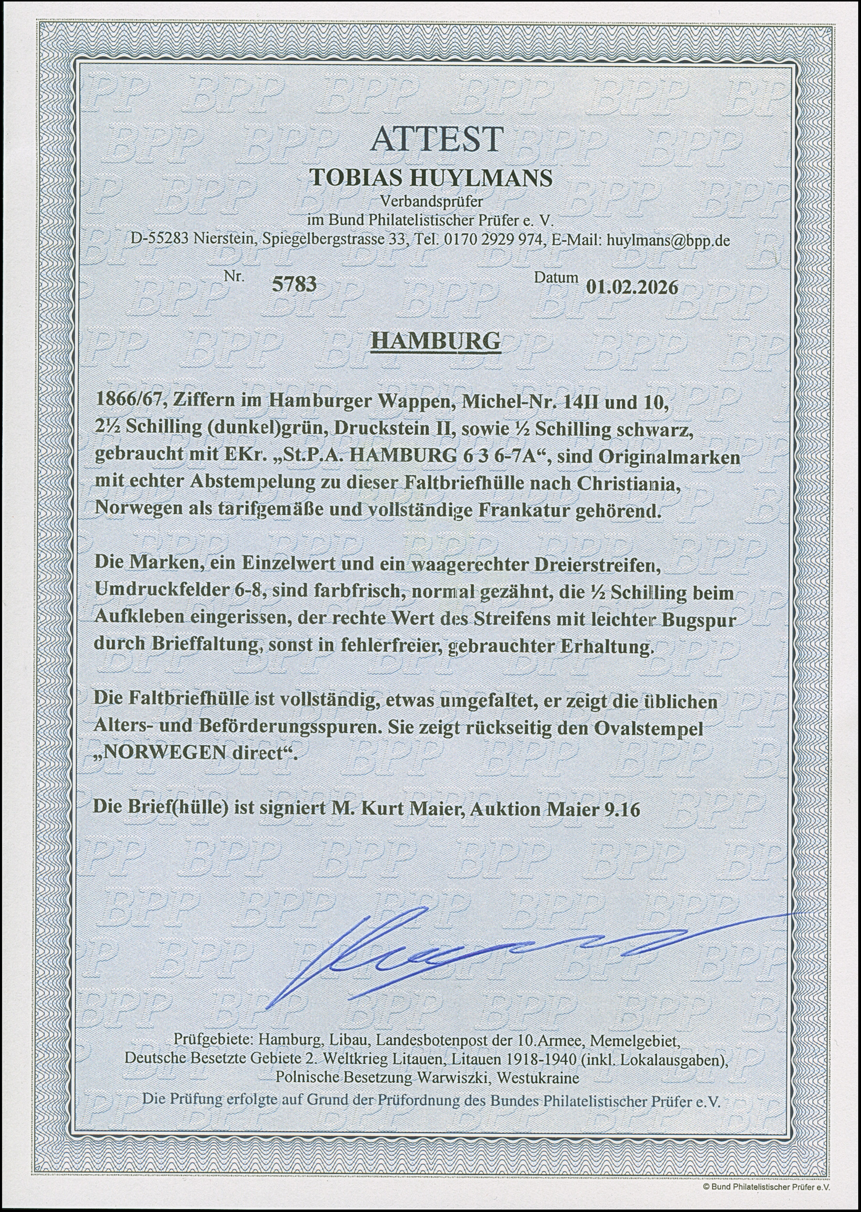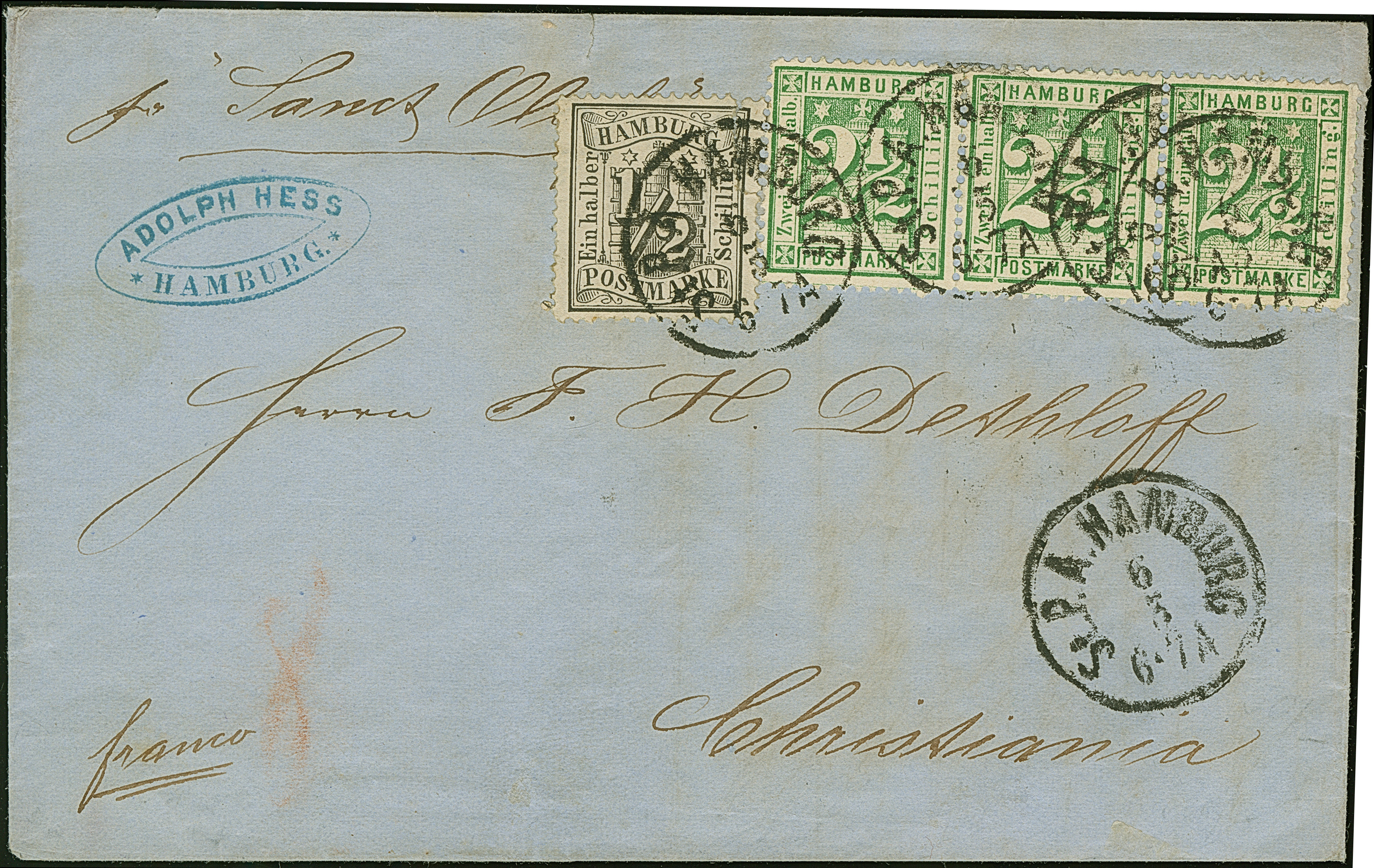 ½ Sch. schwarz und 2½ Sch. dunkelgrün im waagerechten 3er-Streifen, Umdruckfelder 6-8, je farbfrisch und normal gezähnt, mit mehrfach auf- und nebengesetztem EKr. "St. P. A. HAMBURG 6 3" (1865) auf Briefhülle mit rückseitigem Ovalstempel "NORWEGEN direct", nach Christiania. Die rechte Marke des Streifens durch Randklebung ganz kleine Mängel, die ½ Sch. längerer Einriss, sonst gute Erhaltung. Ein sehr seltener und attraktiver Auslandsbrief, sign. Kurt Maier sowie Fotoattest Huylmans BPP (2026)