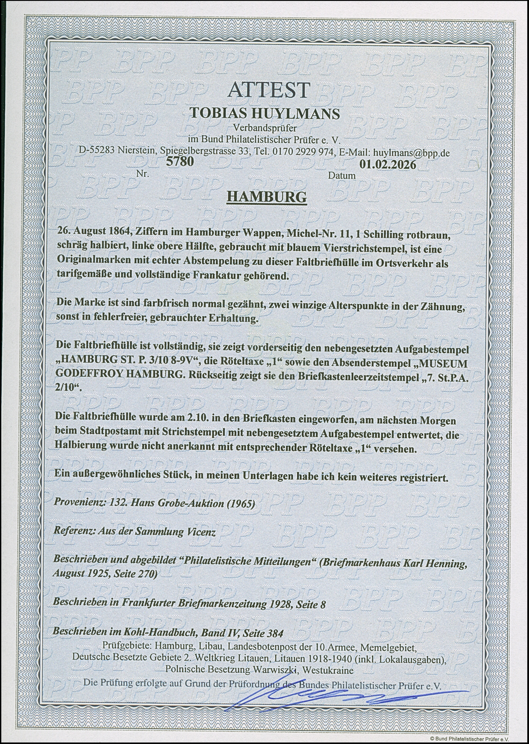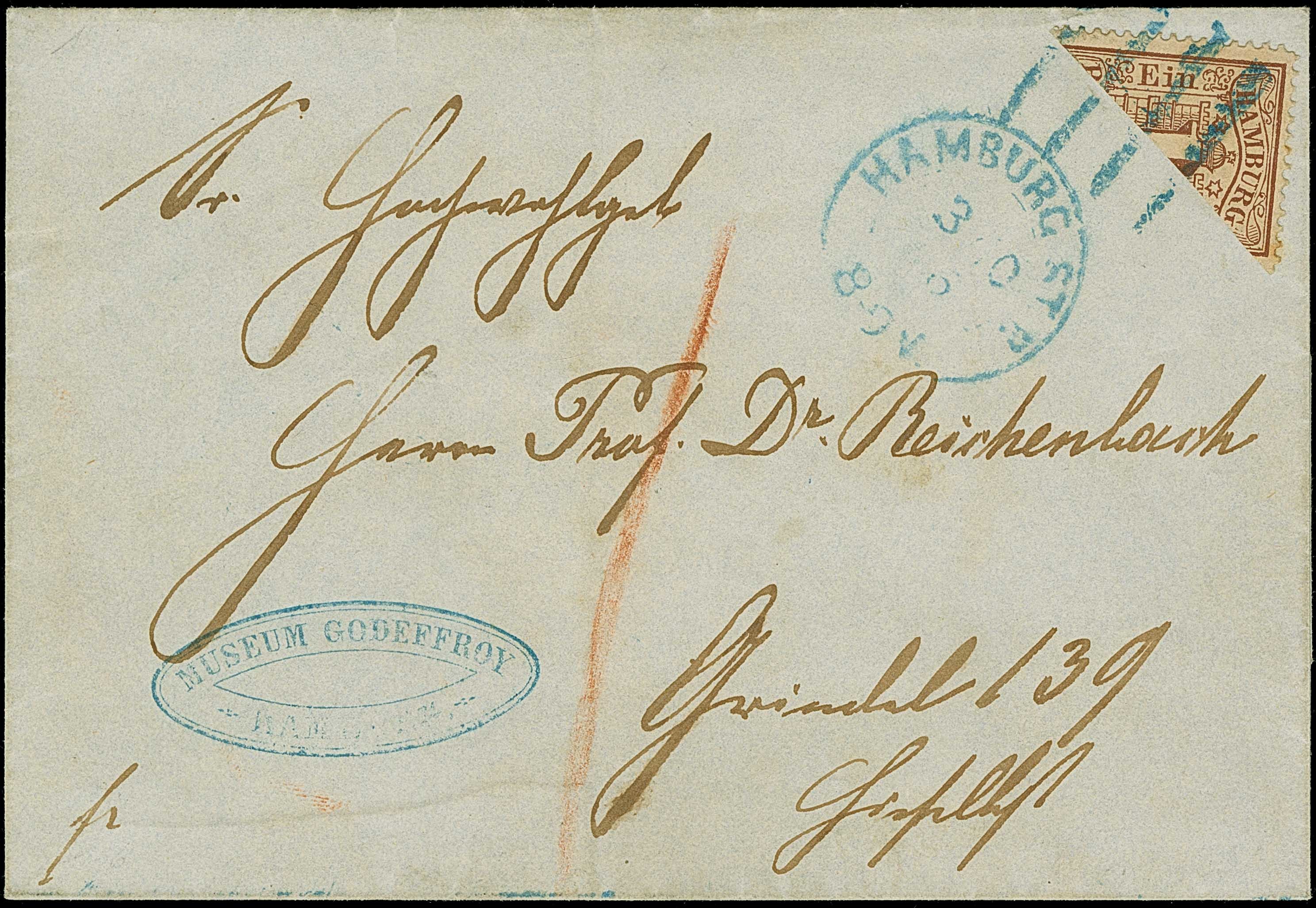 1864/67, 1 Schilling braun, diagonal halbiert, linke obere Hälfte, farbfrisch und normal gezähnt, zwei winzige Alterspünktchen, sauber mit dickem blauem Strichstempel und sauber nebengesetztem blauen "HAMBURG ST.P. 3 10 66" auf Briefhülle mit vorderseitigem Absenderstempel "MUSEUM GODEFFROY" nach Grindel . Die Halbierung wurde nicht anerkannt und mit “1” Schilling taxiert. Sehr schöne und frische Erhaltung. Von Hamburg sind ansonsten nur einige wenige Halbierungen nach Altona bekannt; dies ist die einzige bekannte Halbierung der 1 Sch.-Marke. Eine der ganz großen Seltenheiten der Hamburg-Philatelie. Fotoattest Huylmans BPP (2026)