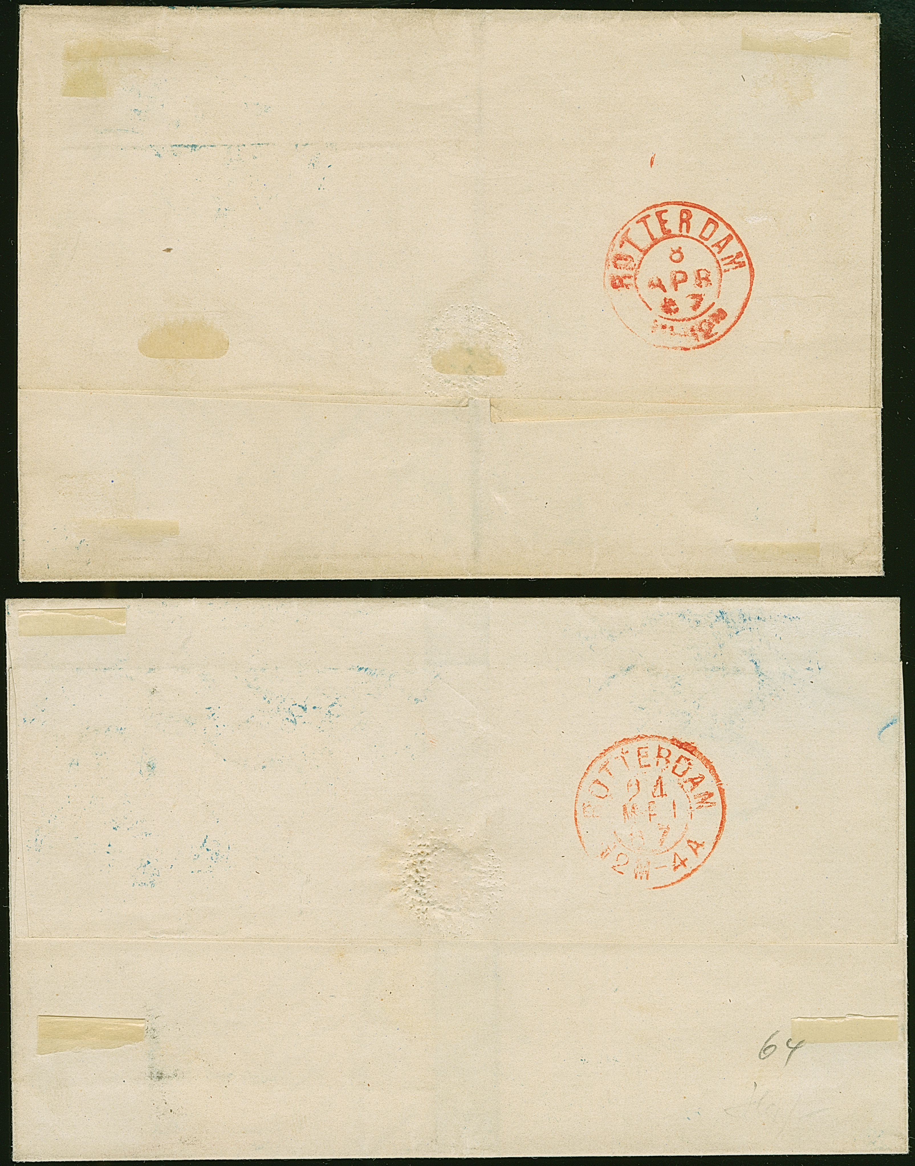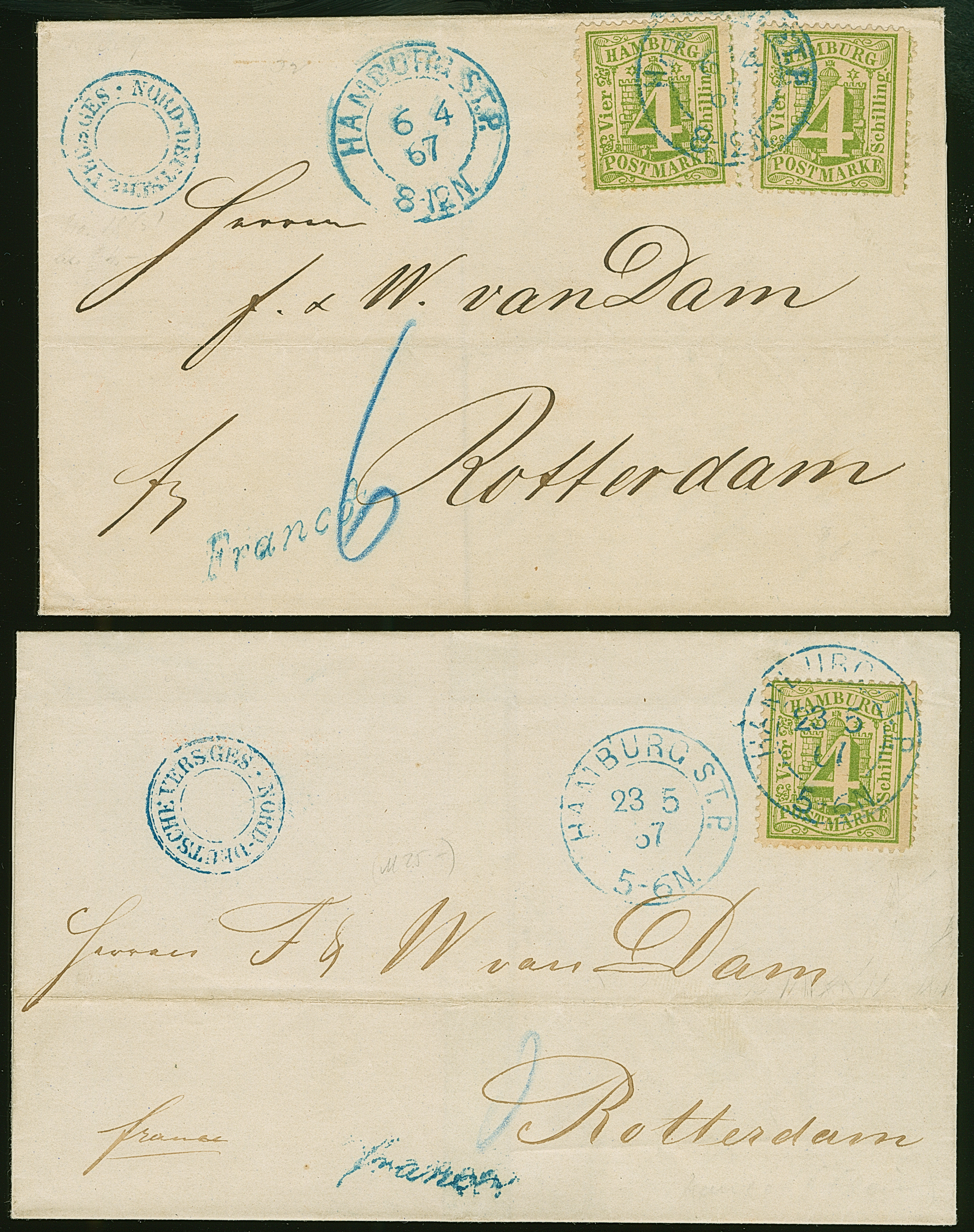 4 Sch. grün, einzeln bzw zwei Stück auf zwei Briefen der 1. bzw 2. Gewichtsstufe derselben Korrespondenz, je mit blauem DKr. "HAMBURG ST.P." nach Rotterdam