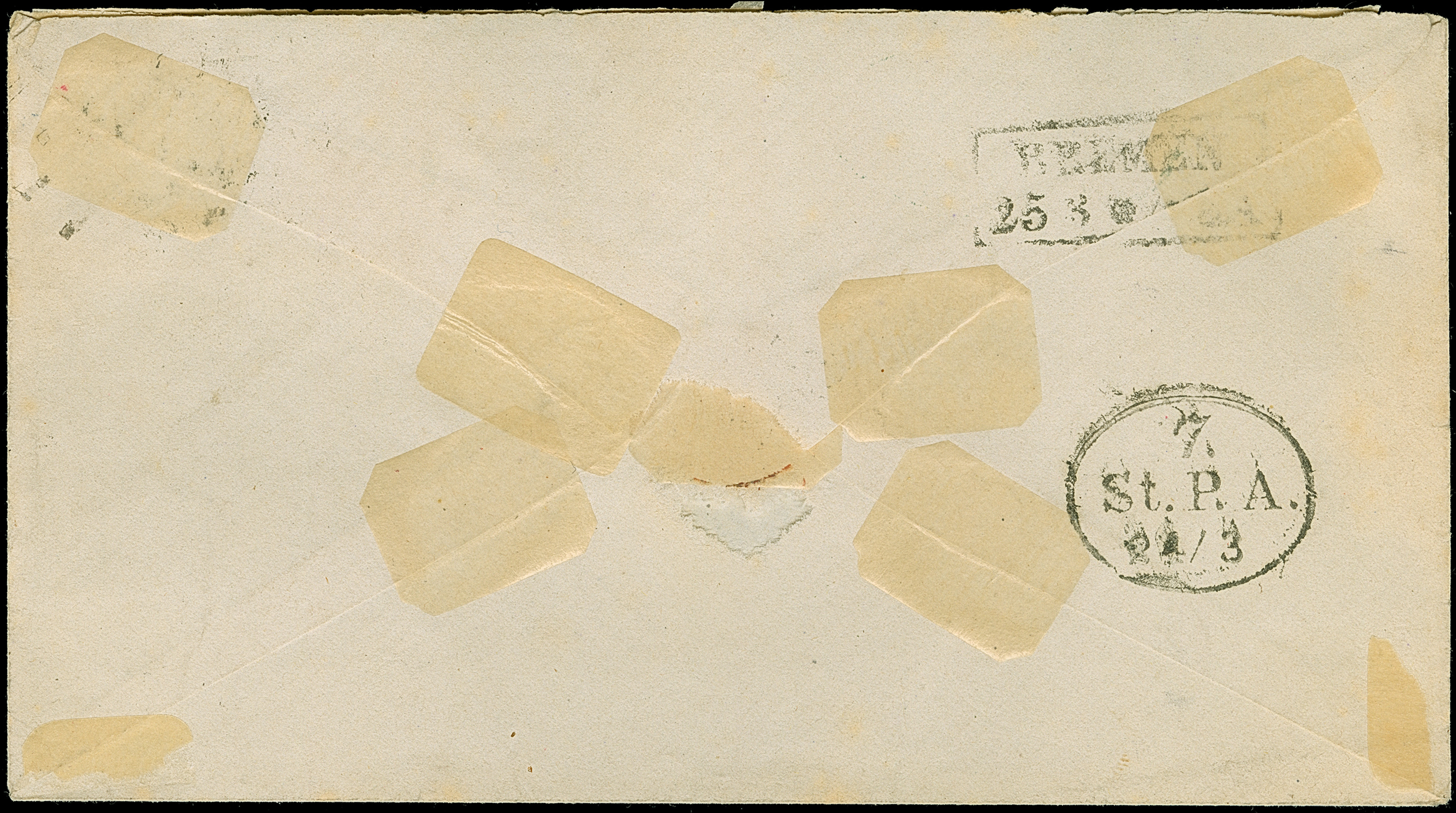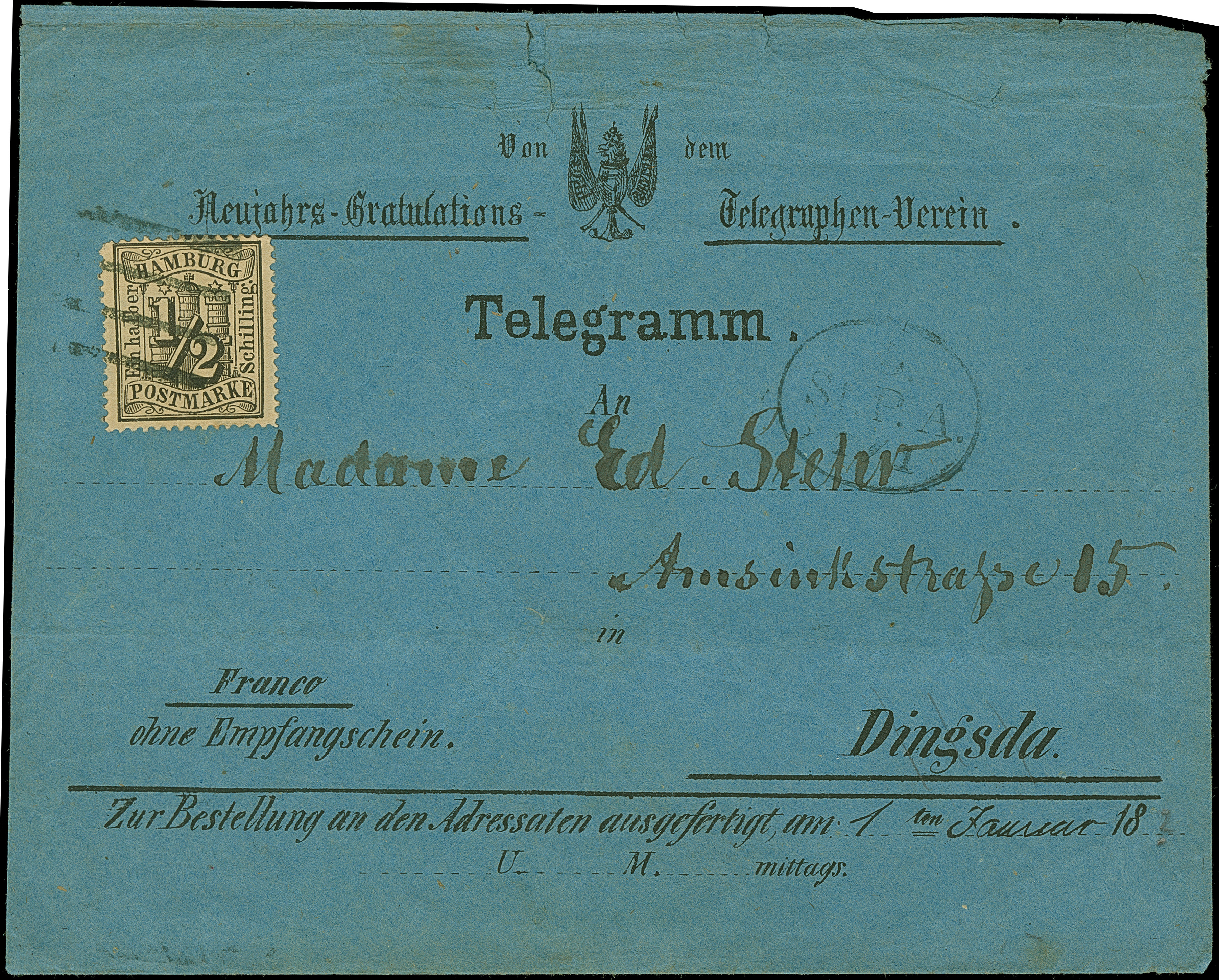 ½ Sch. schwarz mit sauber aufgesetztem Strichstempel und nebengesetztem Ovalstempel “St.P.A. 1/1” auf ungewöhnlichem Zierbrief in Form eines “Neujahrs-Gratulations-Telegramms”, als Ortsbrief gelaufen. Außerhalb der Frankatur etwas knittrig. Ein außergewöhnliches und seltenes Stück.