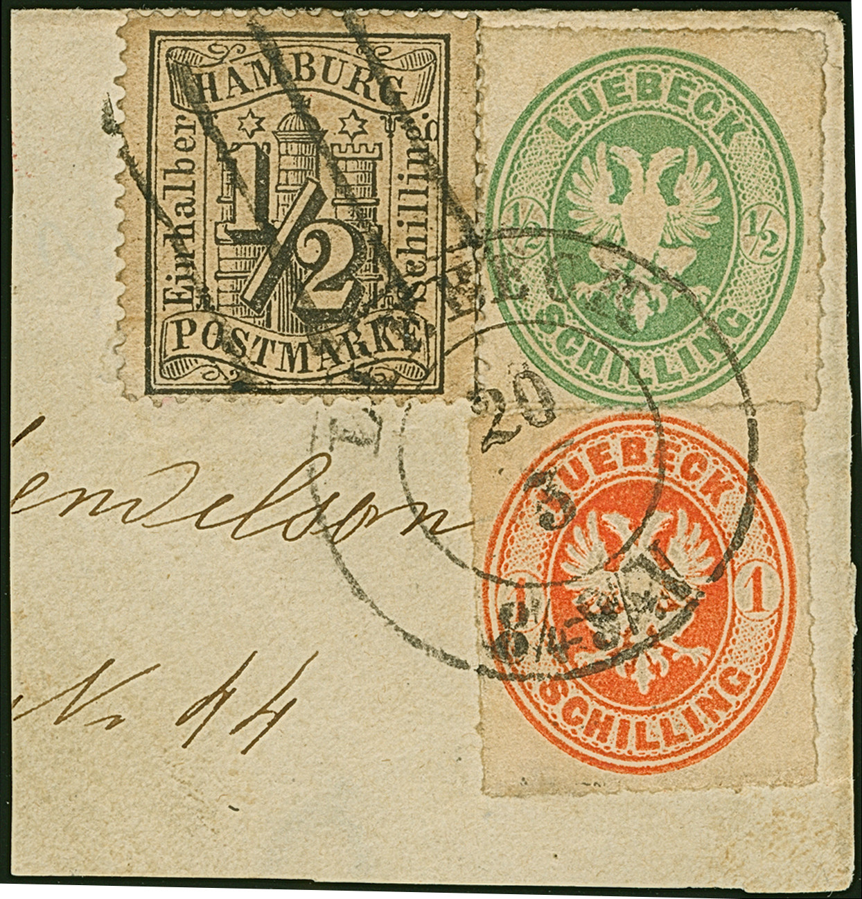1⁄2 Sch. schwarz in Mischfrankatur mit Lübeck 1863/67, 1⁄2 Sch. grün und 1 Sch. orange, mit über alle Werte gehendem klarem DKr. “LÜBECK 20/3” auf größerem Briefstück (offensichtlich eines Briefes nach Hamburg). Die Hamburg- Marke wahrscheinlich aufgrund der unzureichenden Entwertung bei Ankunft zusätzlich mit