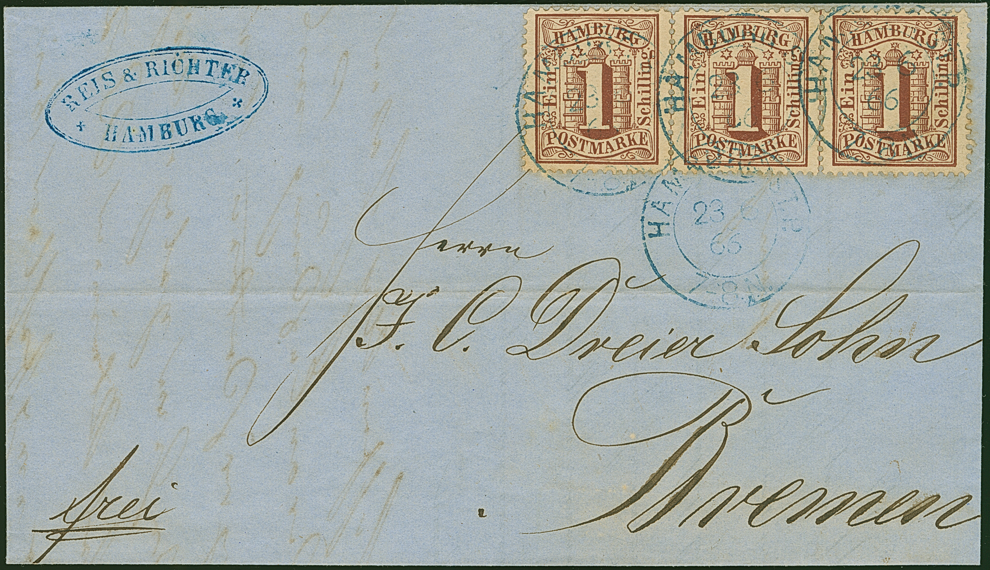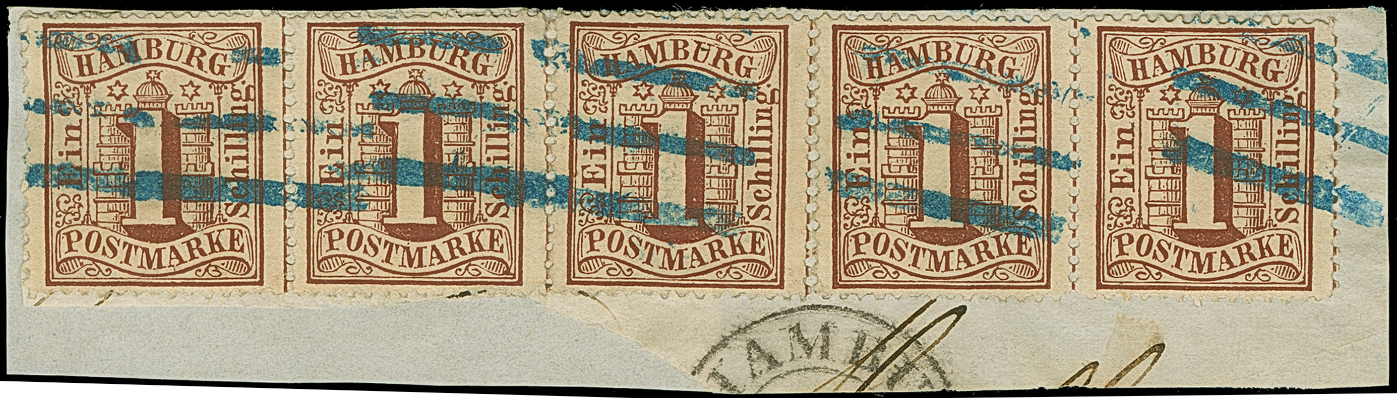1 Sch. braun im waagerechten 3er-Streifen, farbfrisch und gut gezähnt, mit sauberen Strichstempeln und nebengesetztem DKr. “HAMBURG 31 1” auf Briefhülle