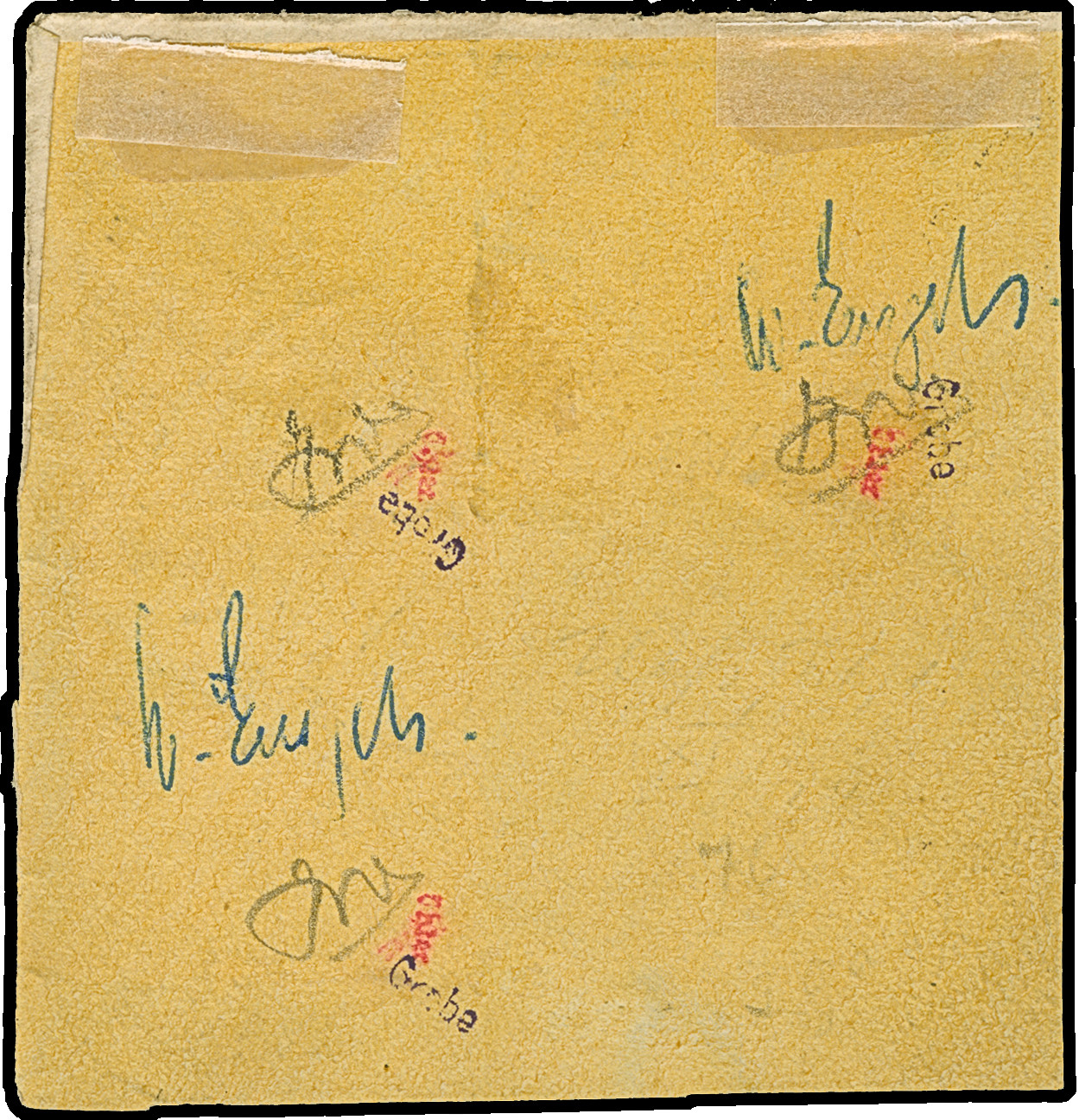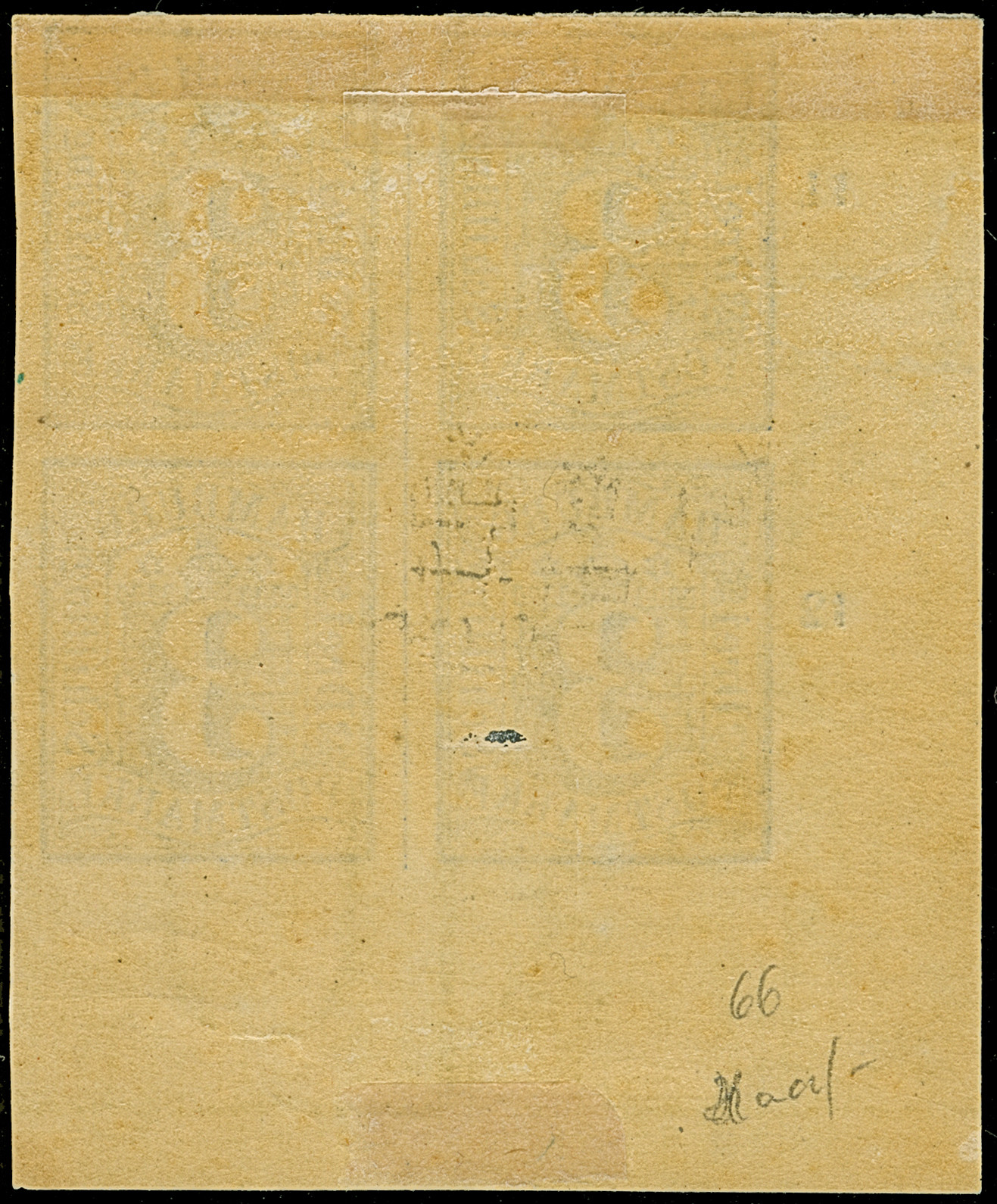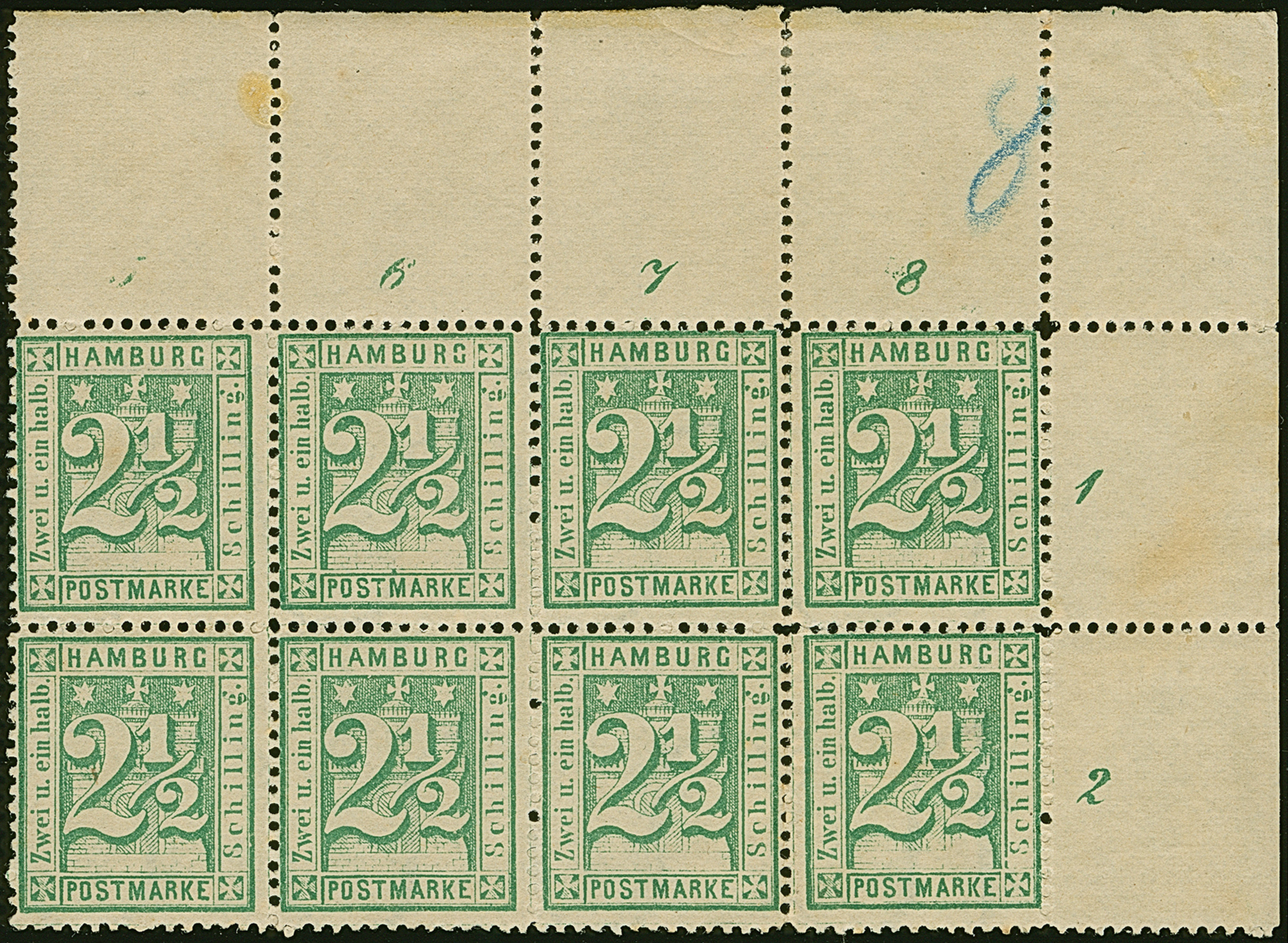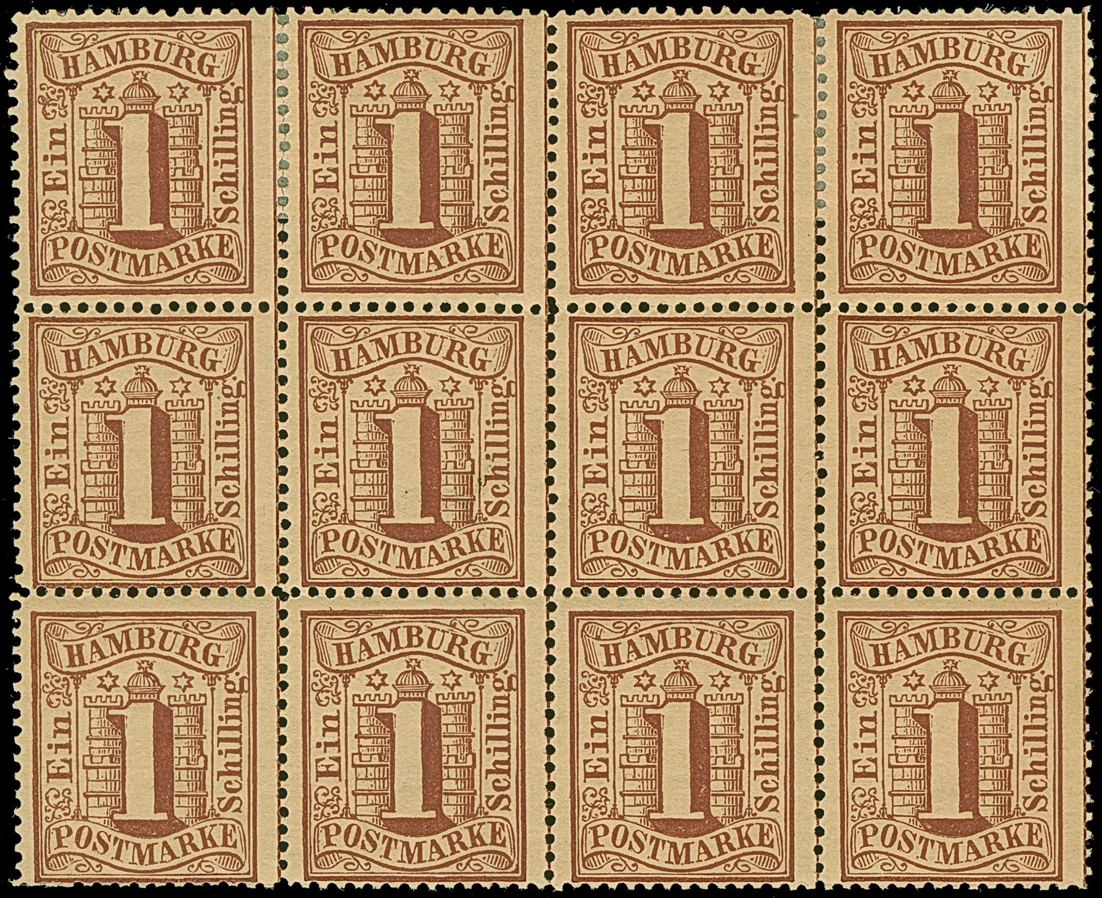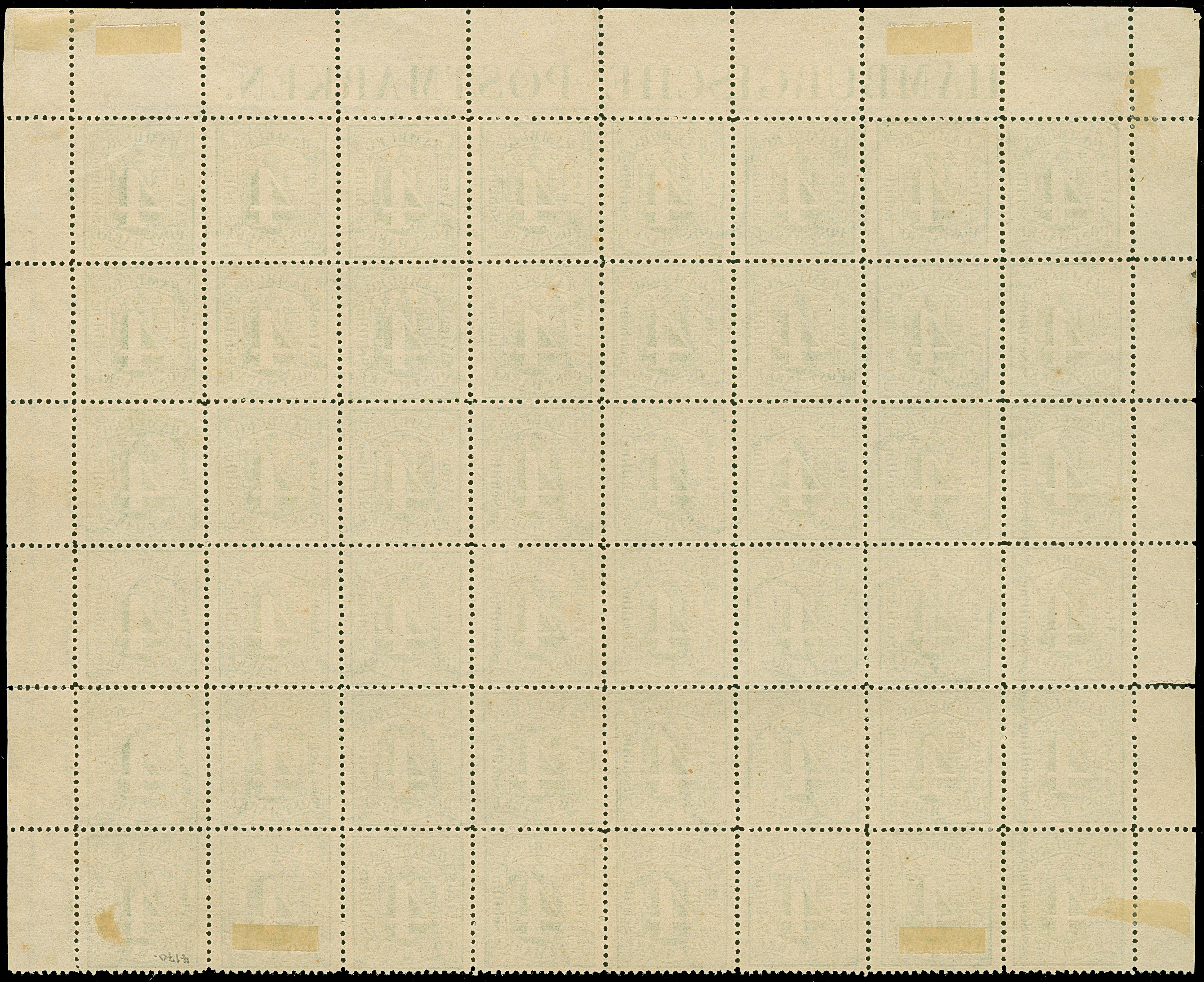 4 Sch. gelbgrün im 48er-Bogenteil, dreiseitig mit Bogenrändern, oben mit vollständiger Randinschrift "HAMBURGISCHE POSTMARKEN", ungummiert. Leicht angetrennt, sonst sehr schöne Erhaltung. Zweitgrößte registrierte Einheit dieser Marke und Unikat.