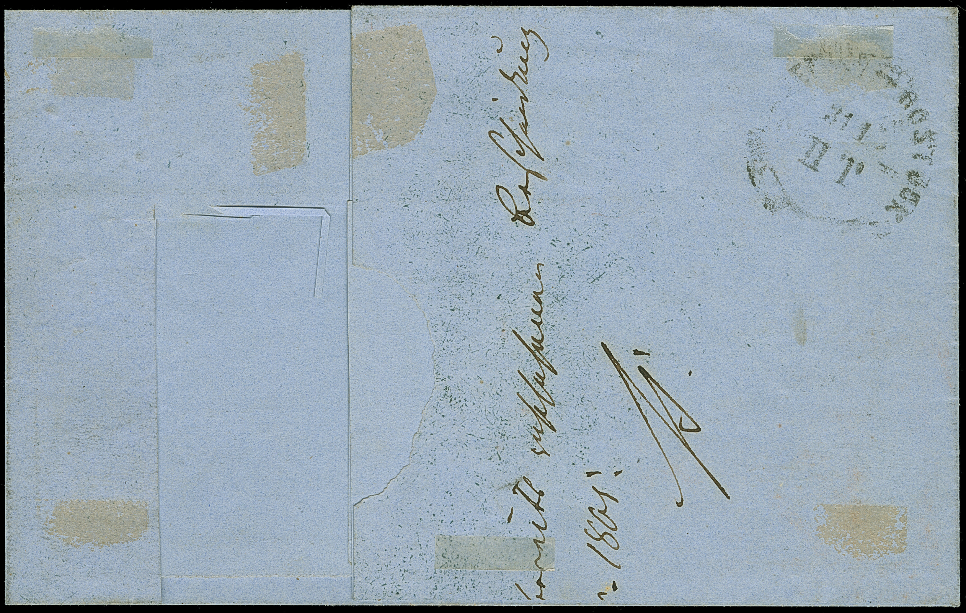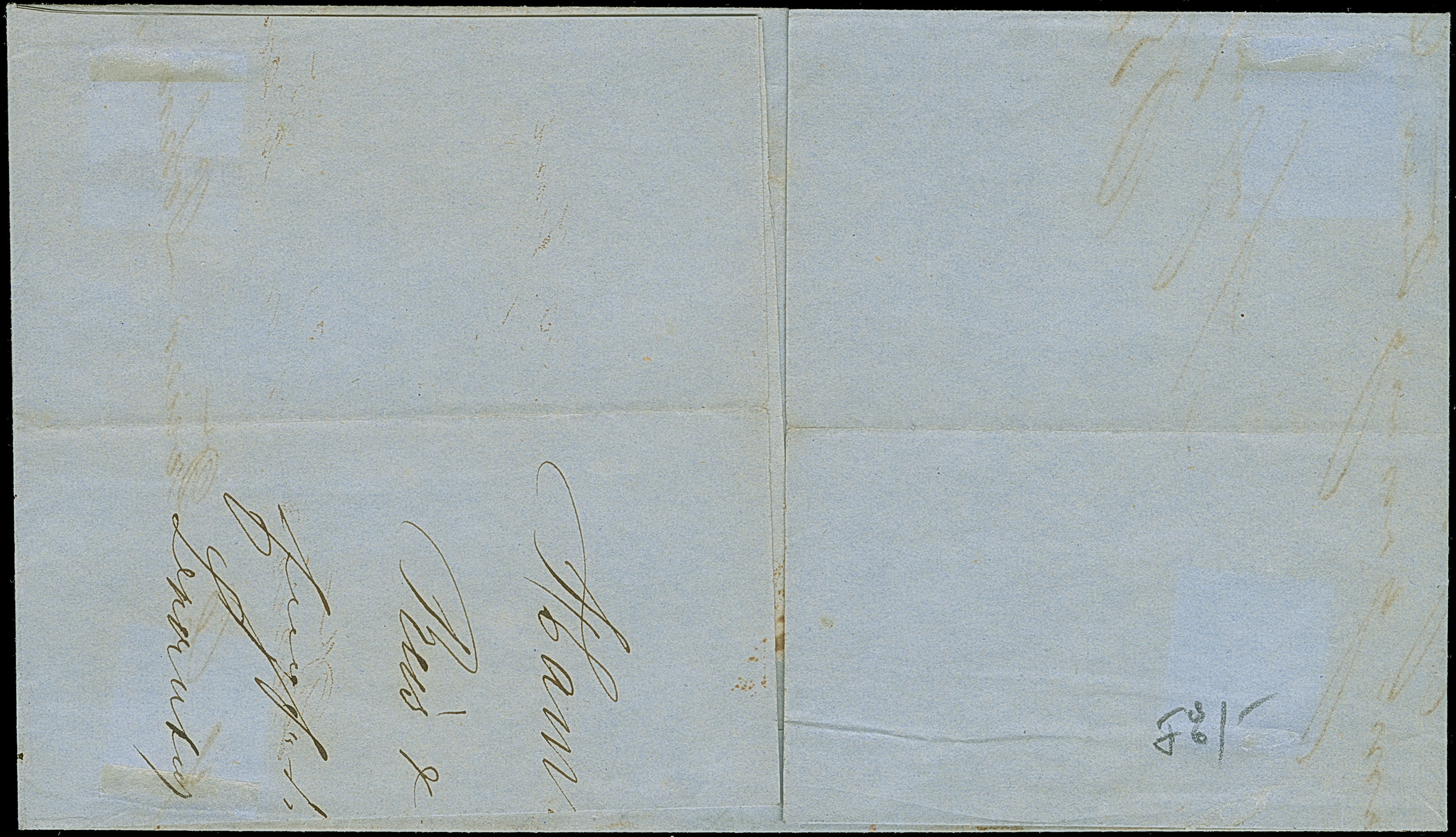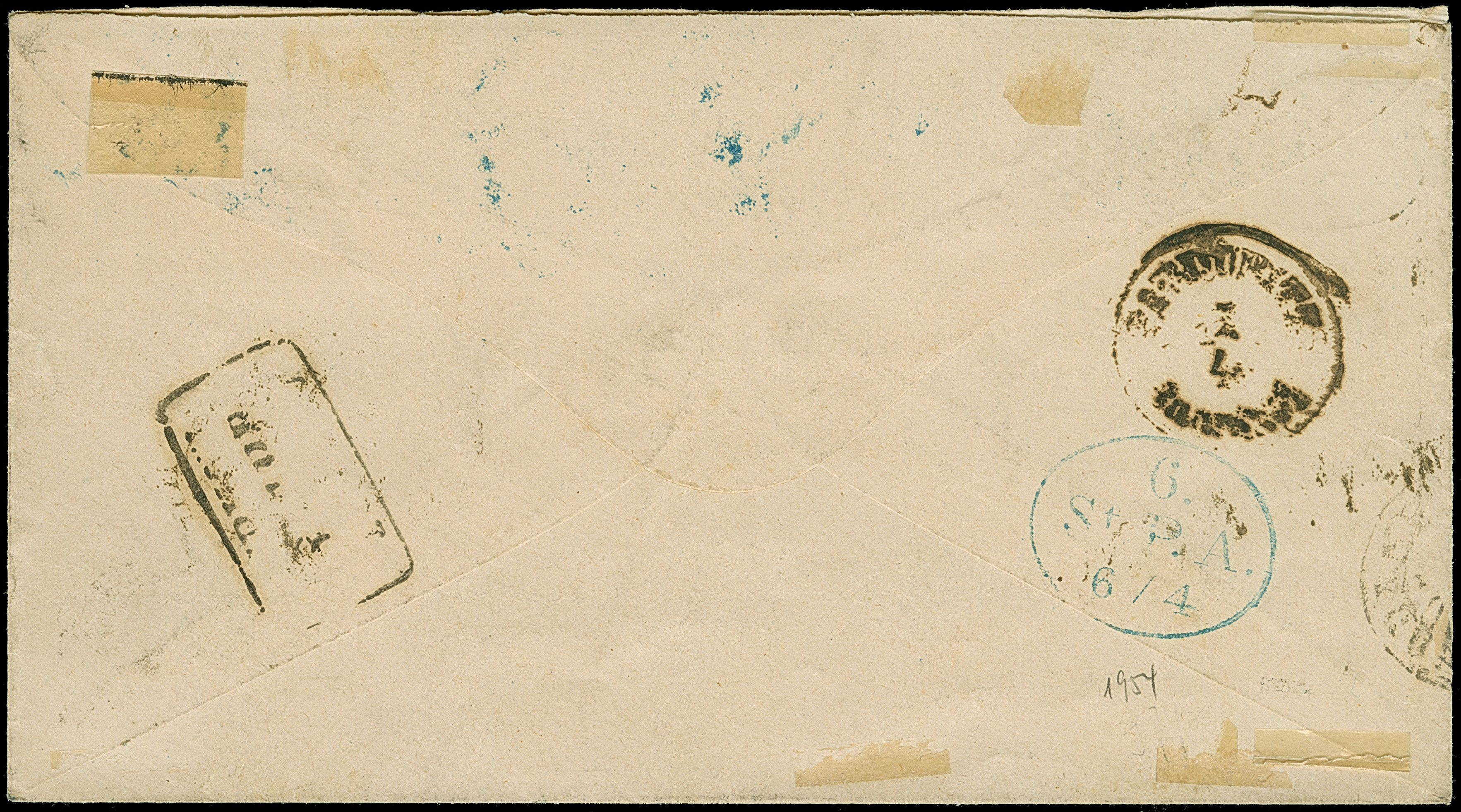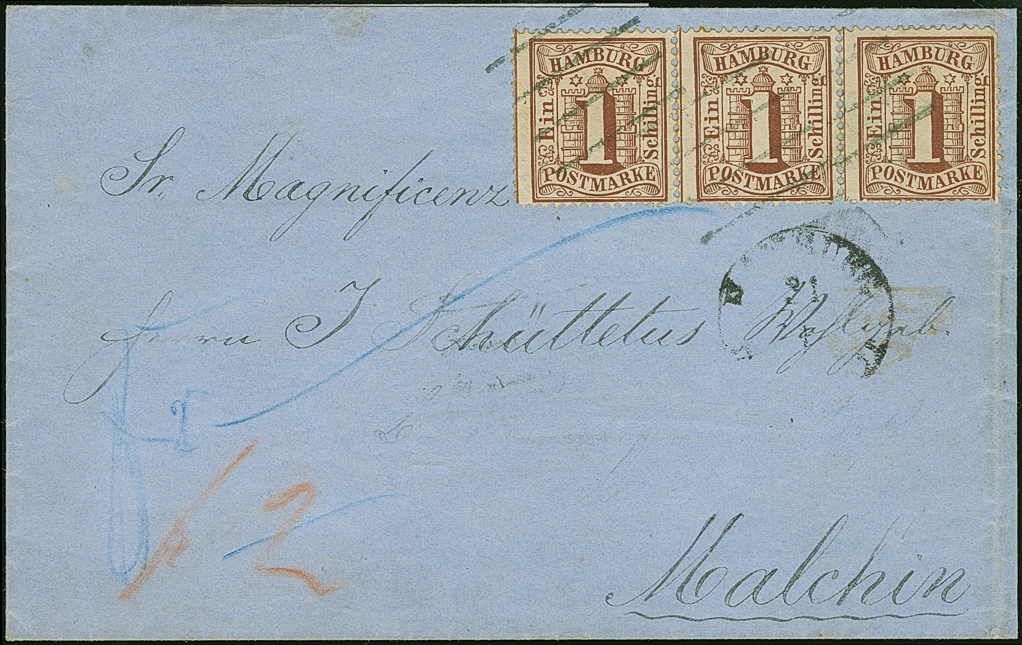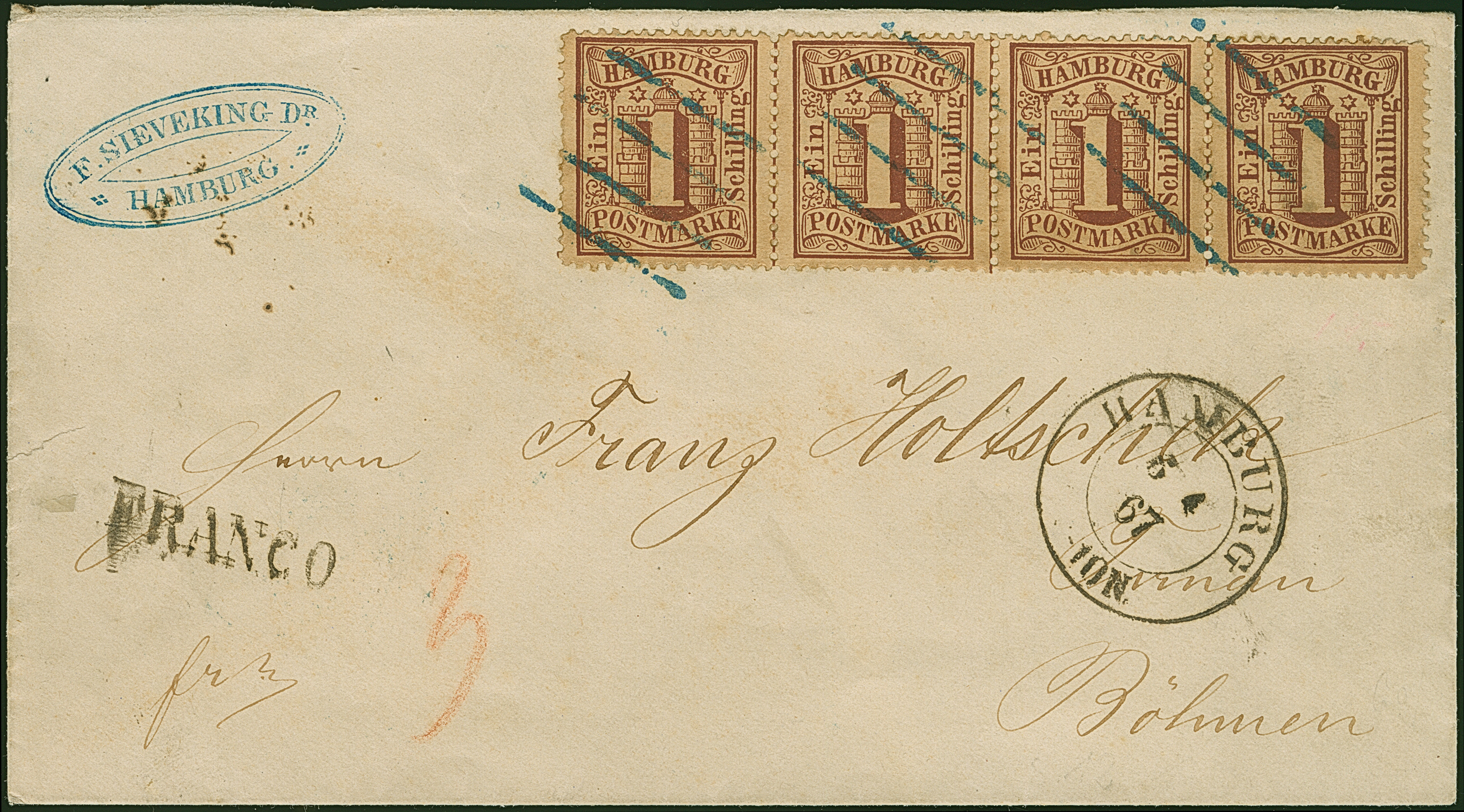 1 Sch. braun und 3 Sch. ultramarinblau, mit blauem Strichstempel und nebengesetztem EKr. “HAMBURG BAHNHOF 17 12 67” auf Briefhülle nach Bromberg. 1 Sch. kleine Aufklebefalte, sonst einwandfrei.