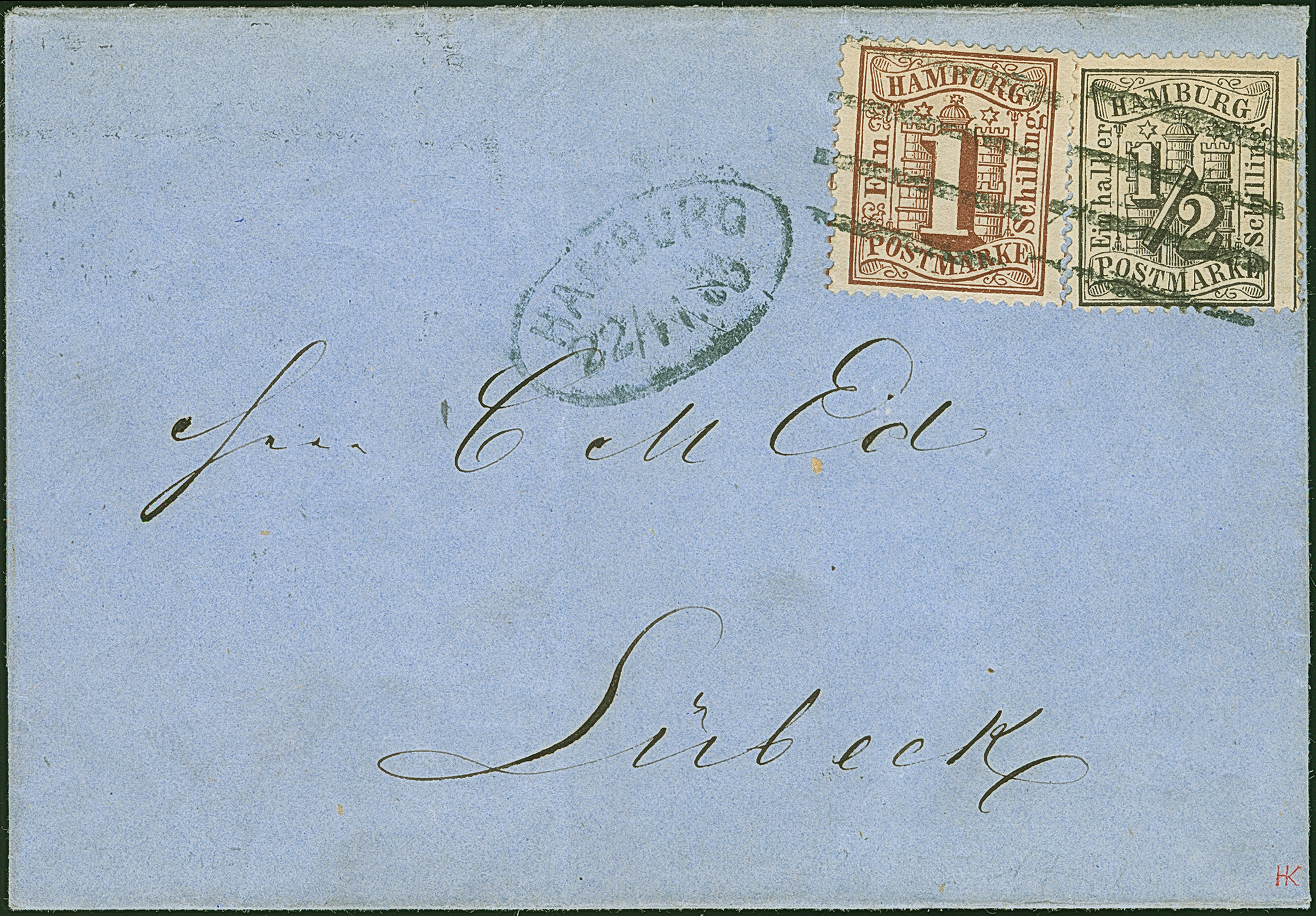 1⁄2 Sch. schwarz und 1 Sch. braun, farbfrisch und gut gezähnt, mit sauber aufgesetztem Strichstempel und nebengesetztem Ovalstempel "HAMBURG 22/11 66" auf Briefhülle nach Lübeck.