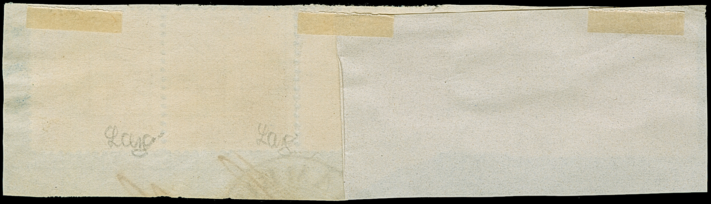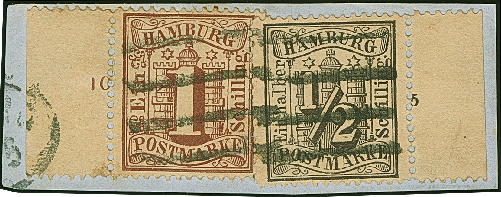 1⁄2 Sch. schwarz und 1 Sch. braun, Einzelwerte vom rechten bzw linken Bogenrand mit Reihenzählern “5” bzw “10”, mit sauber aufgesetztem Strichstempel auf kleinem Briefstück mit übergehendem Teil des nebengesetzten Ovalstempels. Die 1 Sch. am Oberrand 2 kleine Einschnitte, sonst bis auf minimale Flecken einwandfrei. Eine in dieser Form außerordentlich seltene und attraktive Kombination.