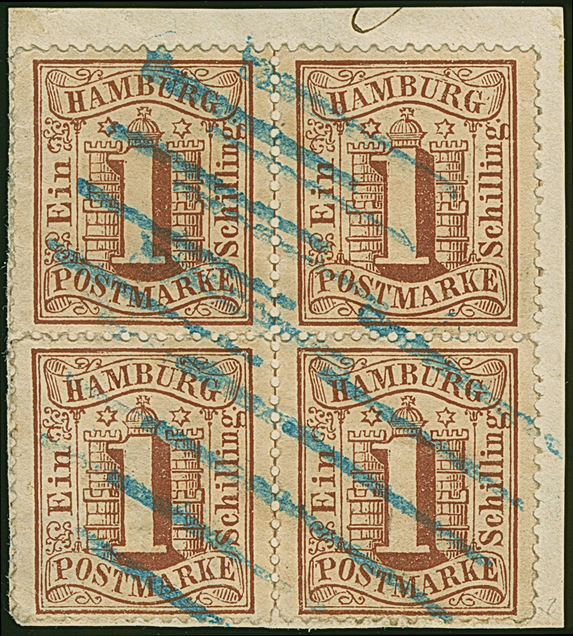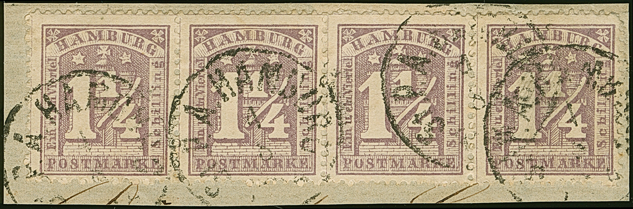 1¼ Sch. graupurpur im waagerechten Viererstreifen, mit EKr. “St.P.A.HAMBURG 4 8” auf kleinen Briefstück. Eine recht seltene Einheit.