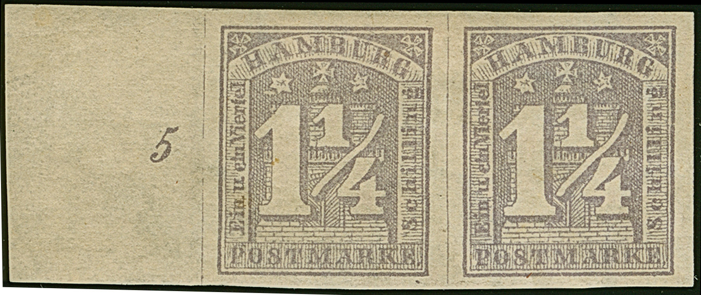 1¼ Sch. graupurpur, ungezähntes waagerechtes Paar, allseits breitrandig, links mit breitem Bogenrand mit Reihenzähler “5”, ungebraucht mit Originalgummi. Äußerst selten; außer einem Viererblock hat Profi keine weiteren Einheiten dieser Abart registriert.