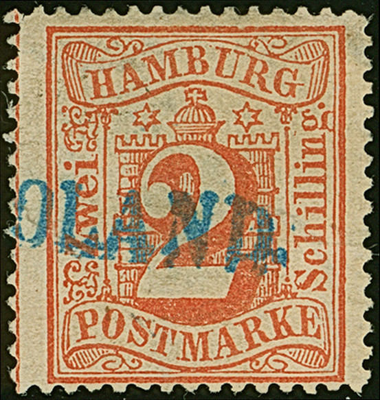 2 Schilling orangerot, farbfrisch mit klarem Teilabschlag des blauen L1 "HELGO(LAND)". Linker oberer Eckzahn lose, sonst einwandfrei. Ein schönes Stück aus der II. Verwendungsperiode der Hamburger Marken.