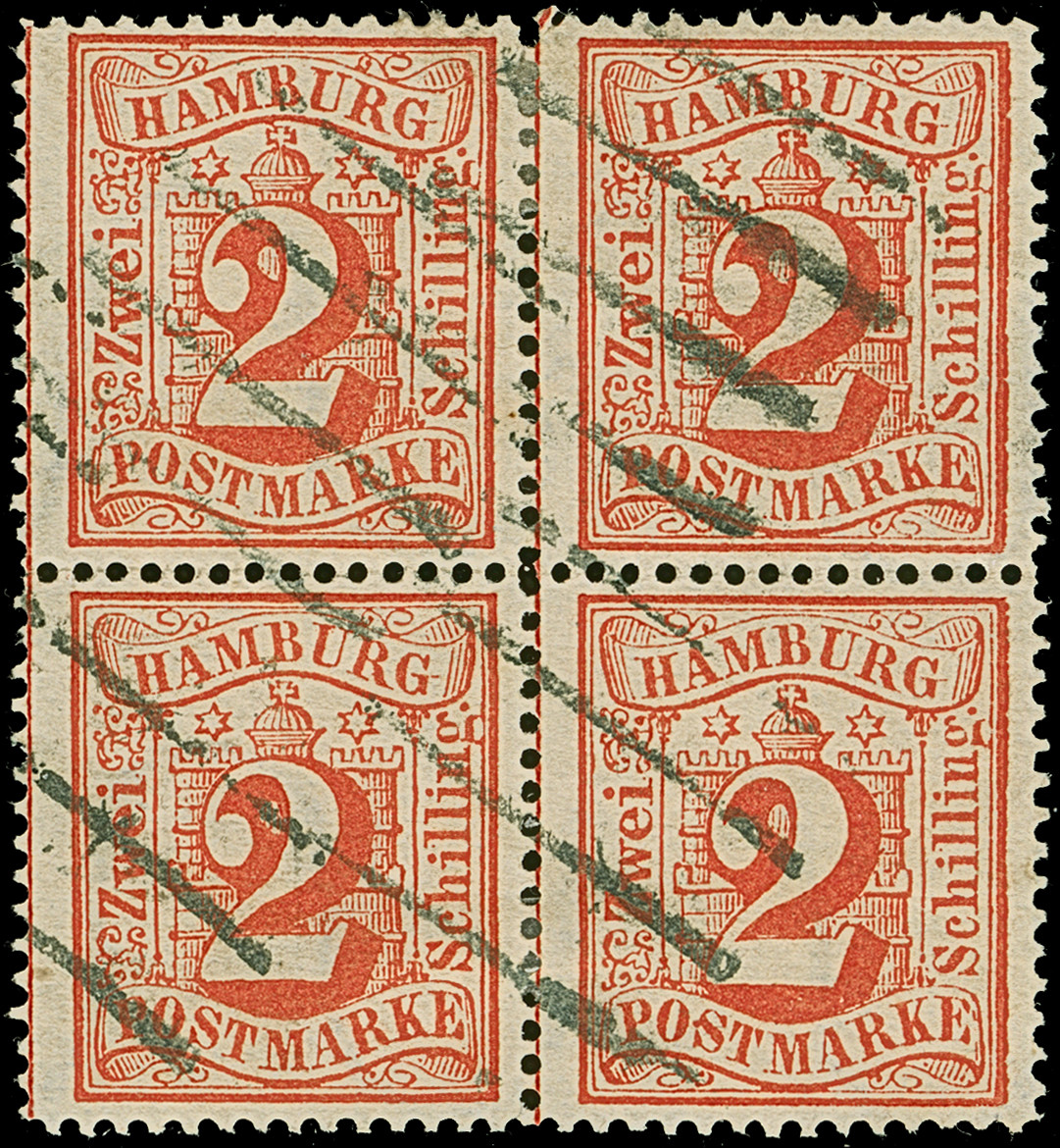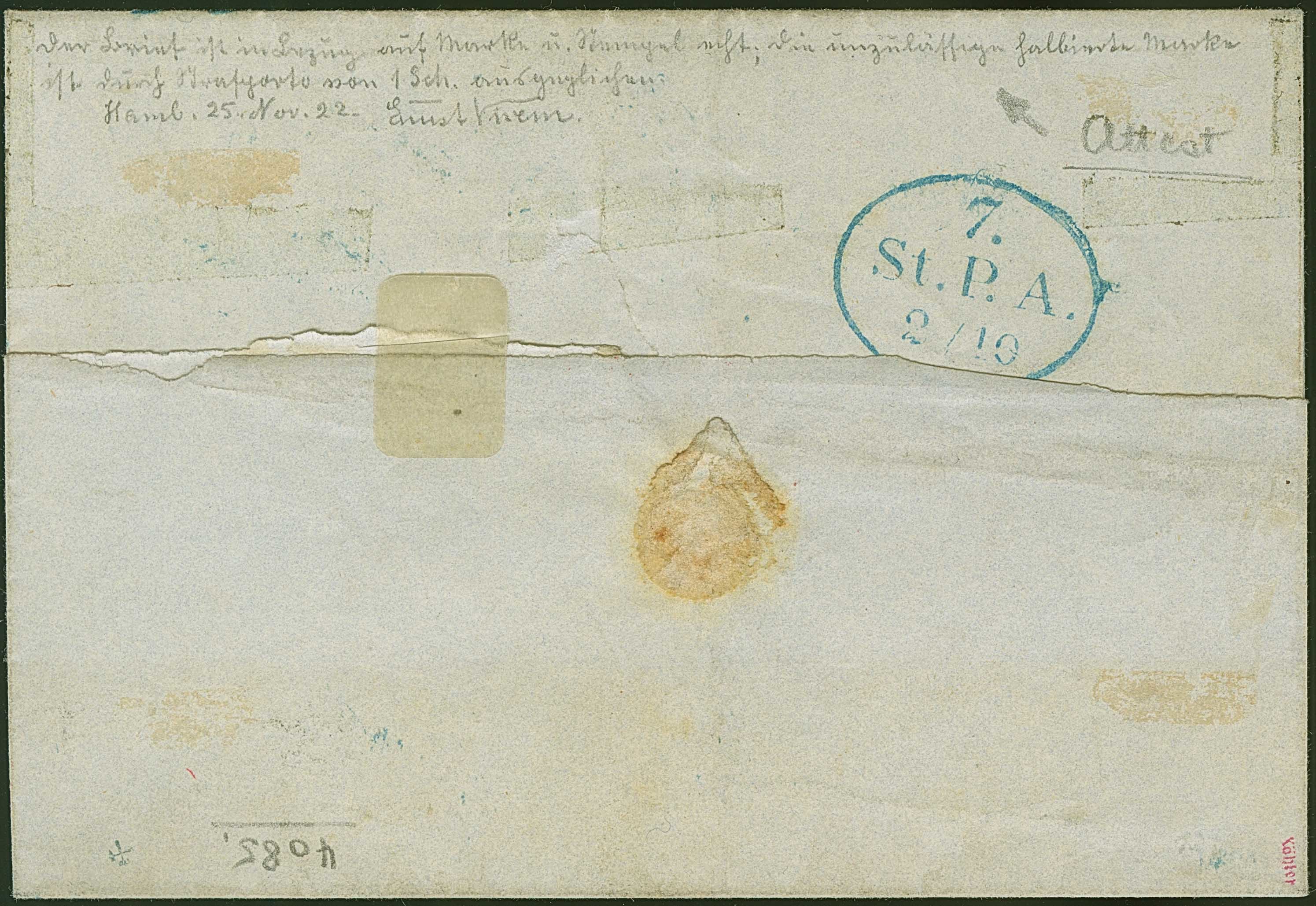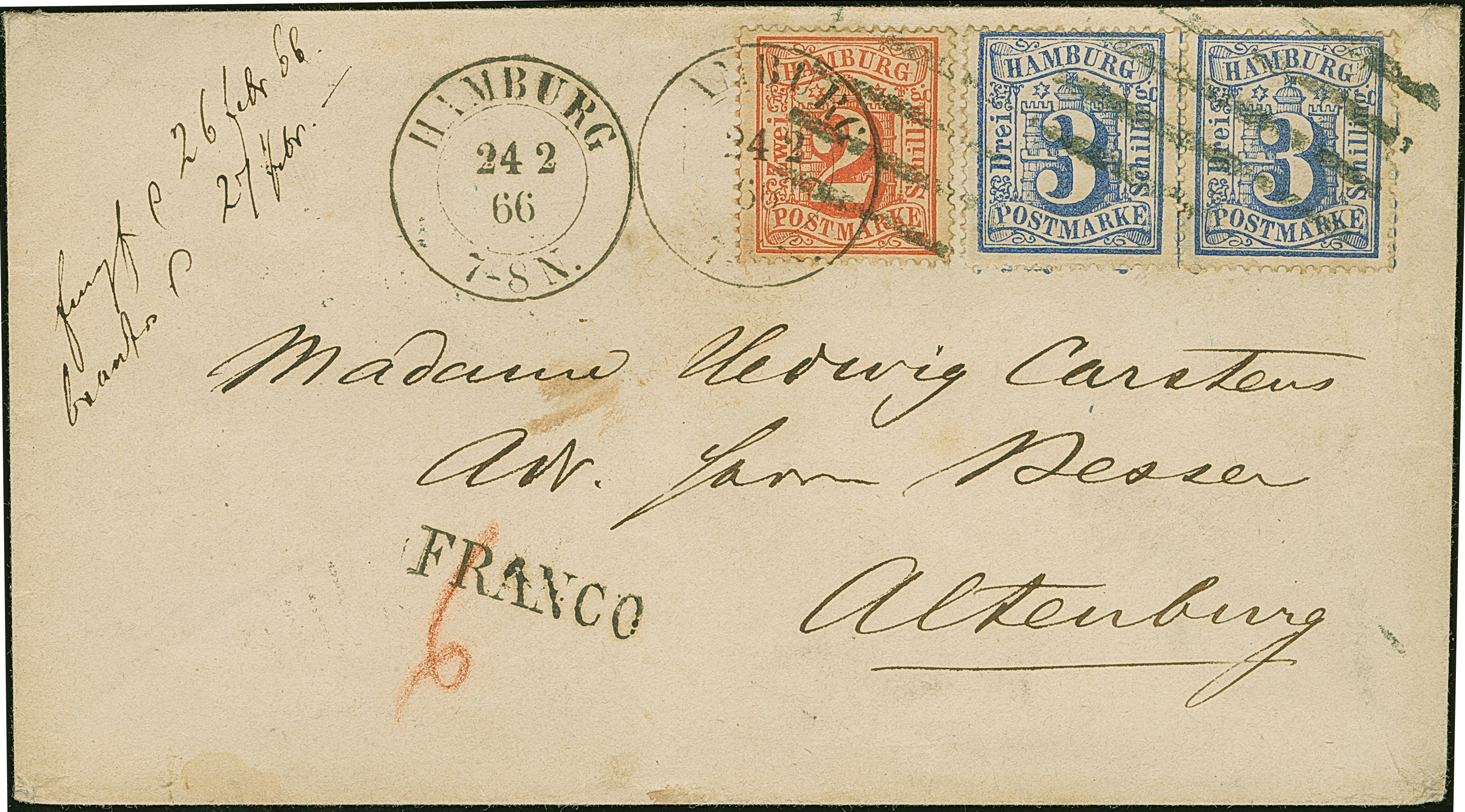 2 Sch. orangerot und 3 Sch. ultramarinblau im waagerechten Paar, mit Duplex-Entwertung durch schwarzen Strichstempel und DKr. “HAMBURG 24 2 66” auf Briefkuvert der 2.Gewichtsstufe nach Altenburg, mit nebengesetztem L1 “FRANCO”. Eine In dieser Kombination wohl einmalige 8 Schilling-Frankatur.