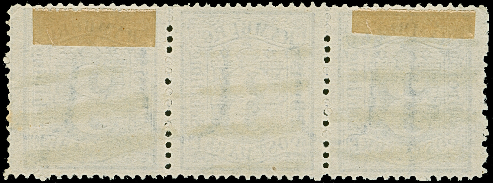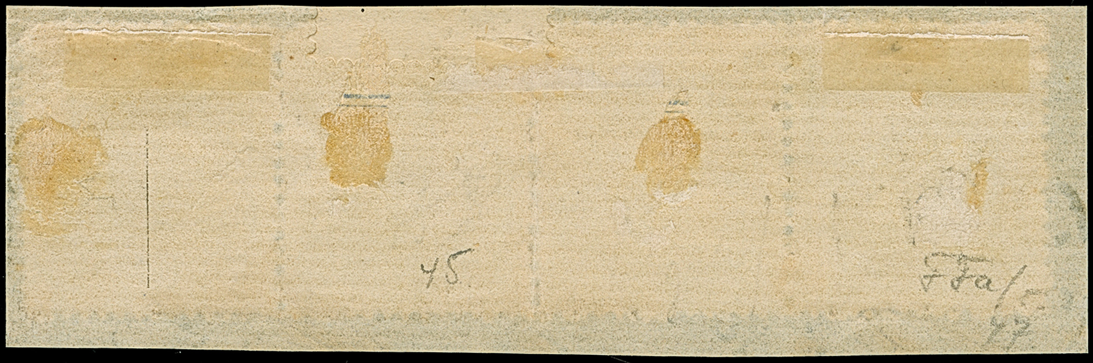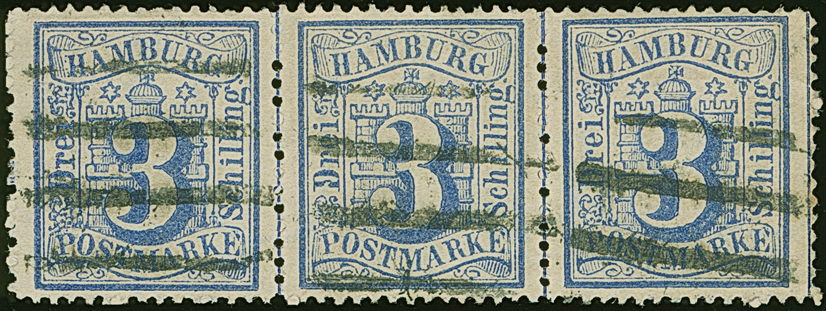 3 Sch. preußischblau im waagerechten 3er-Streifen, sauber entwertet durch schwarzen Strichstempel. Größte registrierte Einheit dieser Marke; PROFI hat nur einen weiteren 3er-Streifen registriert.