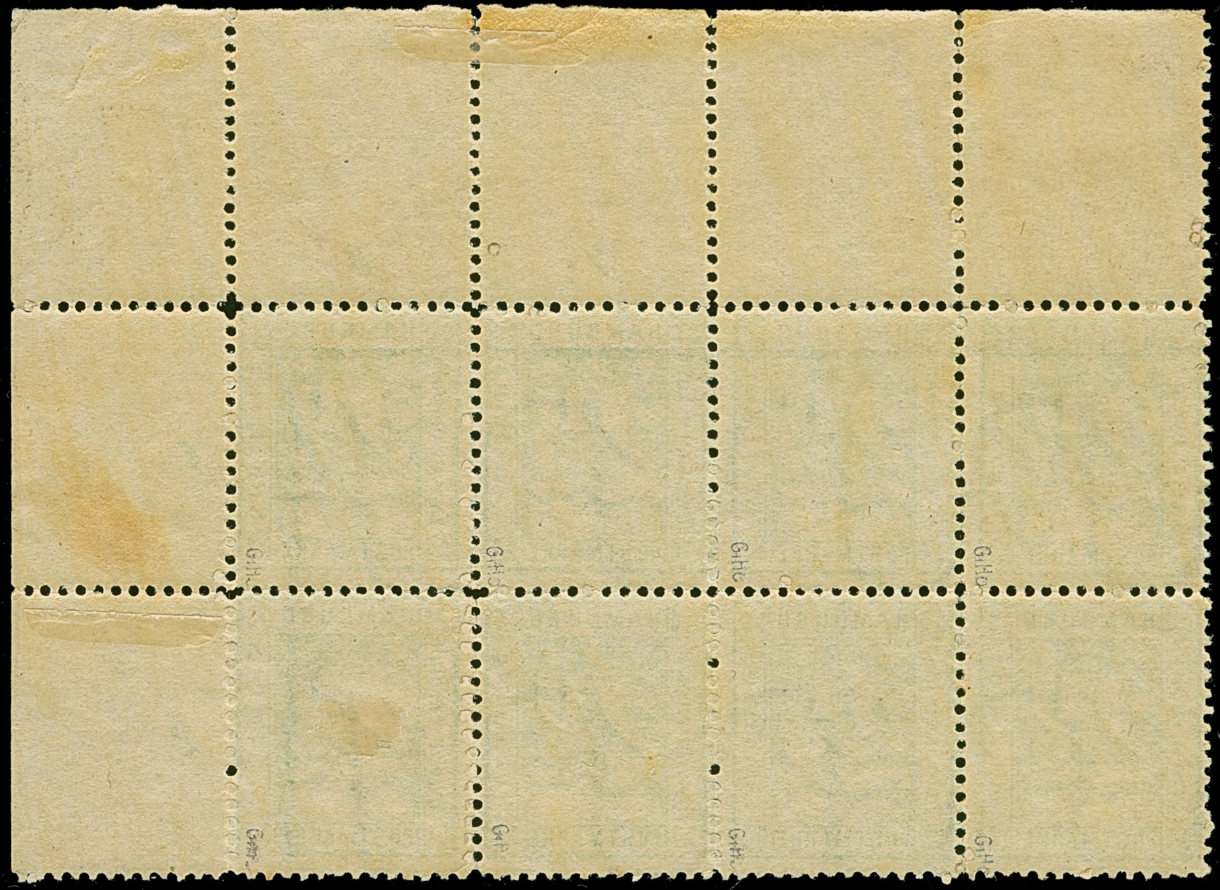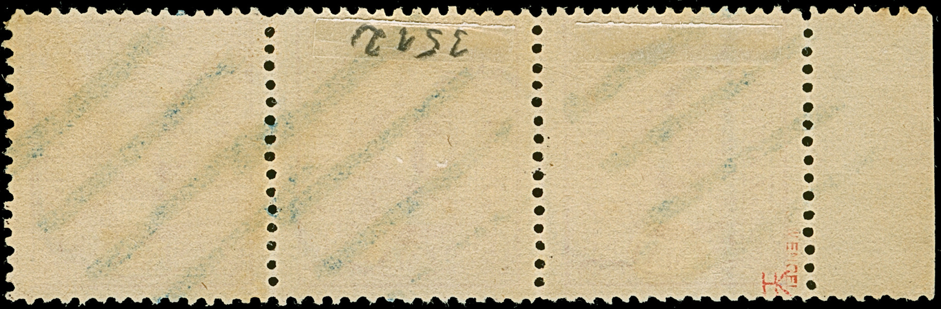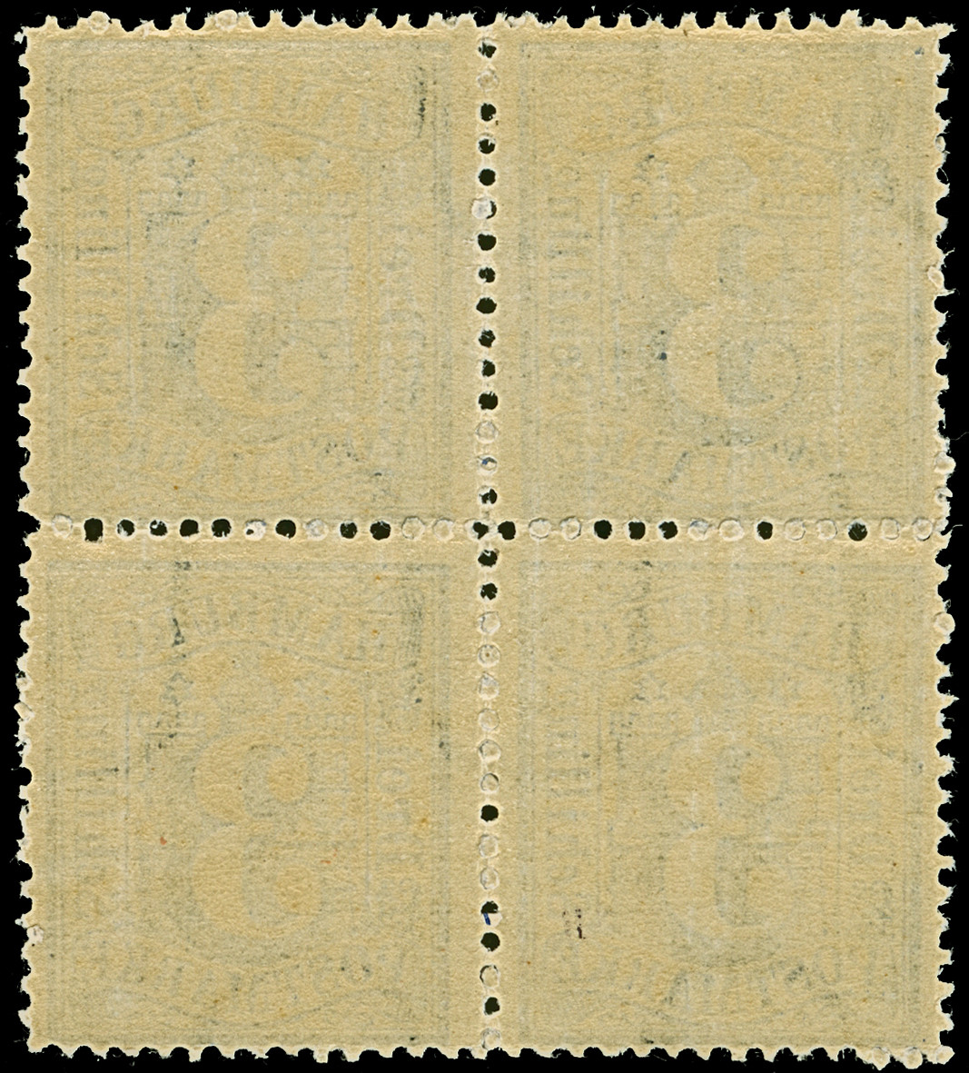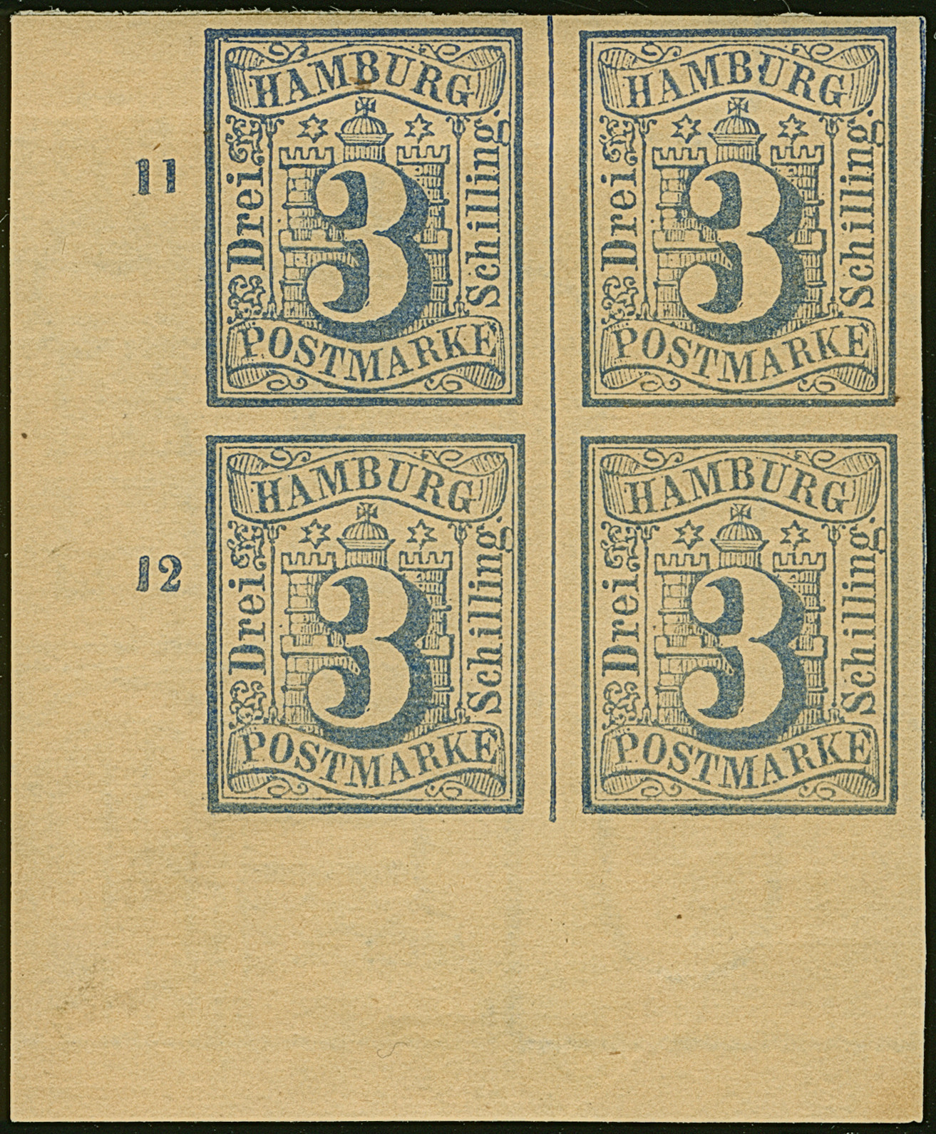 3 Sch. ultramarin, ungezähnt, im 4er-Block aus der linken unteren Bogenecke mit Reihenzählern “11” und “12” und großem Teil des Wasserzeichen 'Turm' in den beiden linken Werte und dem Bogenrand, ungebraucht mit Originalgummi. In dieser Form eine sehr seltene Einheit.