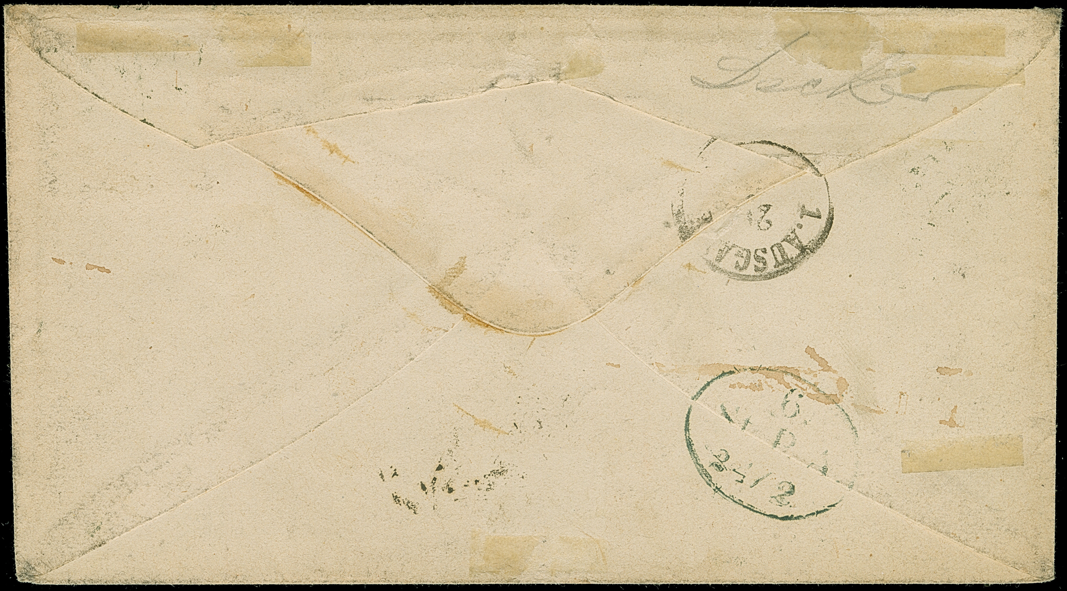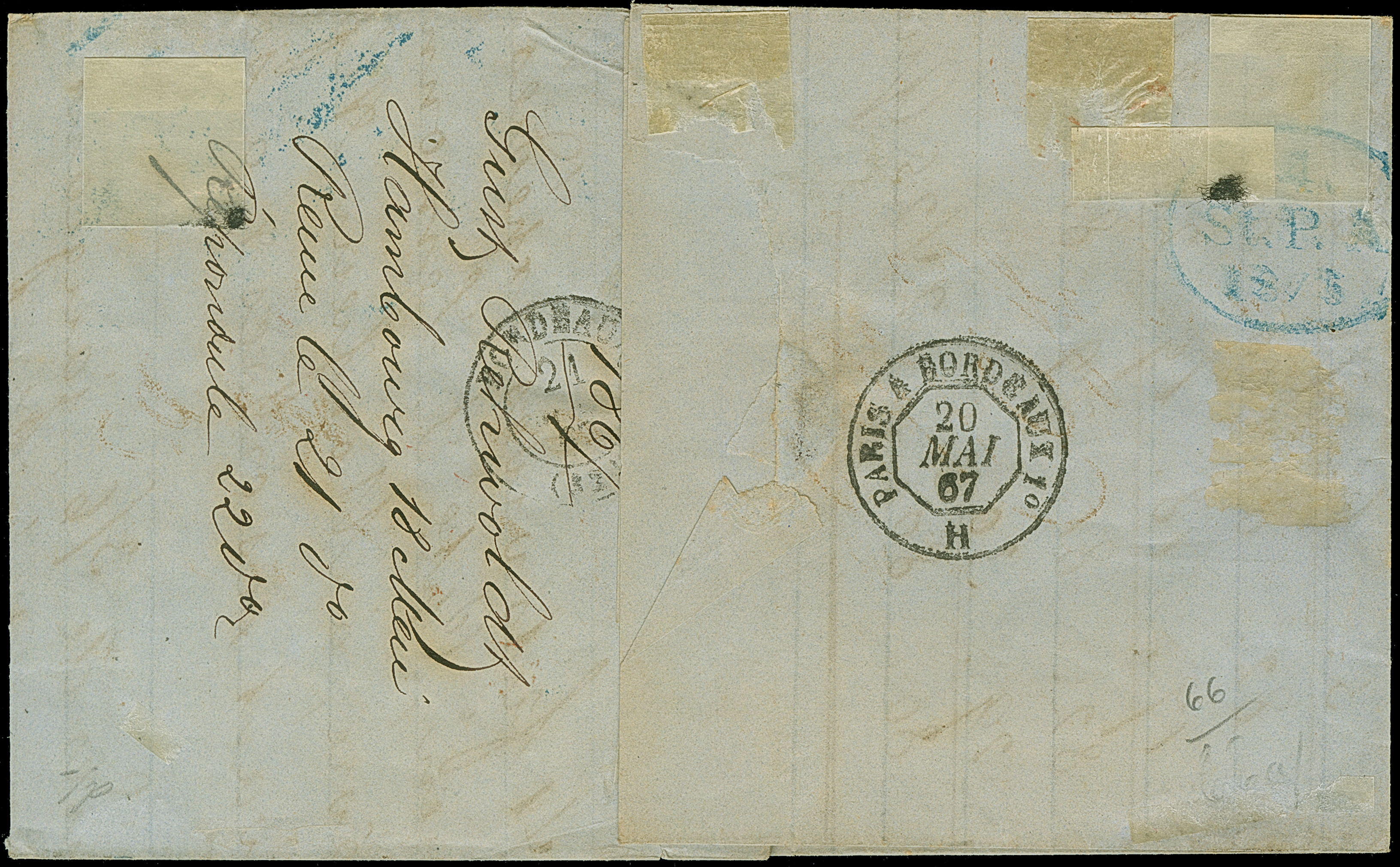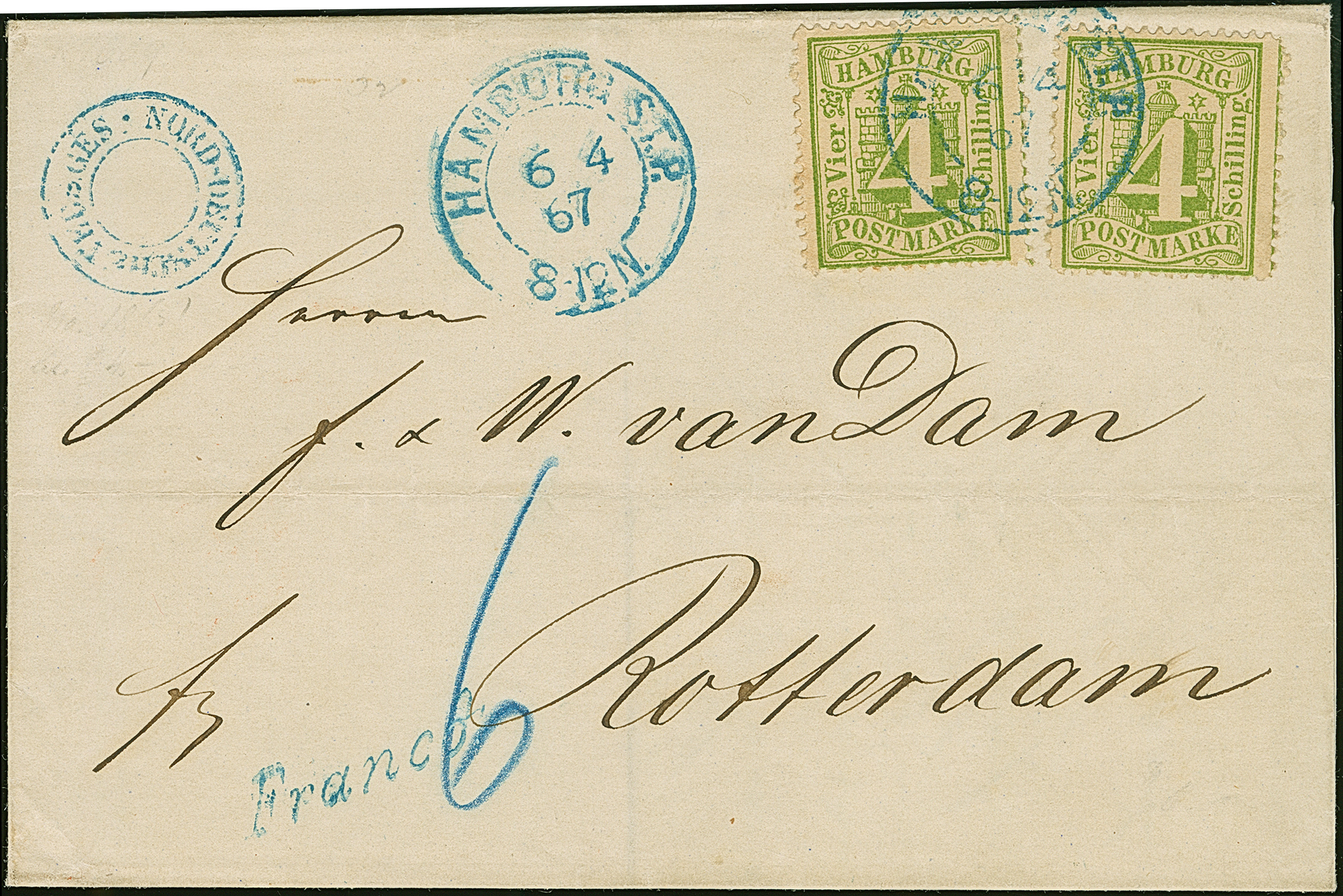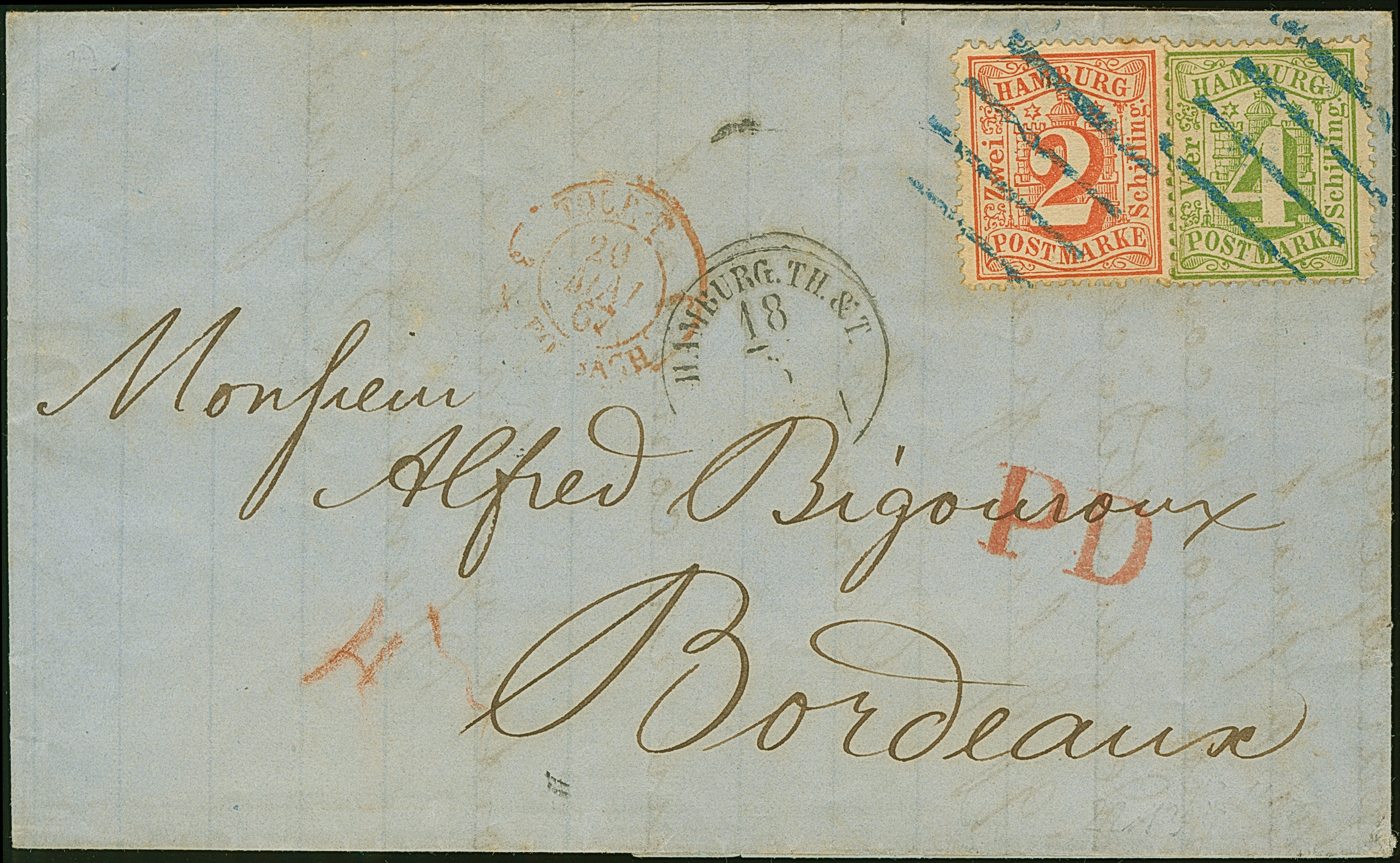 2 Sch. orangerot und 4 Sch. grün, beide farbfrisch und gut gezähnt mit blauem Strichstempel und nebengesetztem Taxis-EKr. "HAMBURG TH.&T. 18/5" (1867) auf Faltbrief nach Bordeaux. Ein Zähnchen gering fleckig, sonst einwandfrei.