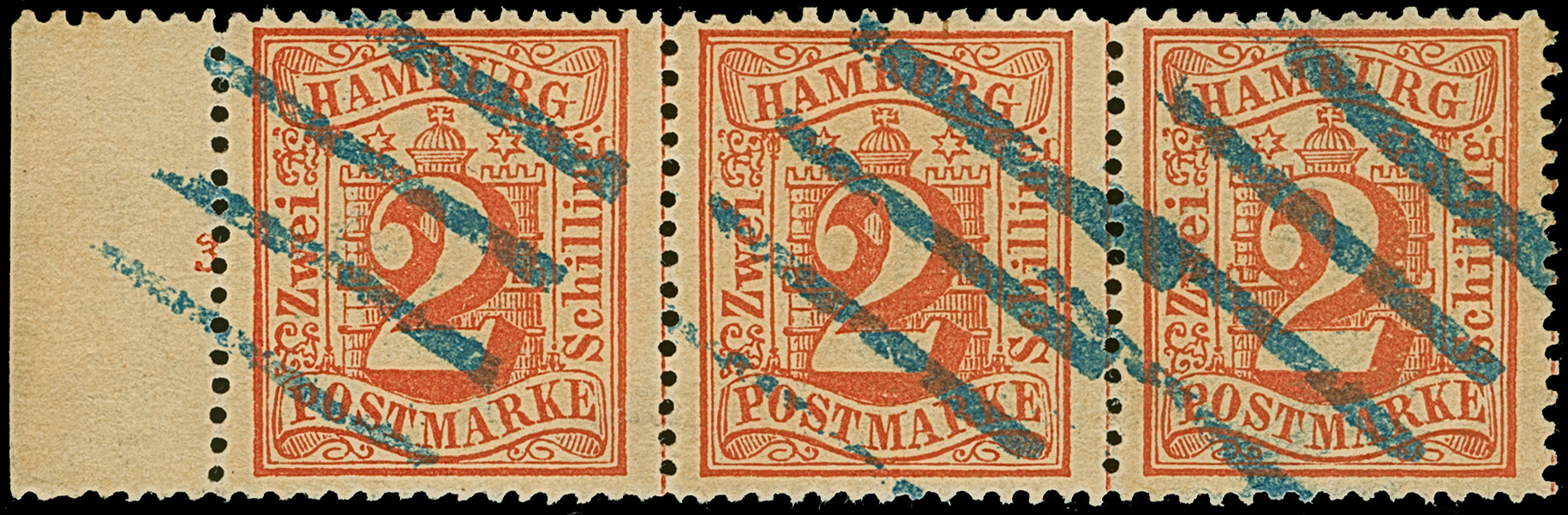 2 Sch. orangerot im waagerechten 3er Streifen, links mit Bogenrand mit Reihenzähler "3", farbfrisch und gut gezähnt, sauber entwertet durchblauen Strichstempel. Eine attraktive und seltene Einheit in sehr schöner Erhaltung.