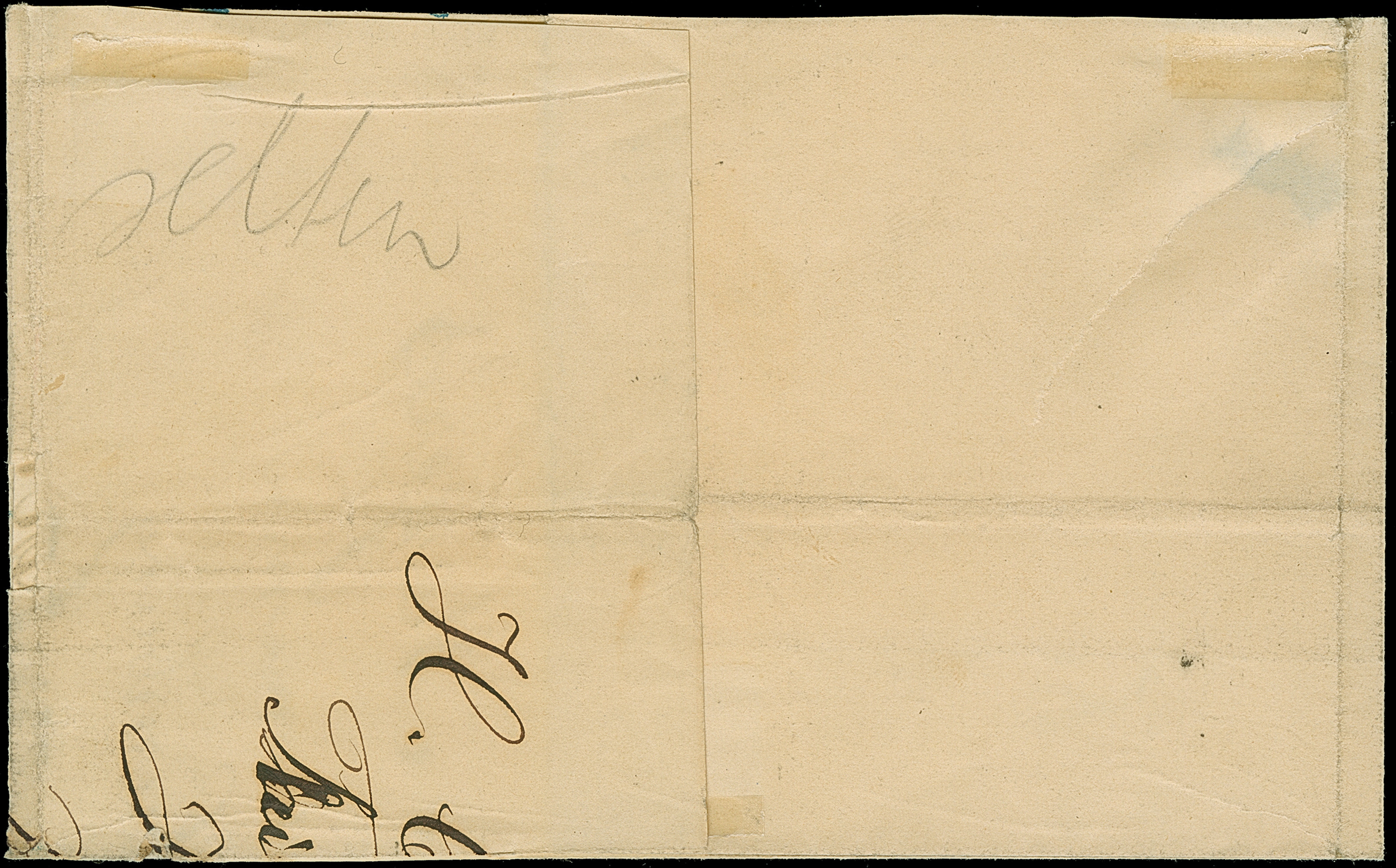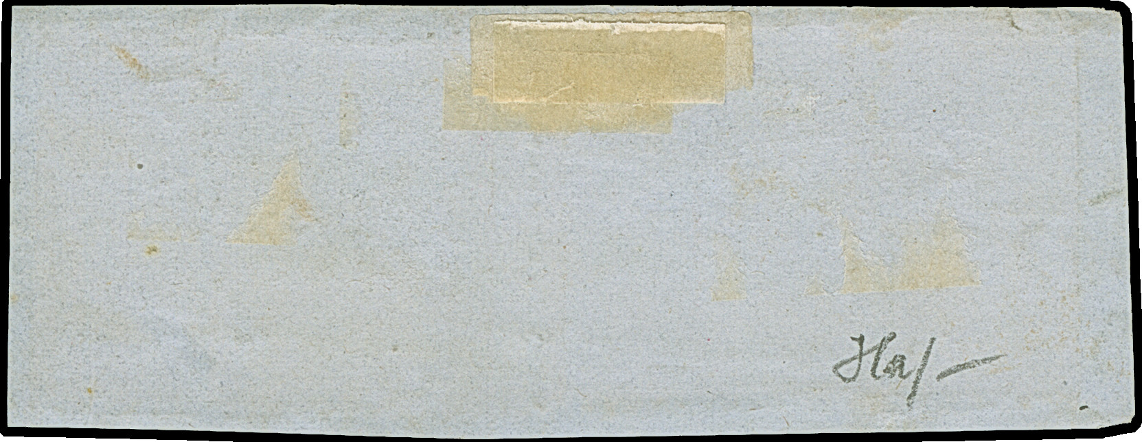 aufgesetztem blauen Strichstempel auf Briefstück. Etwas gereinigt.