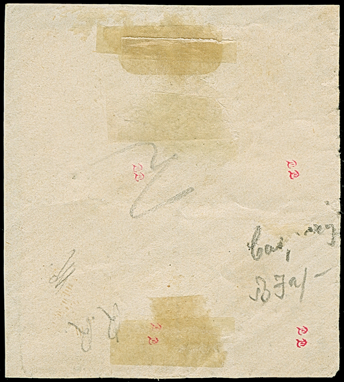 1¼ Sch. graupurpur, linkes Randstück mit breitem Bogenrand und Reihenzähler “4”, mit sauber aufgesetzter Nr. “2” auf Briefstück. Etwas gereinigt, sonst einwandfrei.