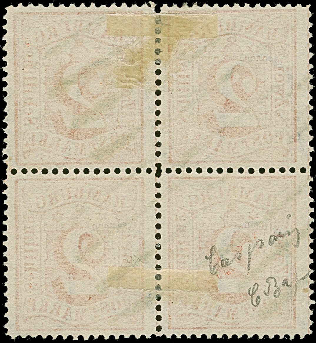 1 Sch. braun im Viererblock, farbfrisch und gut gezähnt, mit sauber aufgesetztem blauen Strichsstempeln auf Briefstück. Links unten winzig bestoßen, sonst einwandfrei. Größte registrierte Blockeinheit dieser Marke und Unikat.