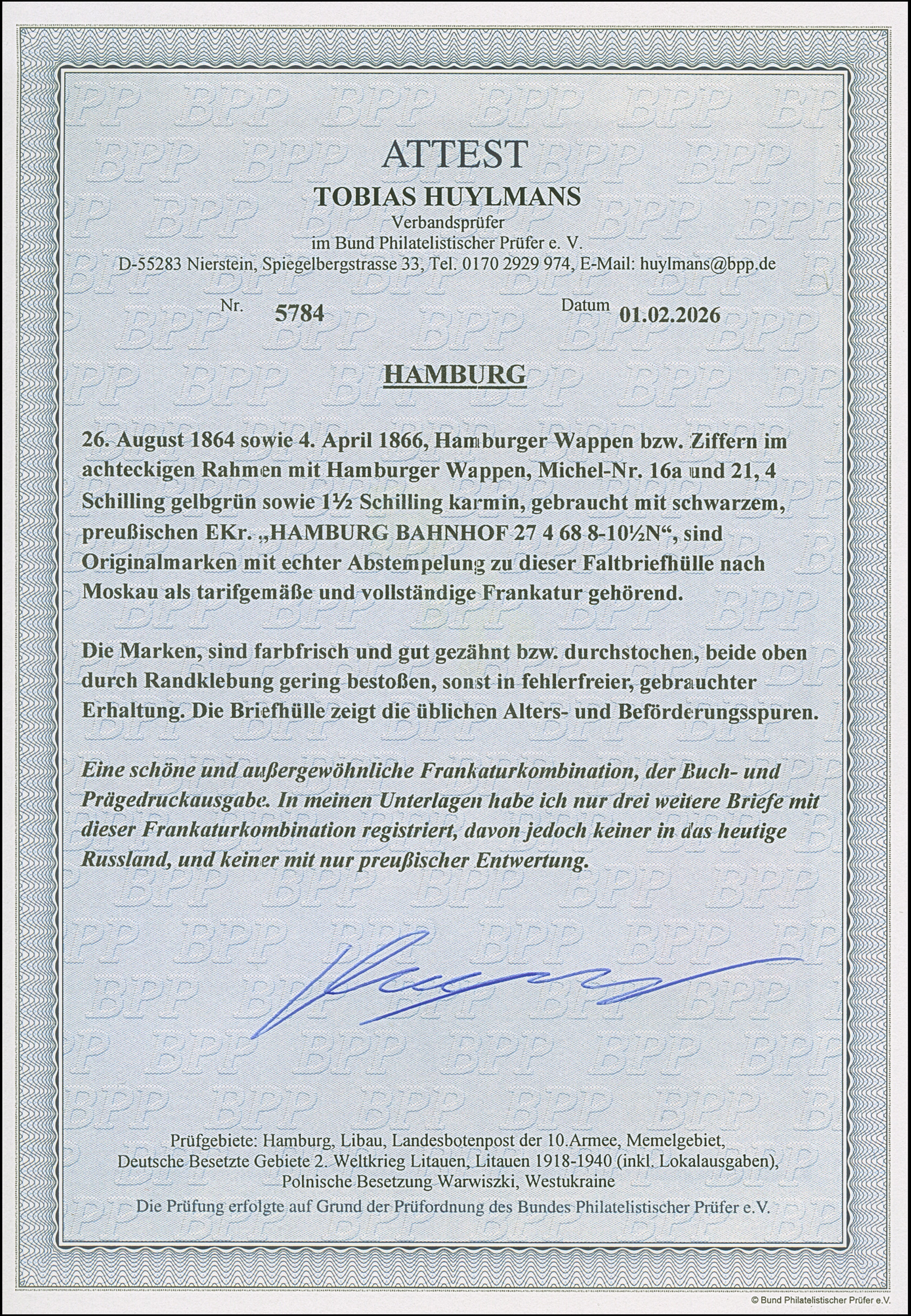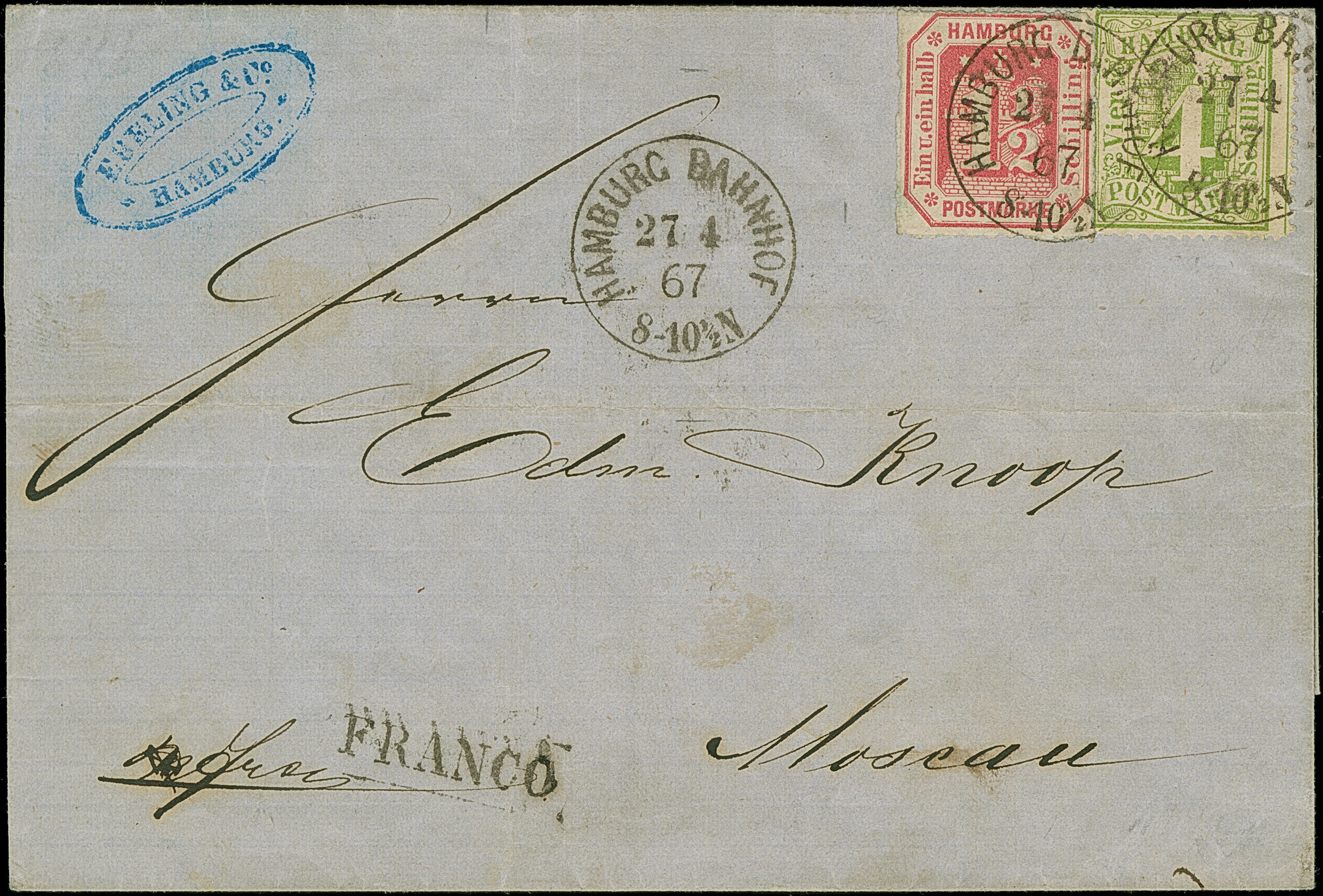 4 Sch. grün in Mischfrankatur mit Prägedruckausgabe 1½ Sch. karmin, je farbfrisch und gut gezähnt bzw. durchstochen, mit jeweils sauber auf- und nebengesetztem preußischen EKr. “HAMBURG BAHNHOF 27 4 67” auf Briefhülle nach Moskau. Beide Werte durch Randklebung oben winzig gestoßen, sonst einwandfrei. Eine sehr schöne und außergewöhnliche Frankaturkombination der Buch- und Prägedruckausgabe. ProFi hat nur drei weitere Briefe mit dieser Kombination registriert, davon jedoch keiner in das heutige Russland gelaufen, sowie keiner mit nur preußischer Entwertung. Fotoattest Huylmans BPP (2026)