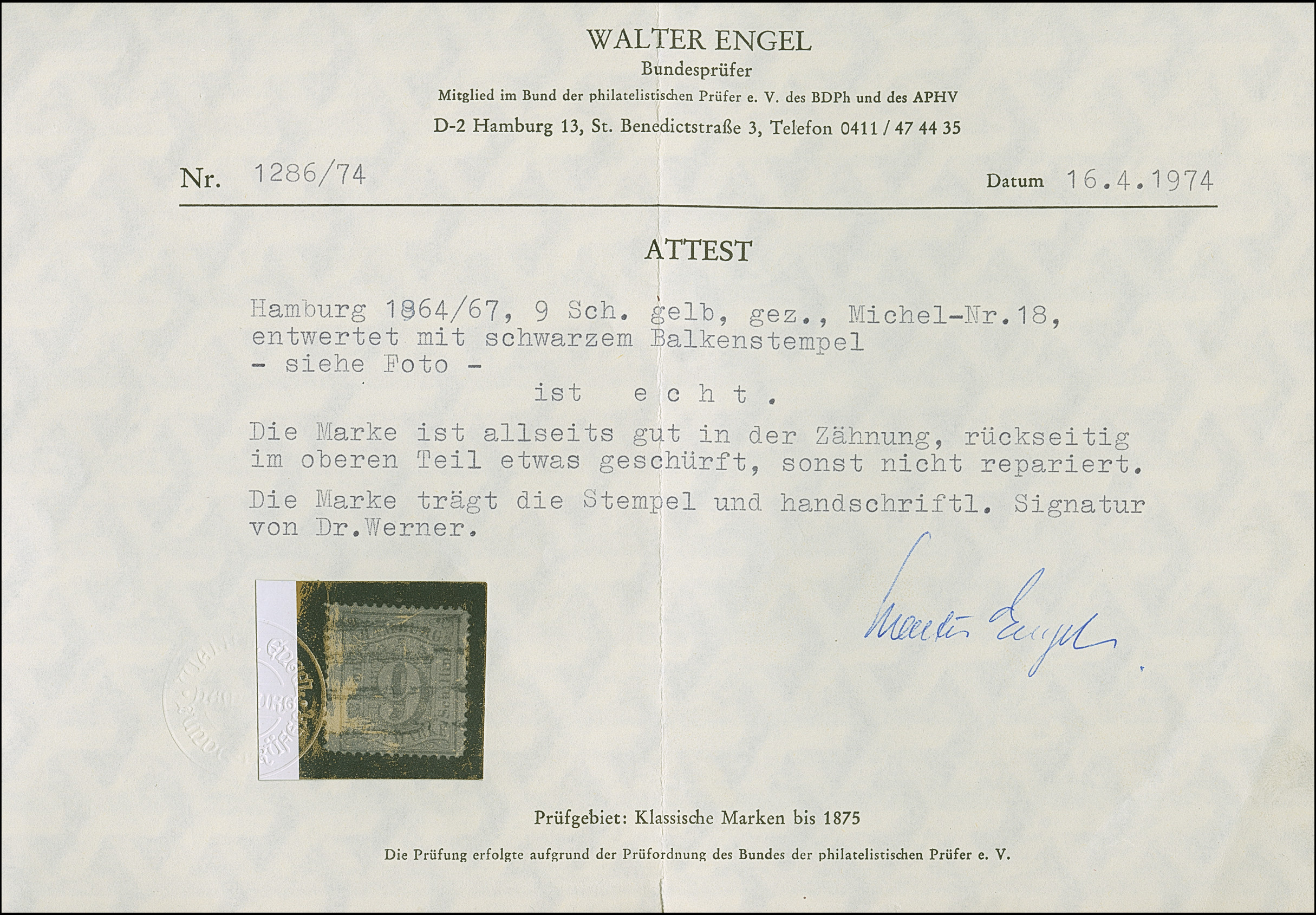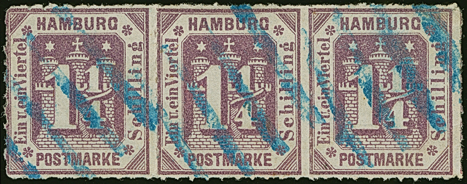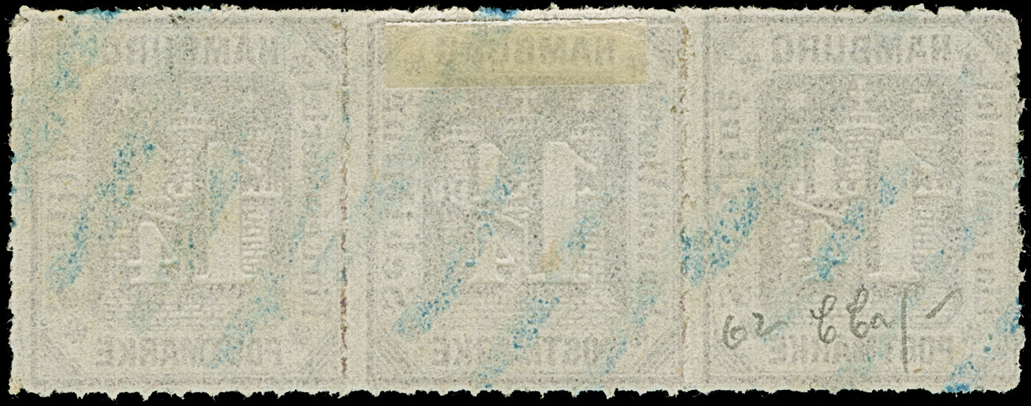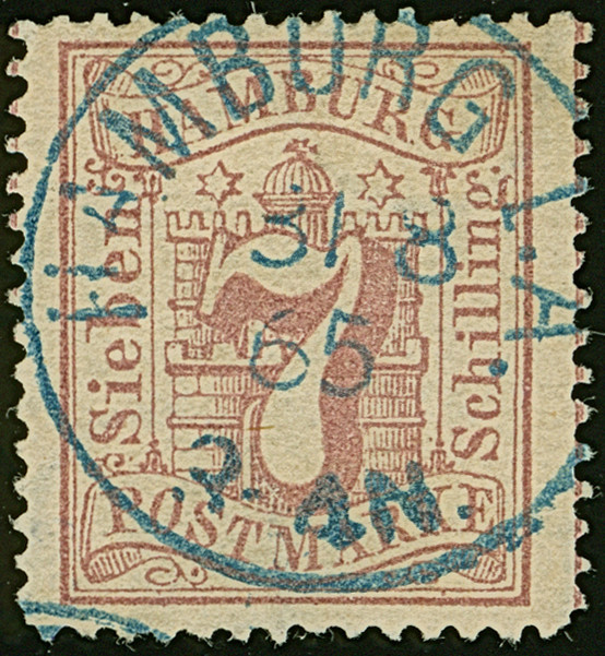 7 Sch. graulila, farbfrisch und gut gezähnt, mit zentrisch und klar aufgesetztem blauen EKr. "HAMBURG I.A. 3/8 65". Dieser Stempel für die I. Abteilung des Stadt Postamtes ist in der Literatur nicht gelistet; möglicherweise handele sich um einen Probeabschlag. PROFI hat nur einen weiteren registriert.