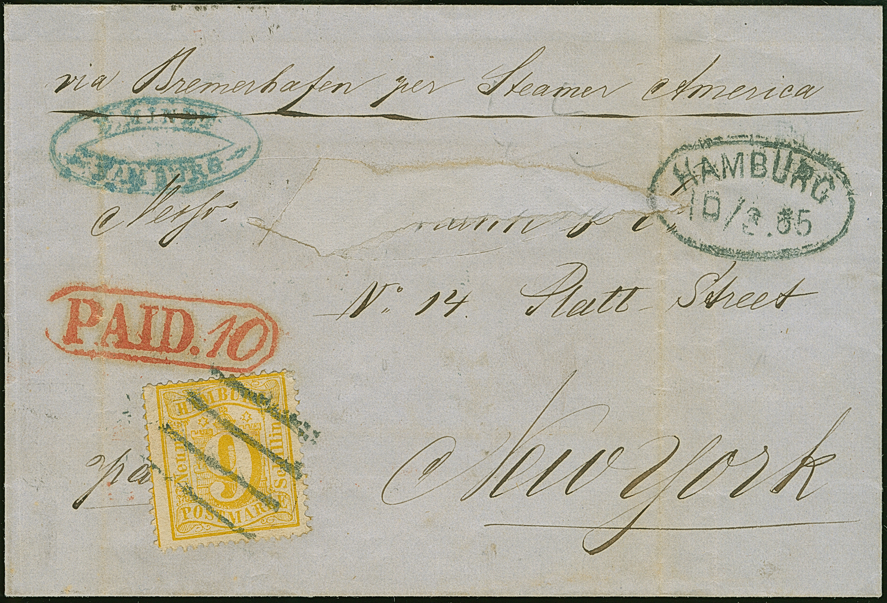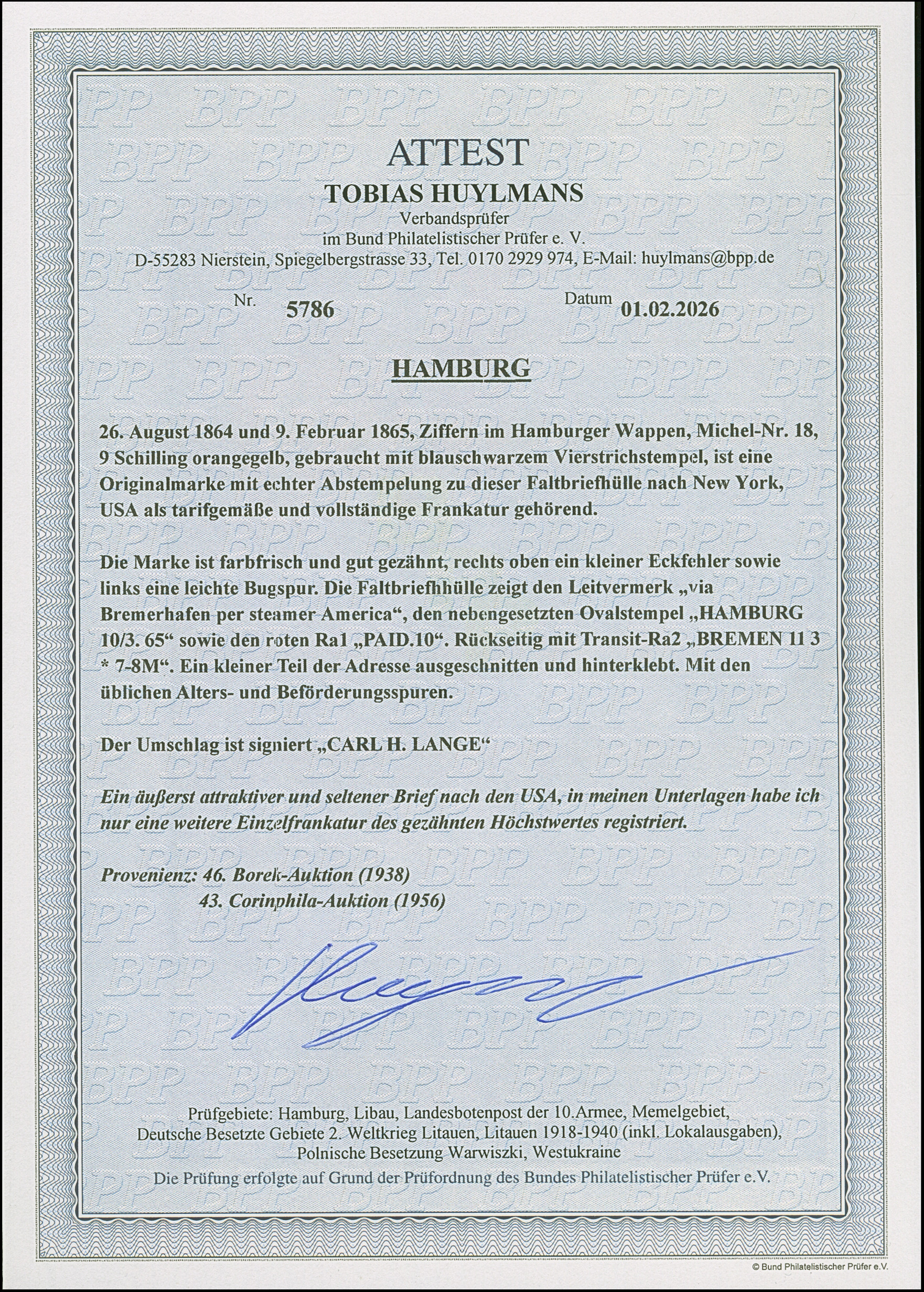 9 Sch. orangegelb, farbfrisch und gut gezähnt, mit blauem Strichstempel und nebengesetztem Ovalstempel “HAMBURG 10/3.65” auf Briefhülle über Bremen nach New York. Der Name aus der Adresse ausgeschnitten und hinterlegt, die rechte obere Ecke der Marke etwas fehlerhaft und die linke etwas knittrig; insgesamt sehr schöne und frische Erhaltung. Eine äußerst seltene Frankatur; wir haben nur eine weitere Einzelfrankatur des gezähnten Höchstwertes registriert. Signiert Carl H. Lange sowie Fotoattest Huylmans BPP (2026)