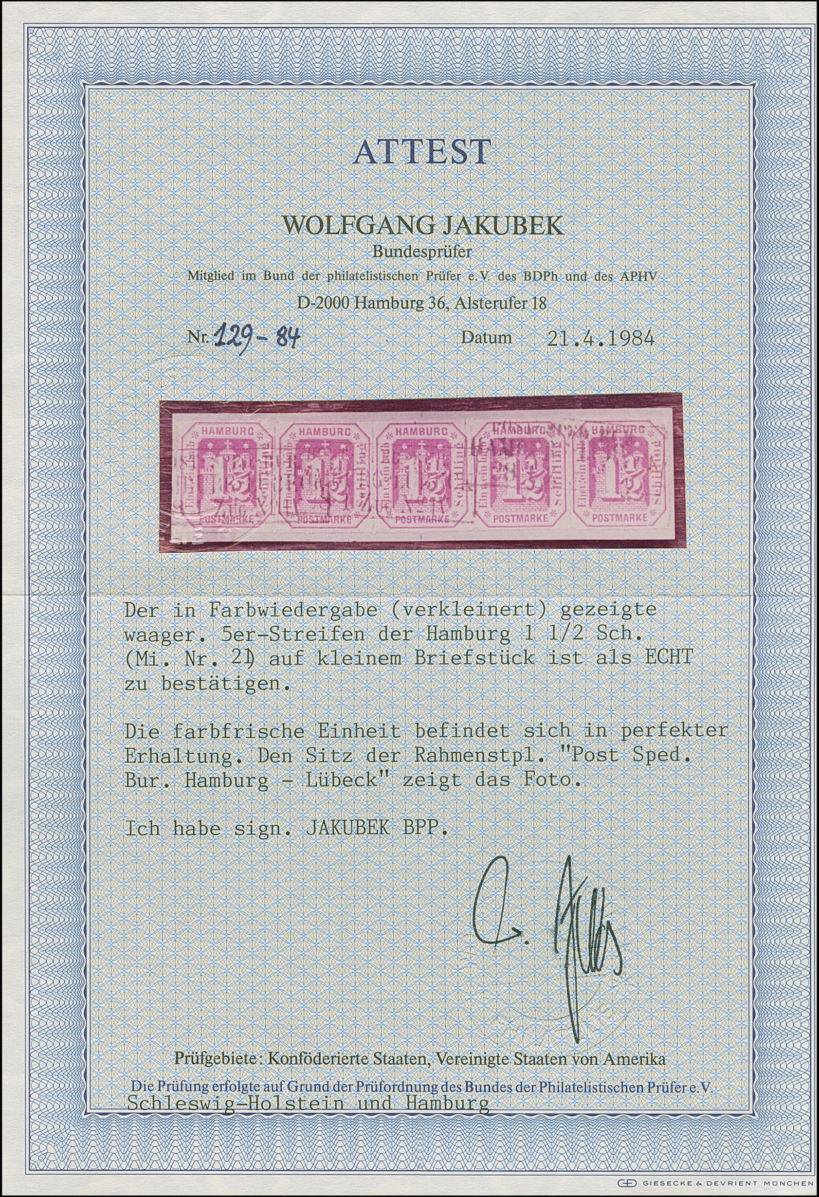 1½ Sch. rosakarmin im waagerechten 5er-Streifen, farbfrisch und einwandfrei durchstochen, mit äußerst seltener Entwertung durch mehrfach aufgesetztem Ra2 “POST SPED.BUR.HAMBURG-LÜBECK, ZUG Nr. 4" auf Briefstück. Größte bekannte Einheit dieser Marke; PROFI hat nur einen weiteren 5er-streifen registriert.