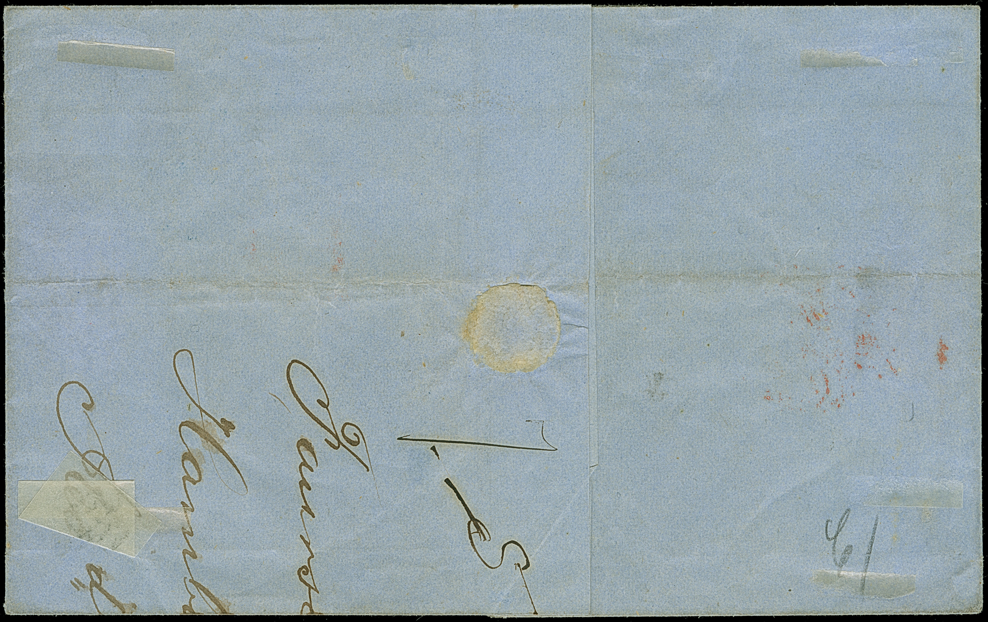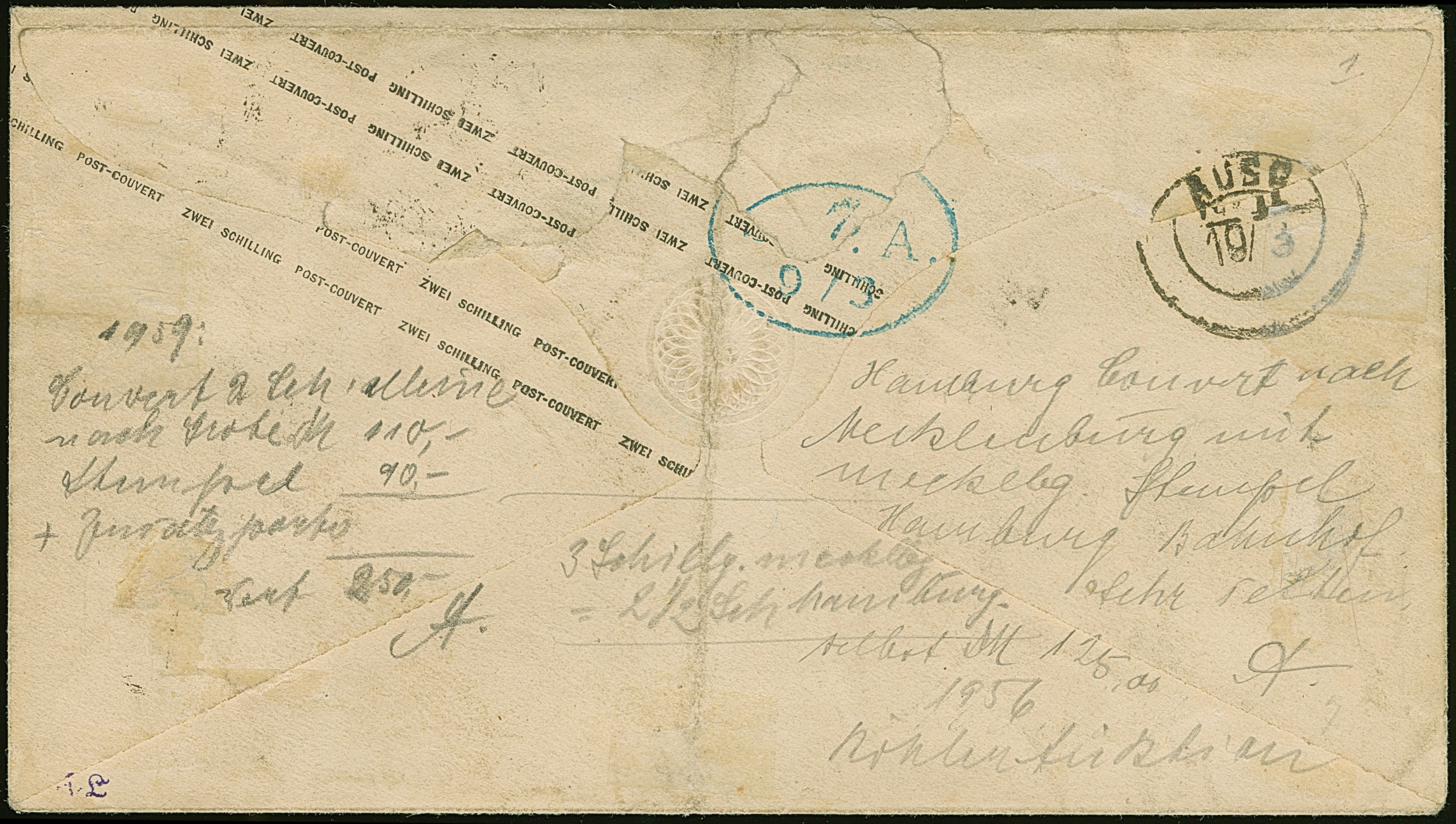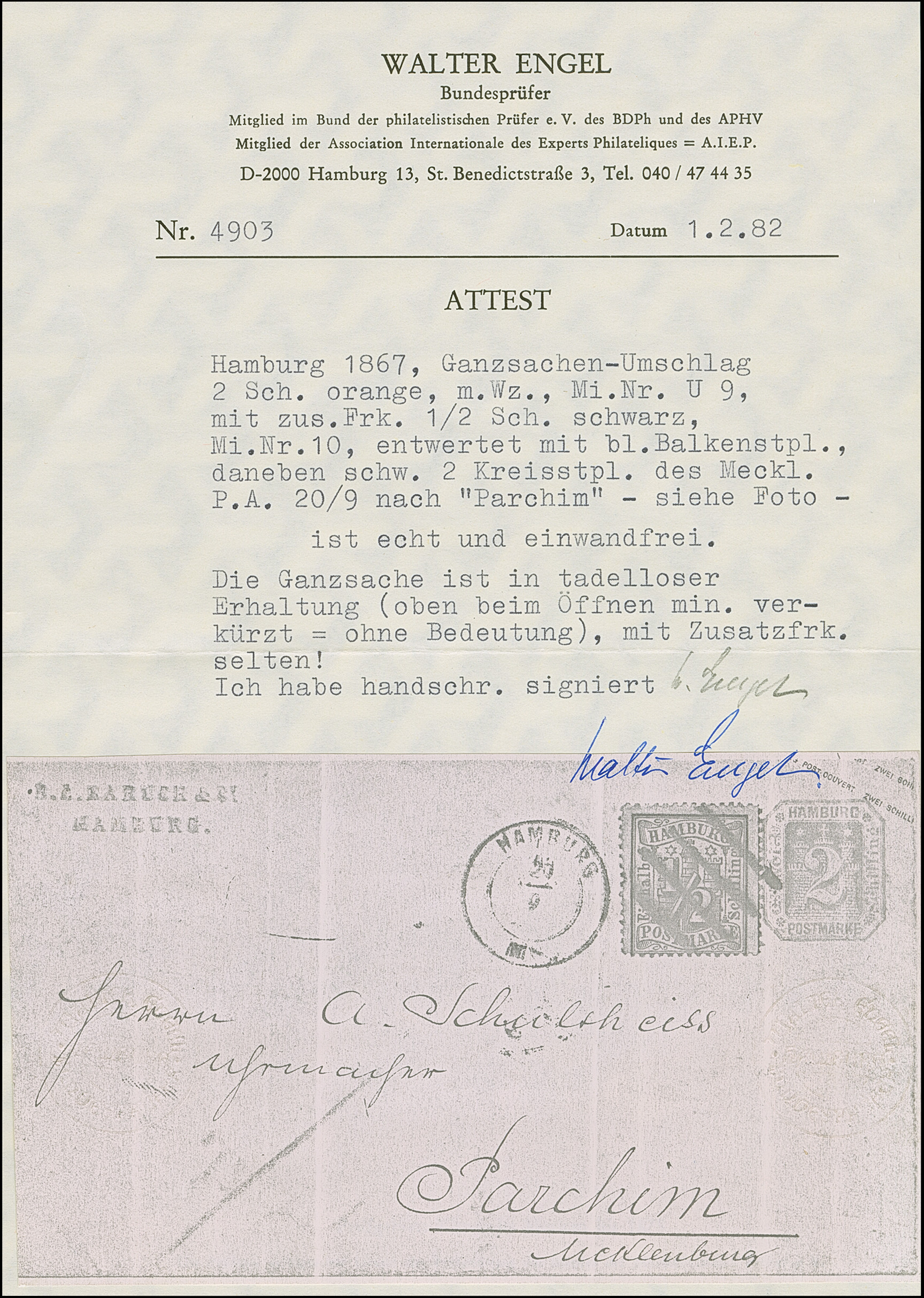 Umschlag 2 Sch. mit Zufrankatur ½ Sch., mit blauem Strichstempel und nebengesetztem Mecklenburger DKr. "HAMBURG 29/9" nach Parchim, mit Durchgangsstempel das Stadtpostamtes. Eine recht seltene Kombination. Attest Engel BPP (1982)