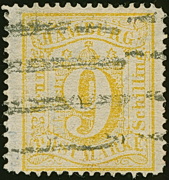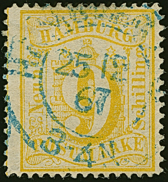 9 Sch. orangegelb, farbfrisch und gut gezähnt, sauber entwertet durch blauen Dkr.“HAMBURG ST.P.2 12 67”. Winzige Hinterlegung, sonst einwandfrei. Signiert Grobe