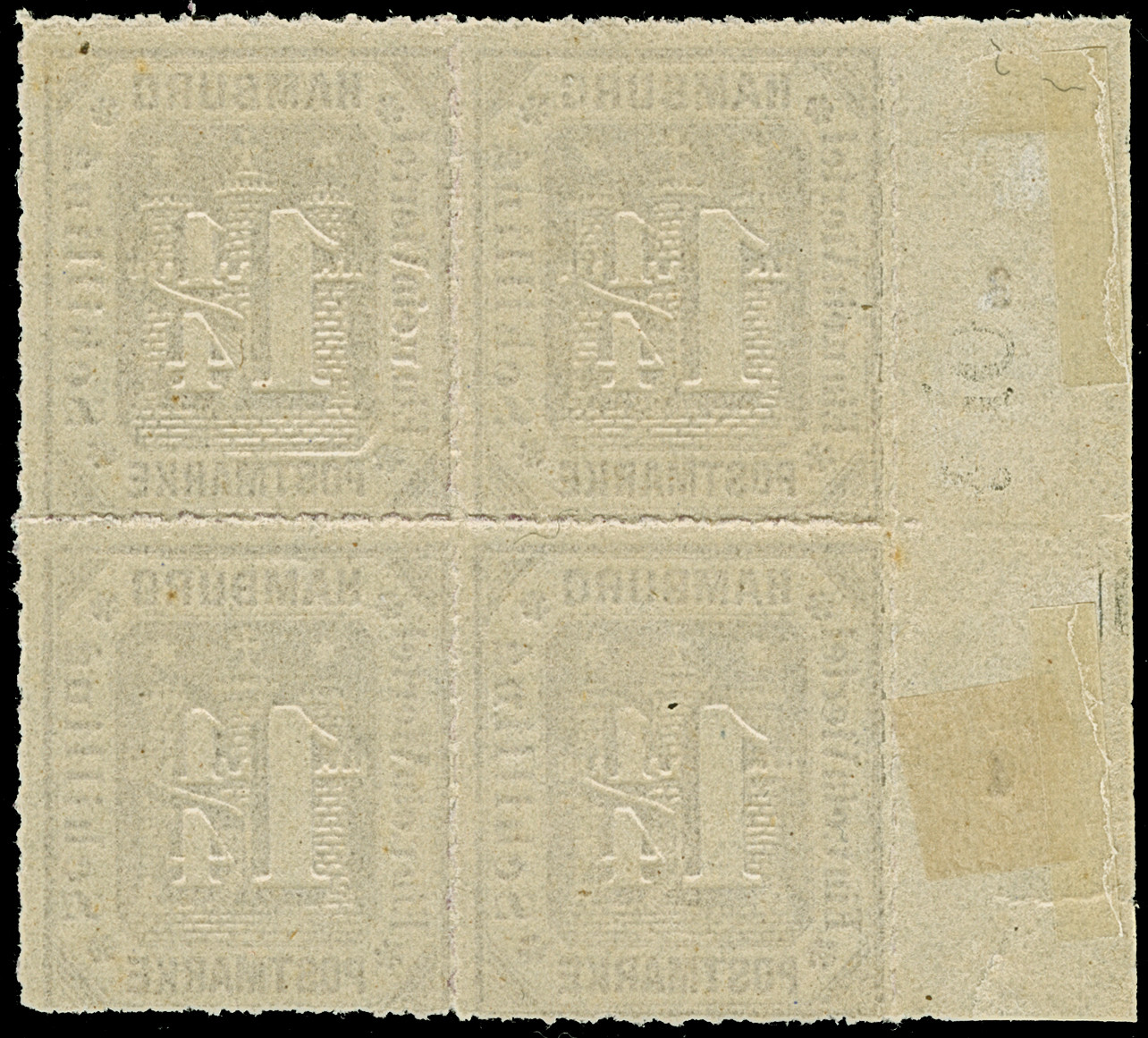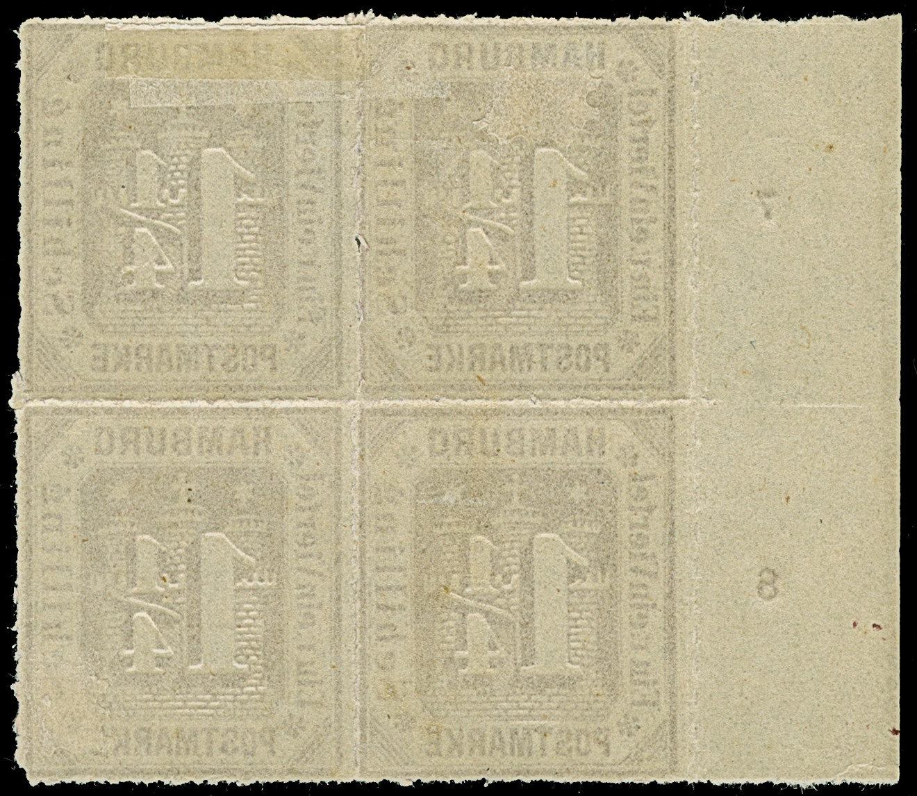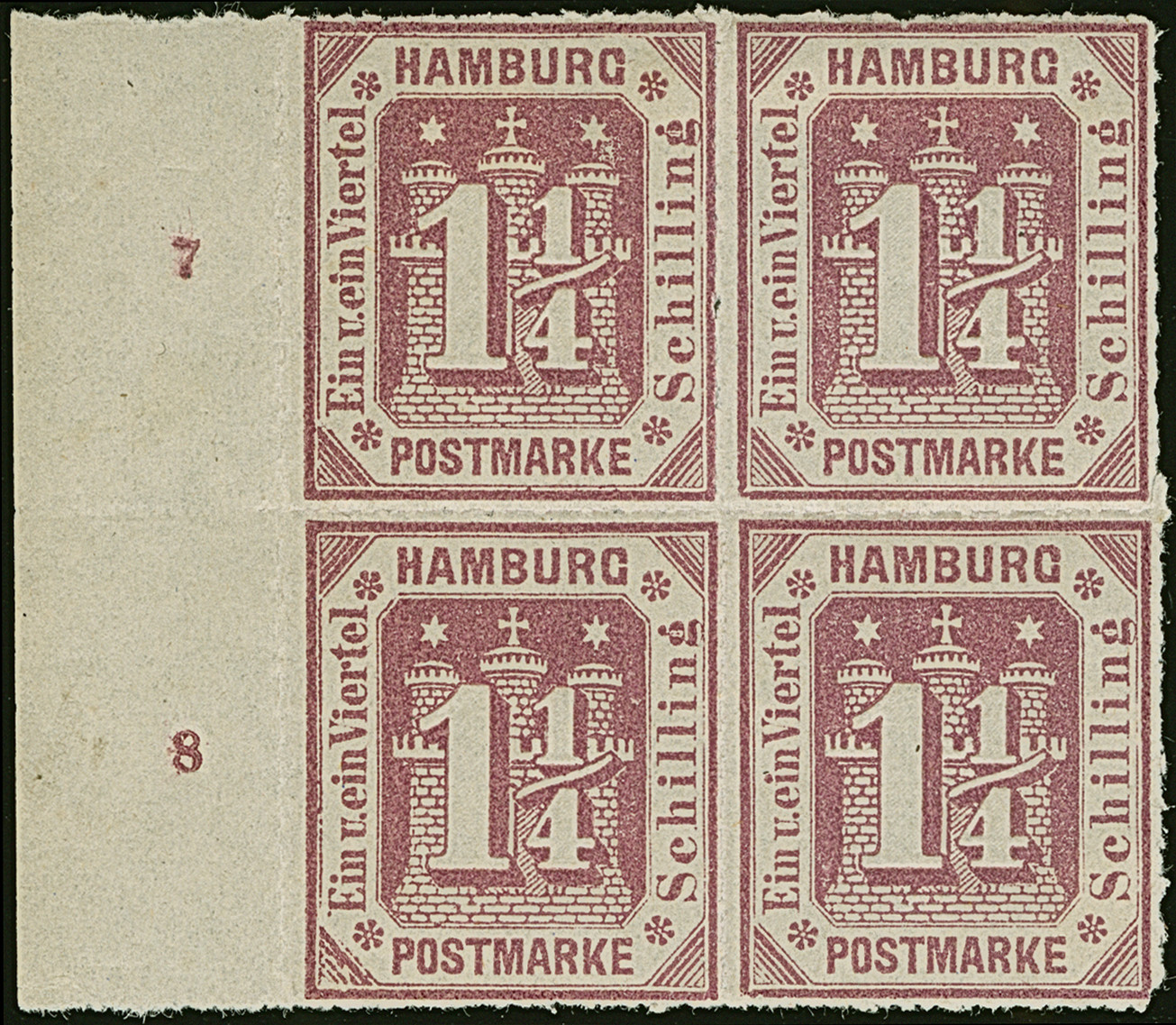 1866, 11⁄4 Sch. grauviolett im 4er-Block vom linken Bogenrand mit Reihenzählern “7” und “8”, ungebraucht mit Originalgummi