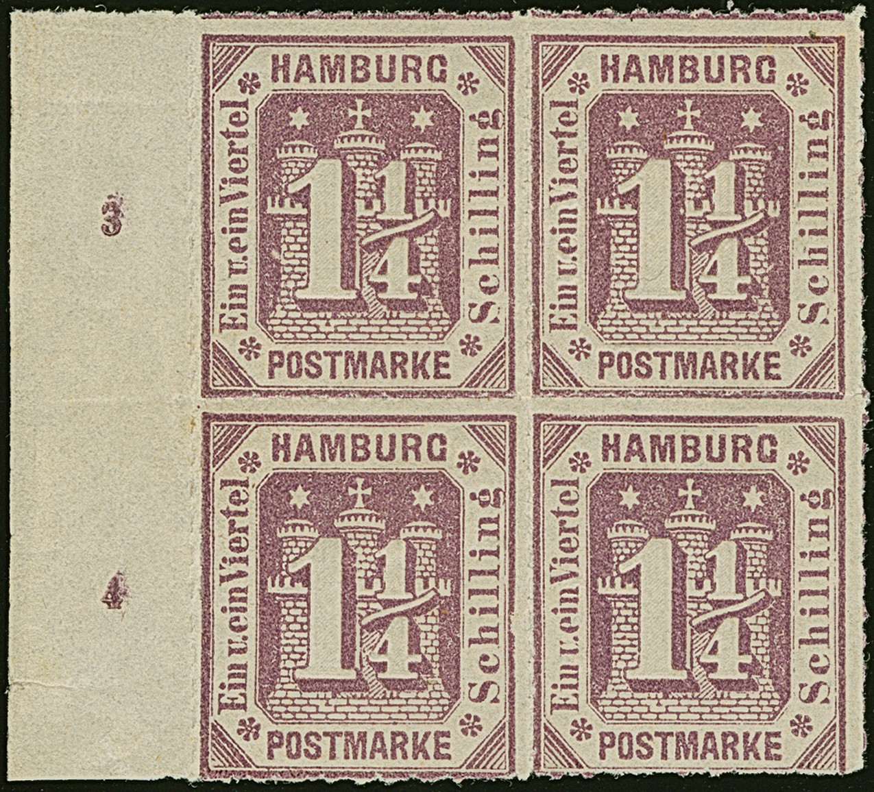 1866, 11⁄4 Sch. grauviolett im 4er-Block vom linken Bogenrand, Reihenzähler “3” und “4”, ungebraucht mit Originalgummi