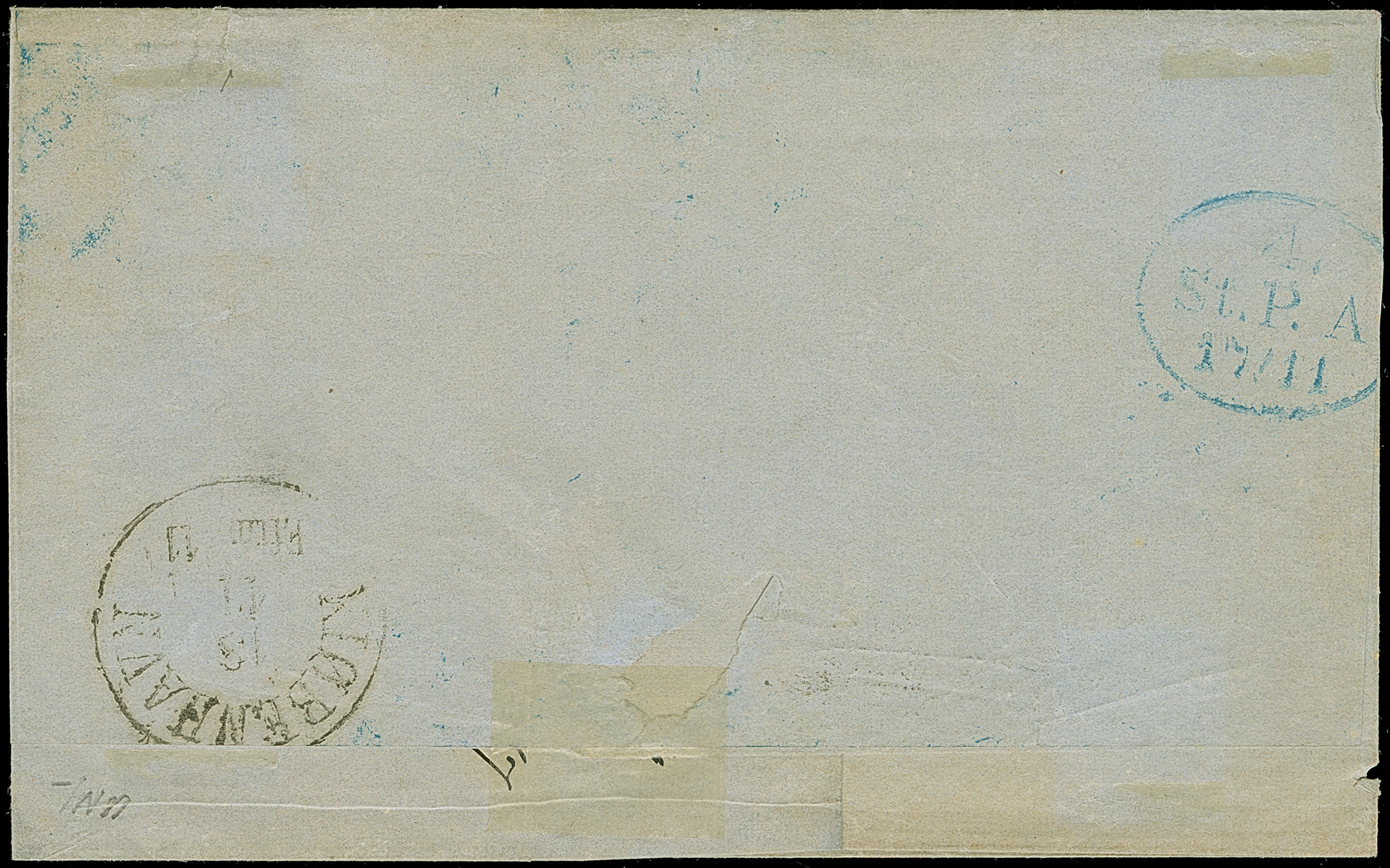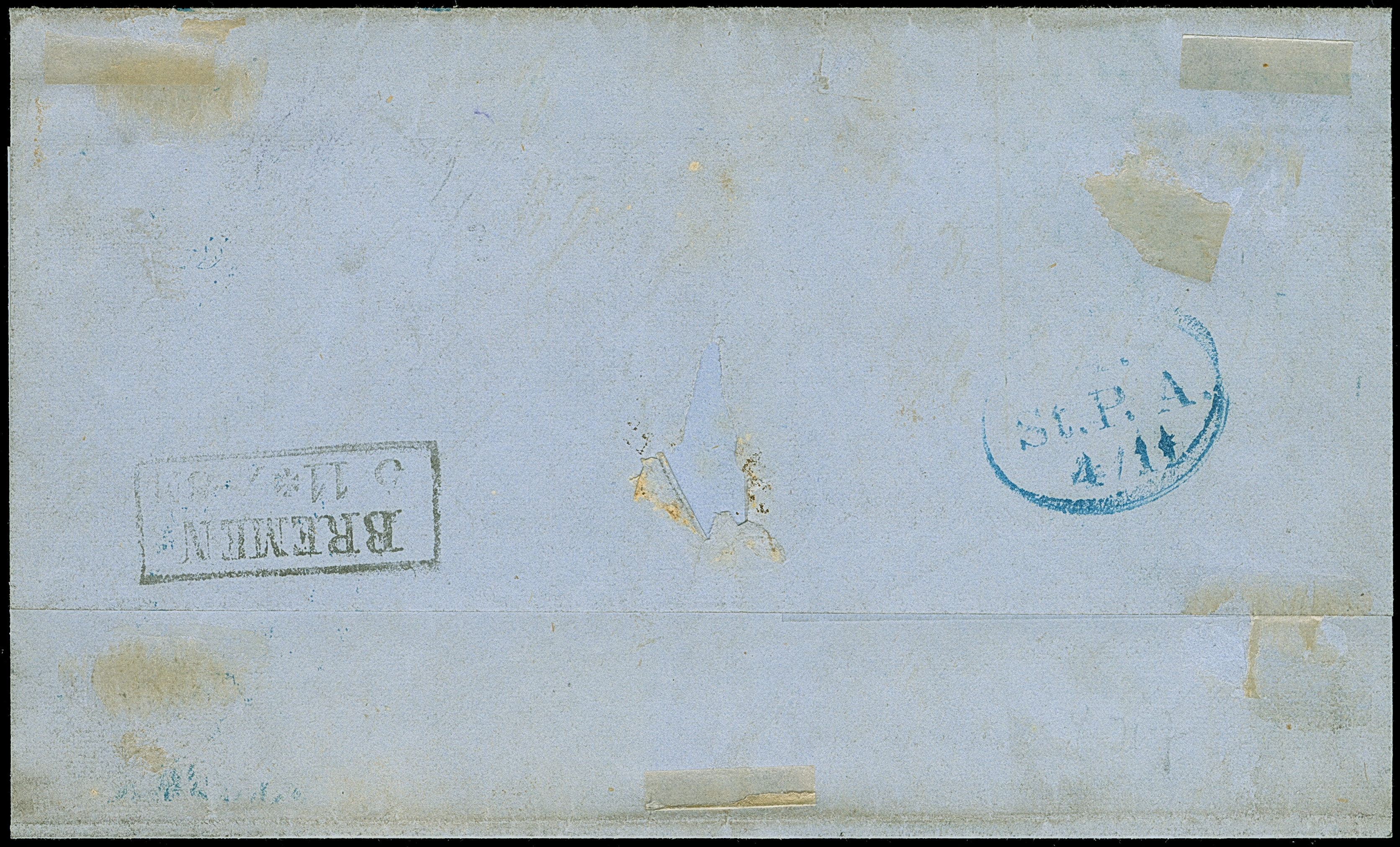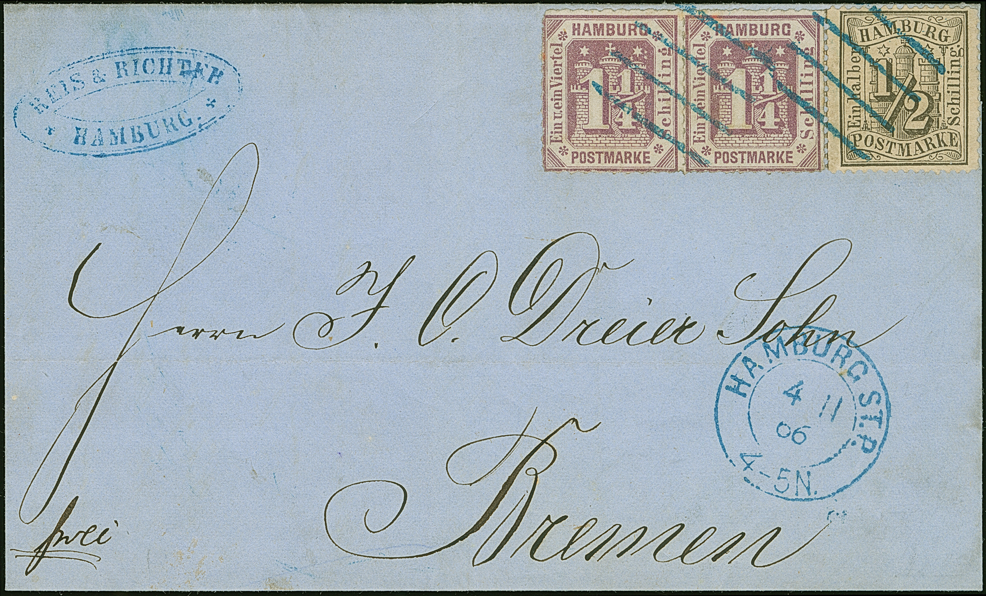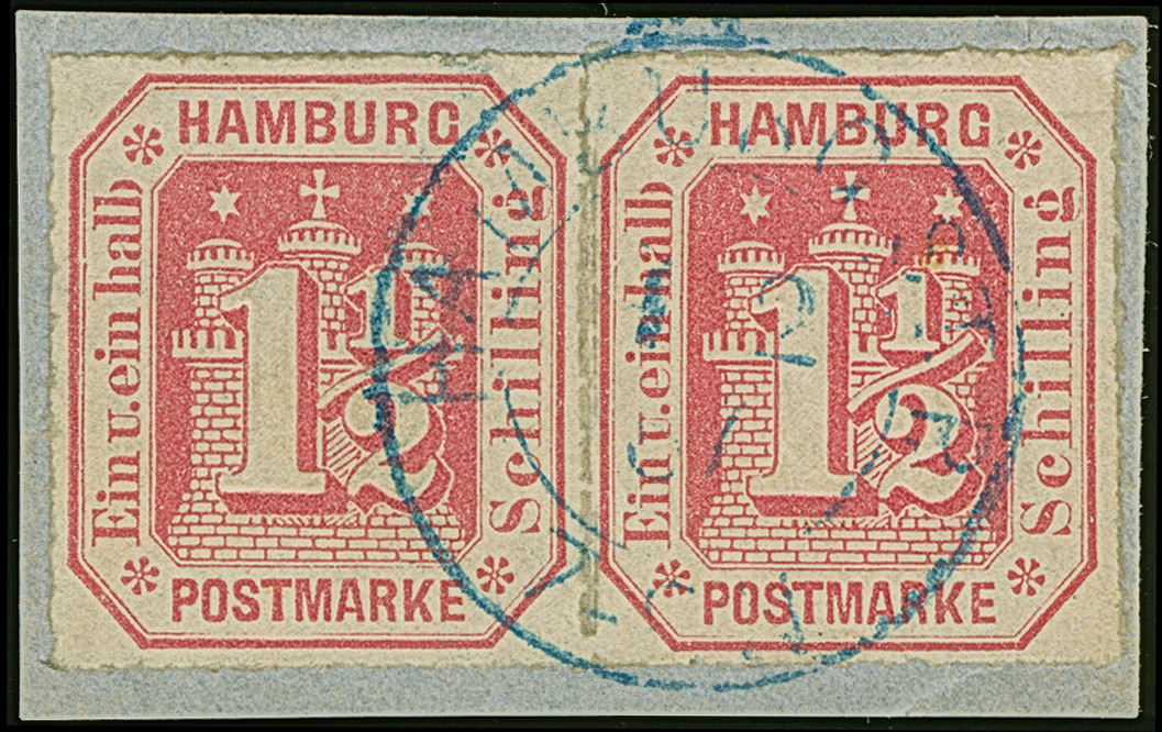 1¼ Sch. grauviolett im waagerechten Paar, farbfrisch und gut durchstochen, zusammen mit 1 Sch. schwarz, mit blauem Strichstempel und nebengesetztem “HAMBURG ST.P. 4 11 66” auf Briefhülle nach Bremen. Eine sehr seltene Frankaturkombination; PROFI hat nur 2 weitere registriert.