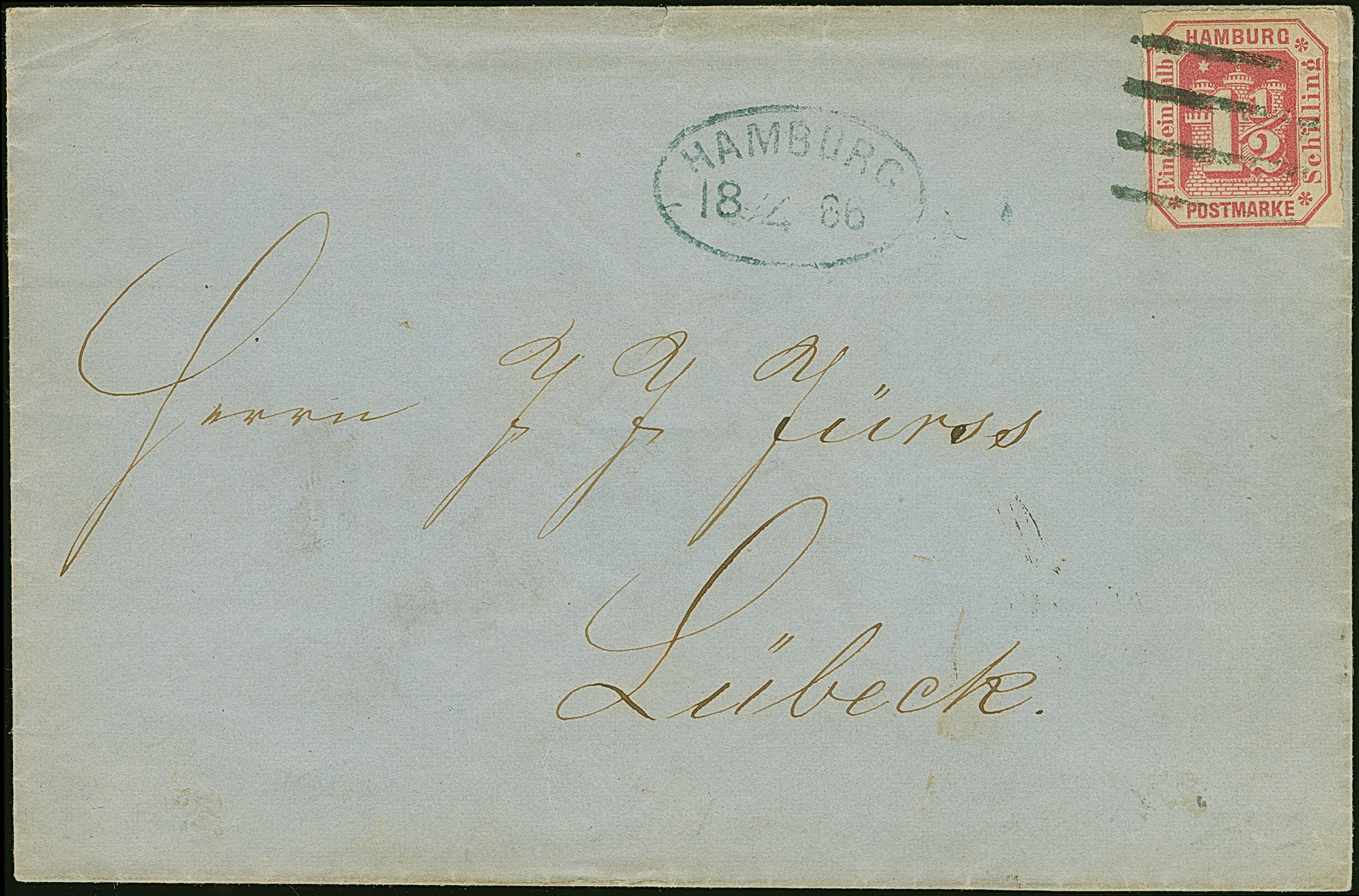 11⁄2 Sch. rosakarmin, farbfrisch und gut durchstochen, mit schwarzem Strichstempel und nebengesetztem Ovalstempel “HAMBURG 18/4 66” auf Briefhülle nach Lübeck.