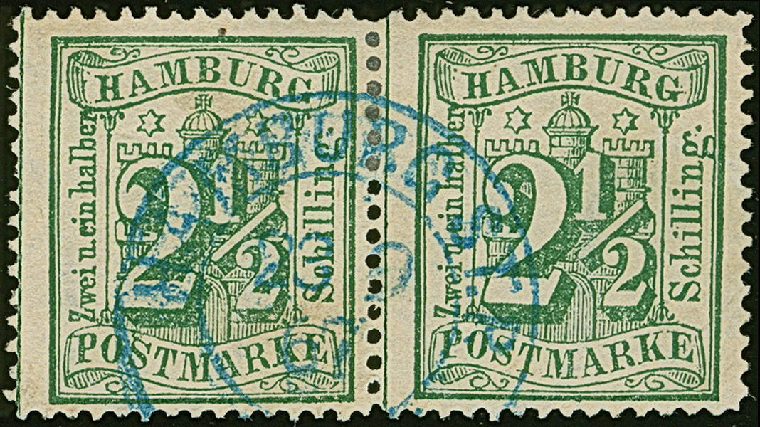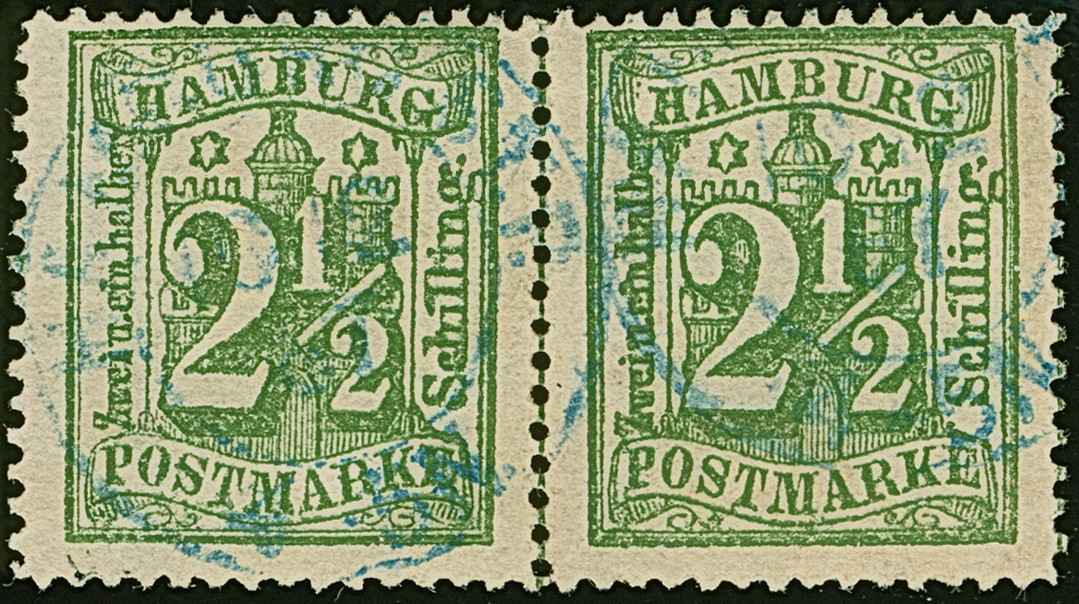 2½ Sch. dunkelolivgrün im waagerechten Paar, sauber entwertet durch blauen DKr. “HAMBURG ST.P. 23 9 67”