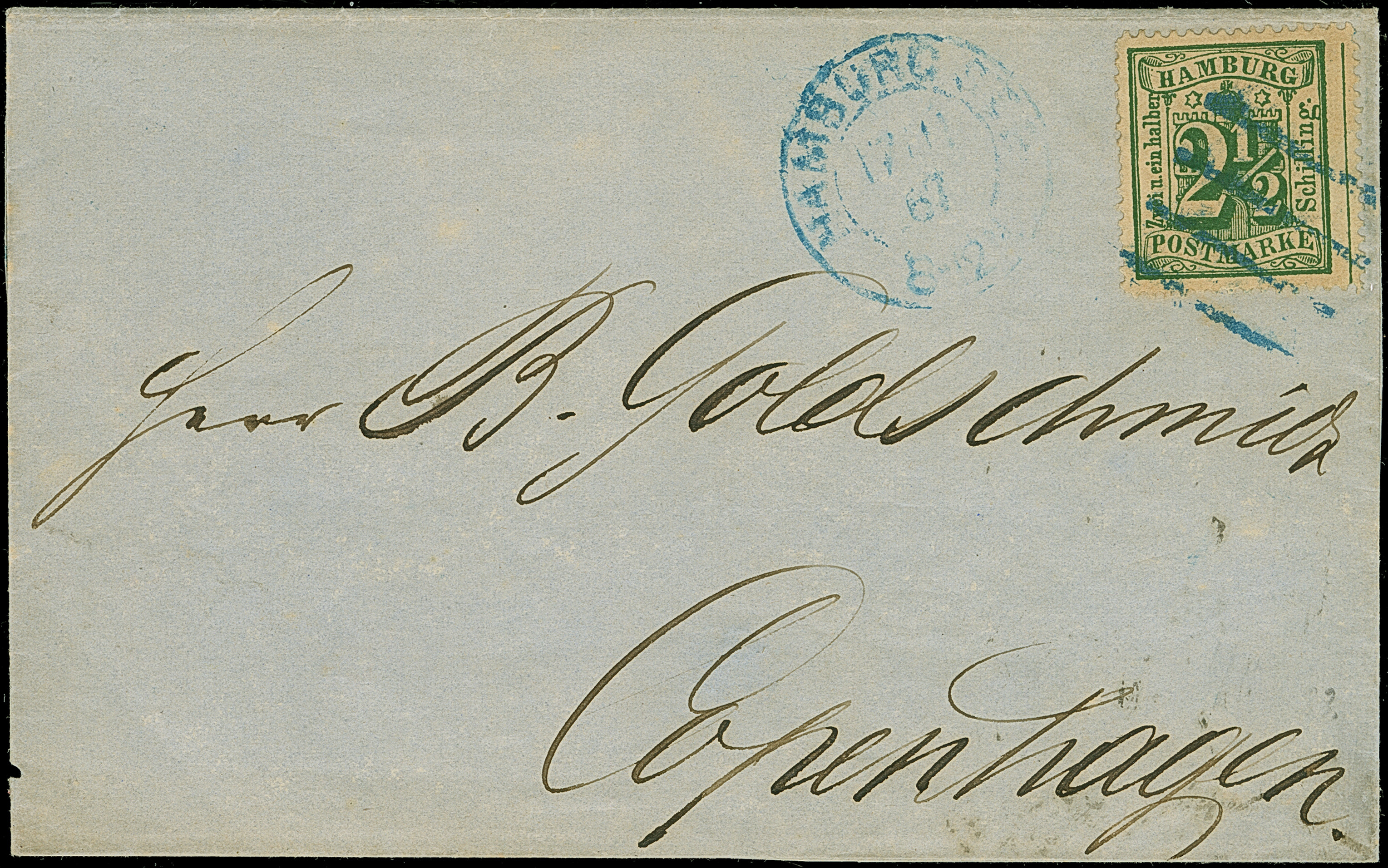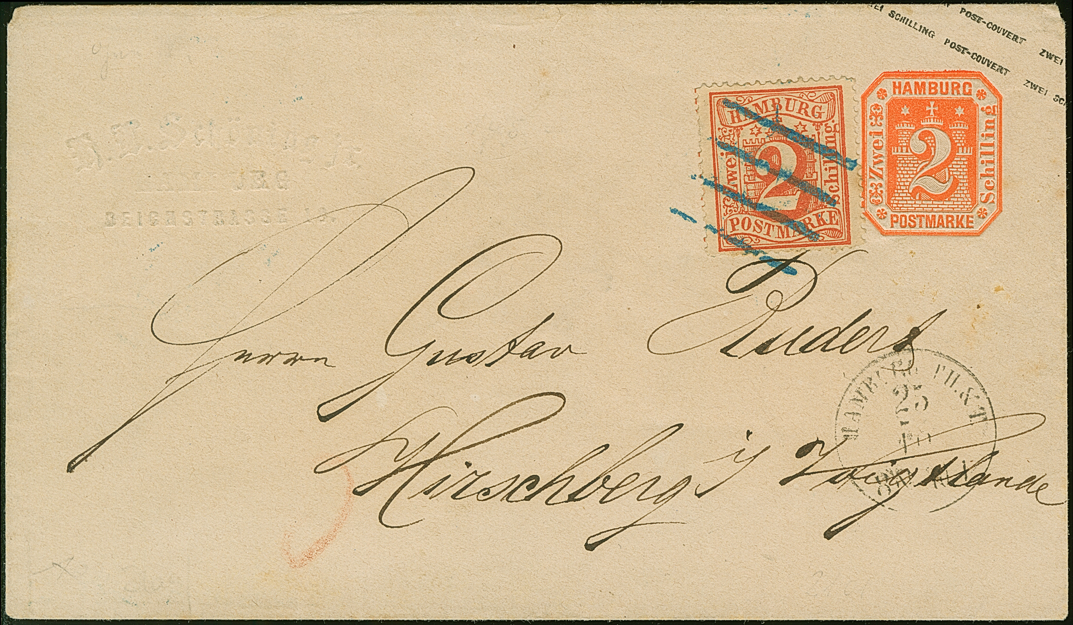 Umschlag 2 Sch. mit wertstufengleicher Zufrankatur, mit blauem Strichstempel und nebengesetztem EKr. "HAMBURG TH.&T. 25/10" (1866) nach Hirschberg in Sachsen. Eine seltene Kombinationsfrankatur in sehr schöner Erhaltung.