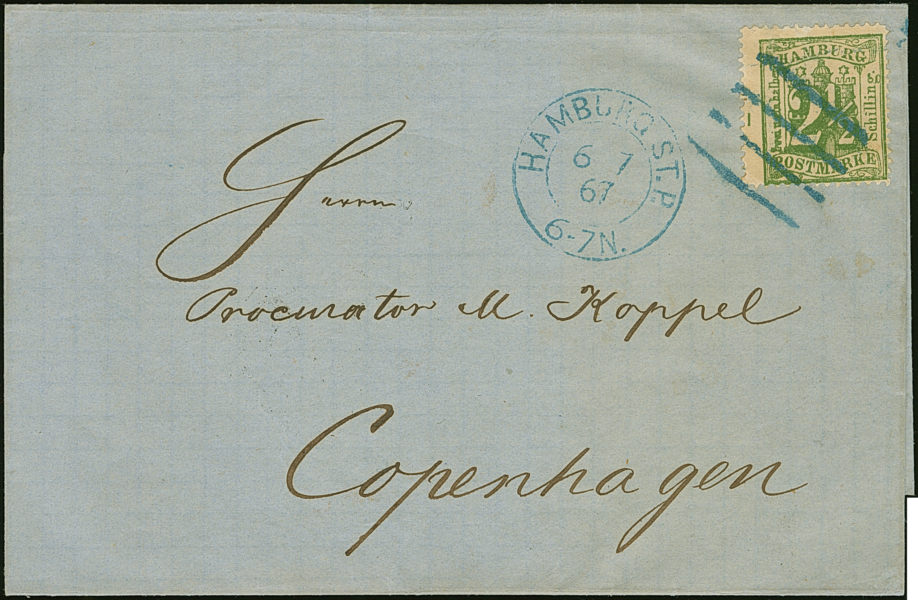 2½ Sch. dunkelolivgrün mit blauem Strichstempel und nebengesetztem DKr. “HAMBURG ST.P. 17/11 67” auf Briefhülle nach Kopenhagen.