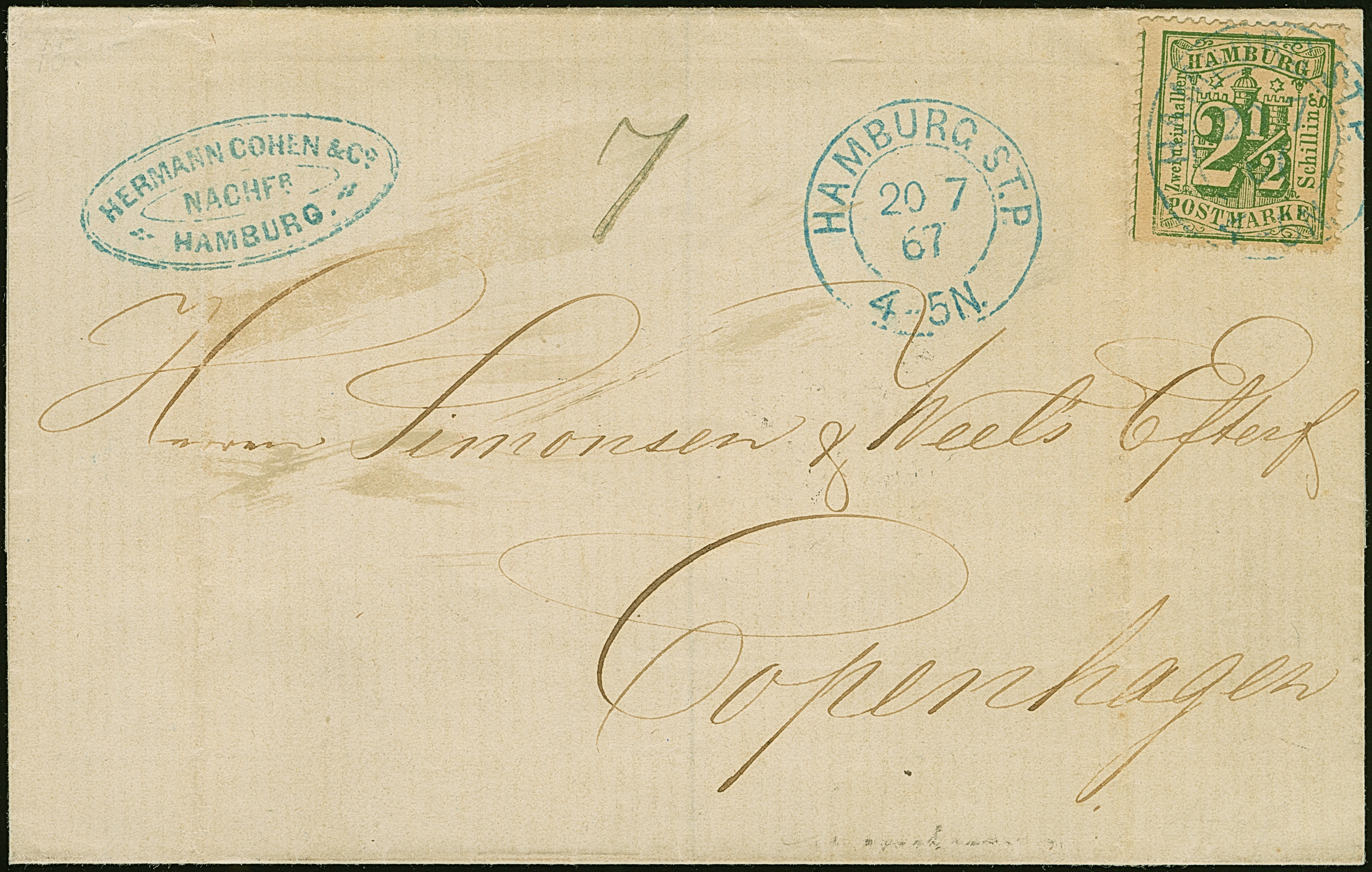 2½ Sch. dunkelolivgrün mit auf- und nebengesetztem blauem DKr. “HAMBURG ST.P. 20/7 67” auf Briefhülle nach Kopenhagen.