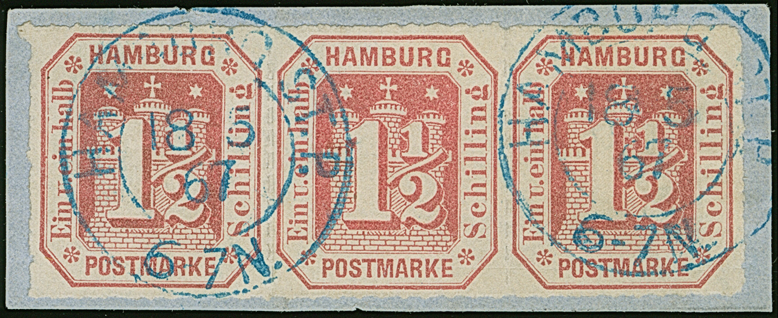 1½ Sch. rosakarmin im waagerechten 3er-Streifen, farbfrisch und einwandfrei durchstochen, mit klarem blauen DKr. “HAMBURG ST.P. 18/5 67” auf Briefstück. schwache Druckspur im unteren Bereich. Eine schöne und seltene Einheit.
