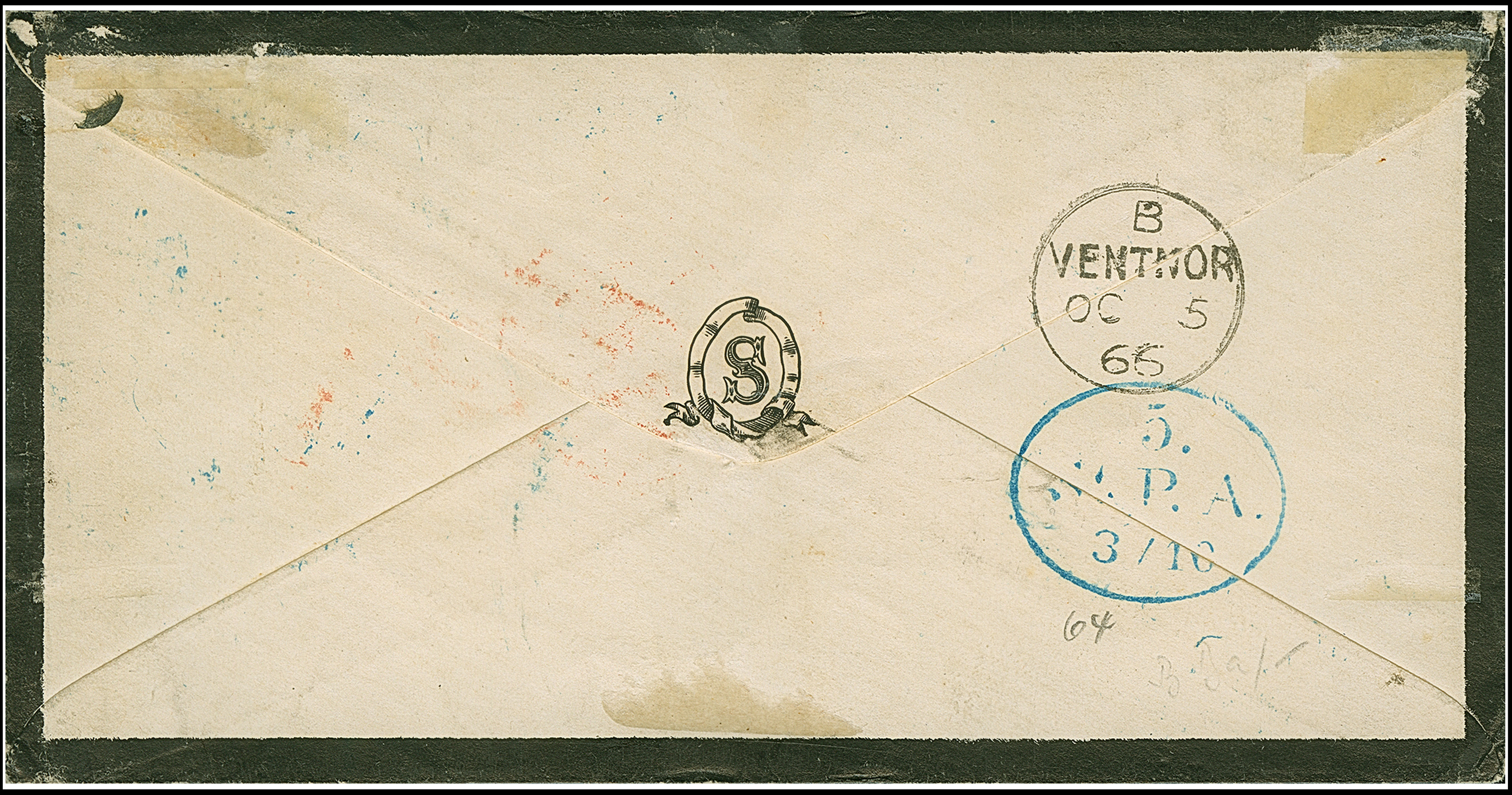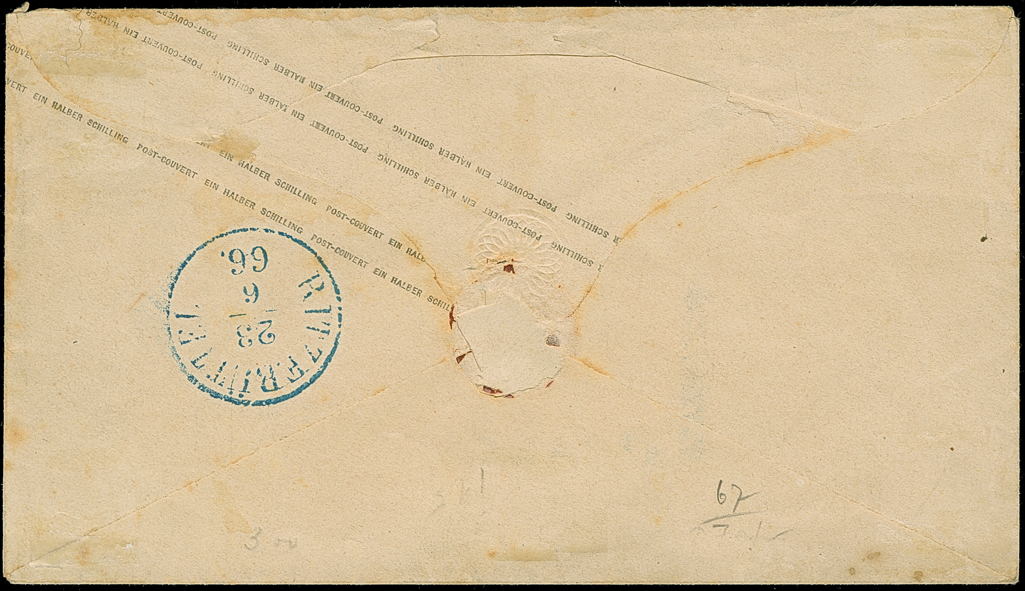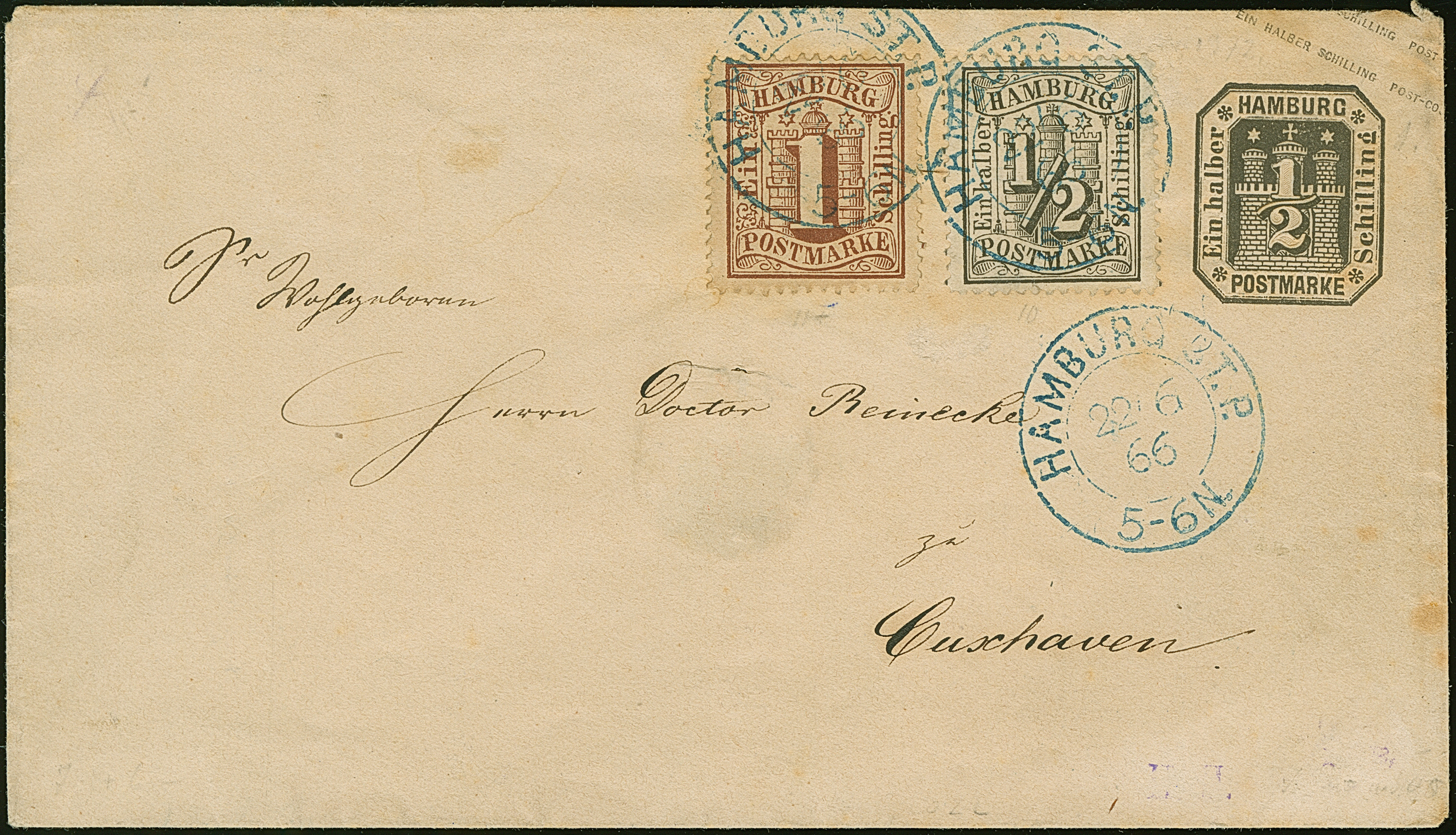 Umschlag ½ Sch. mit Zufrankatur ½ Sch. schwarz und 1 Sch. braun, mit blauem DKr. "HAMBURG ST. P. 22/6 66"nach Cuxhaven, mit Ankunftsstempel von Ritzebüttel. Der Umschlag kleiner Papierbruch und gering fleckig; die ½ Sch. unten kleiner Randspalt und oben rechts kleine Ergänzung. Eine wohl einmalige und attraktive Kombination.