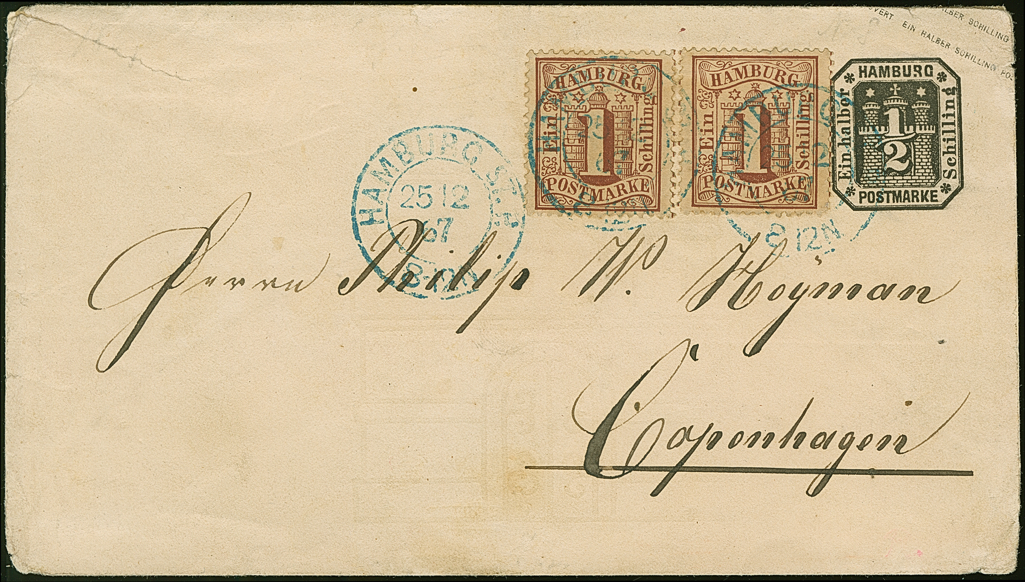 Umschlag ½ Sch. mit Zufrankatur von 2 Einzelwerten 1 Sch. braun, mit blauem DKr. "HAMBURG ST. P. 25/12 67" nach Kopenhagen, mit Ankunftsstempel. Umschlag ganz leichte Beförderungsspuren, oben links unauffälliger Einriss. Eine seltene Kombination.